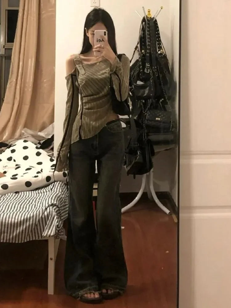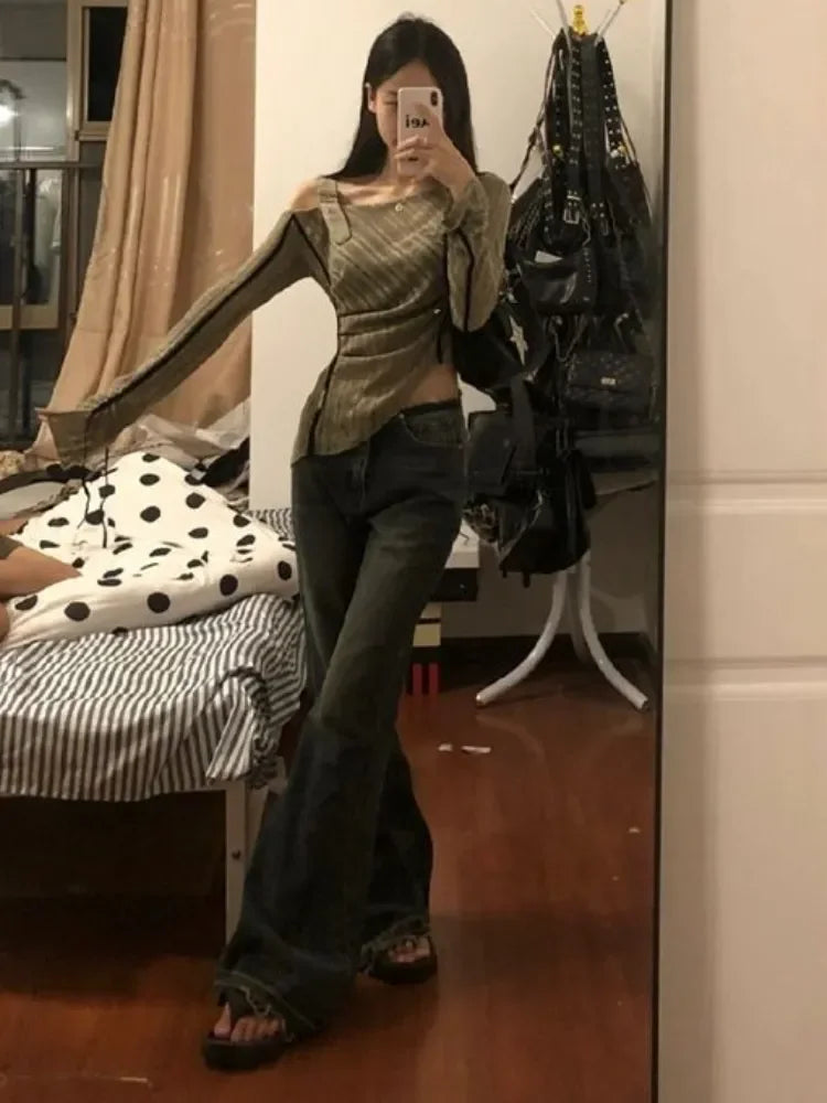 Getadme-봄 가을 그런지 패션 오프숄더 티셔츠 스트리트웨어 슬림 할로우 아웃 니트 탑 여성 패치워크 2k 에스테틱 티셔츠