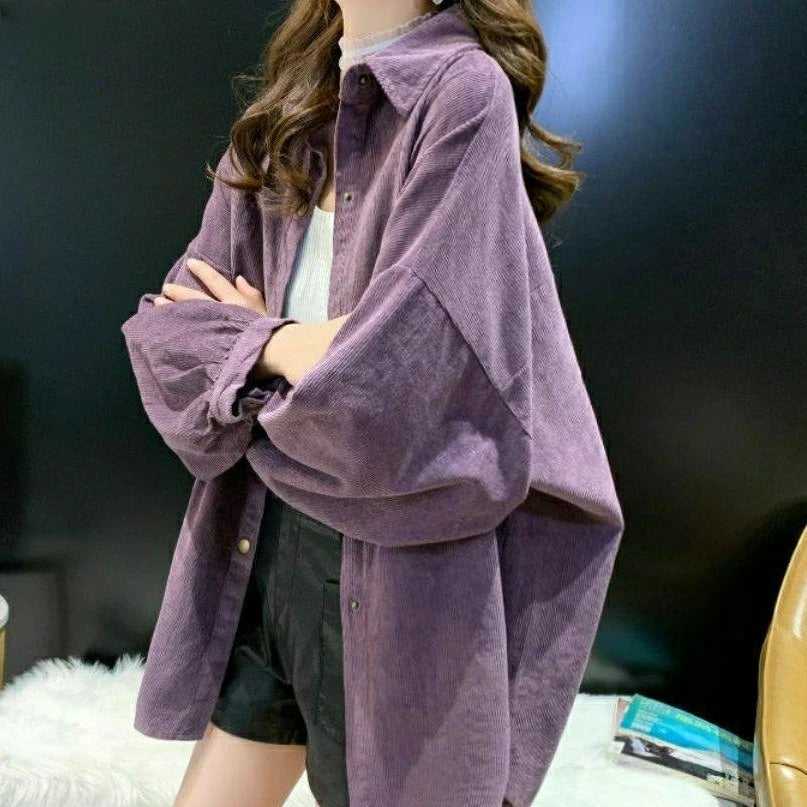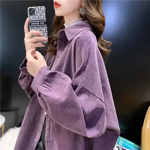 Getadme-가을 여성 셔츠 & 블라우스 싱글 브레스티드 코듀로이 셔츠 한국 스타일 옷 루즈 탑 레이지 랜턴 슬리브 캐주얼 여성 상의