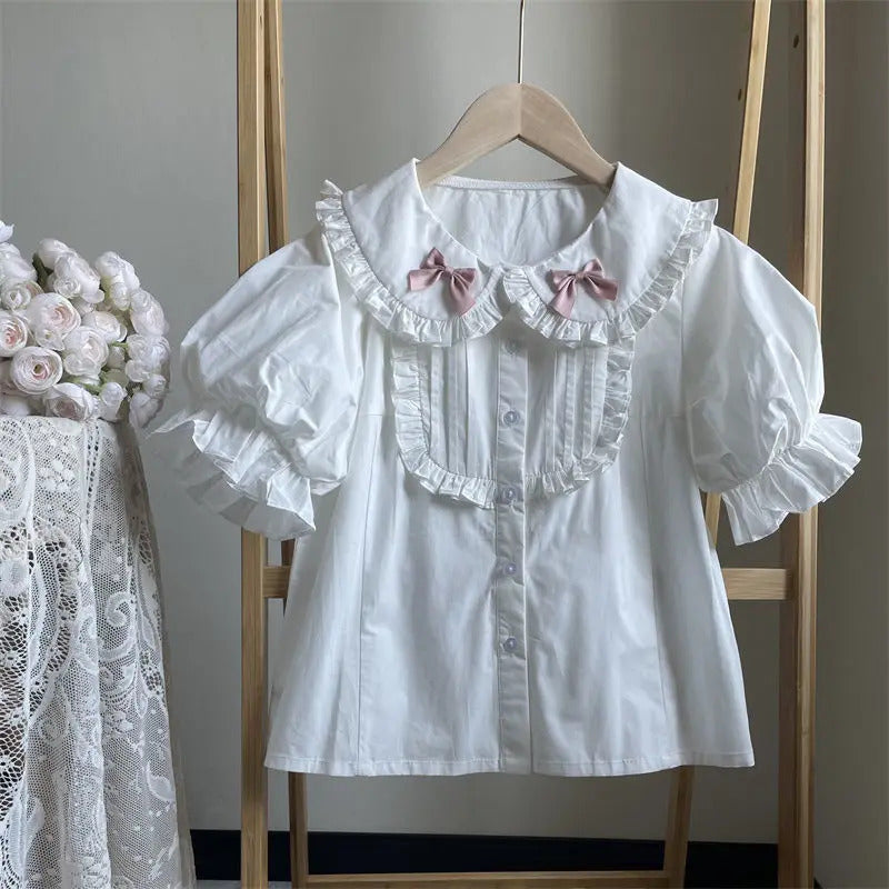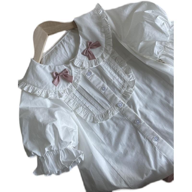 GETADME-일본식 귀여운 화이트 로리타 블라우스 여성 스위트 리본 러플 코튼 탑 여름 소녀 프레피 스타일 퍼프 반팔 귀여운 셔츠