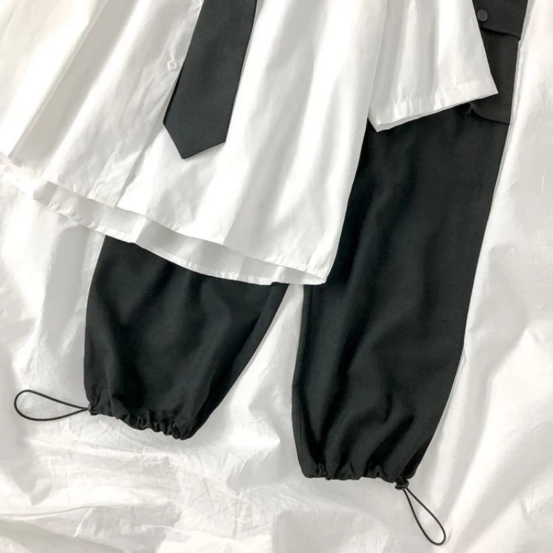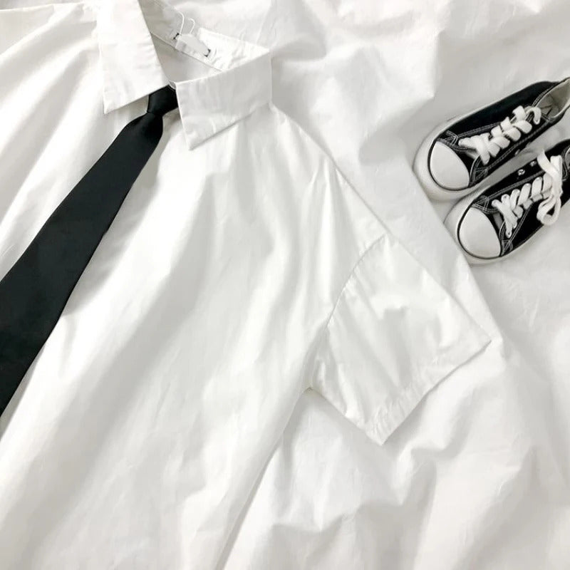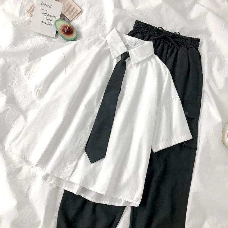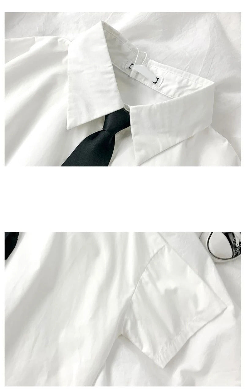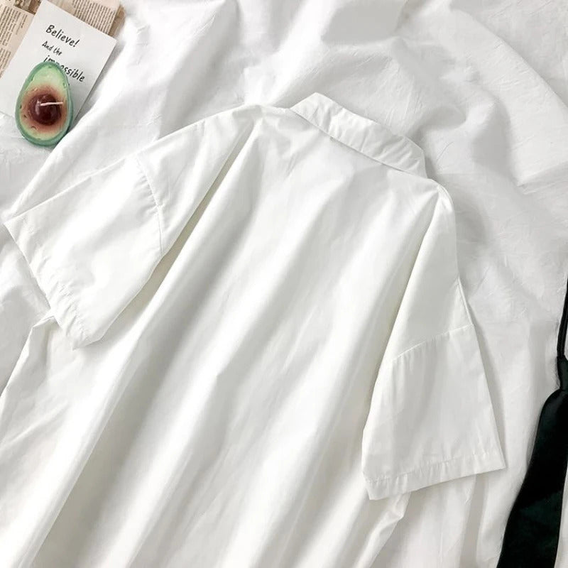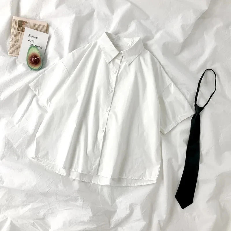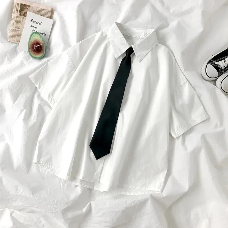 GETADME 화이트 셔츠 여성 패션 블랙 타이 일본 스타일 프레피 학생 JK 걸스 블라우스 심플 솔리드 루즈 여름 버튼업 상의 신상품