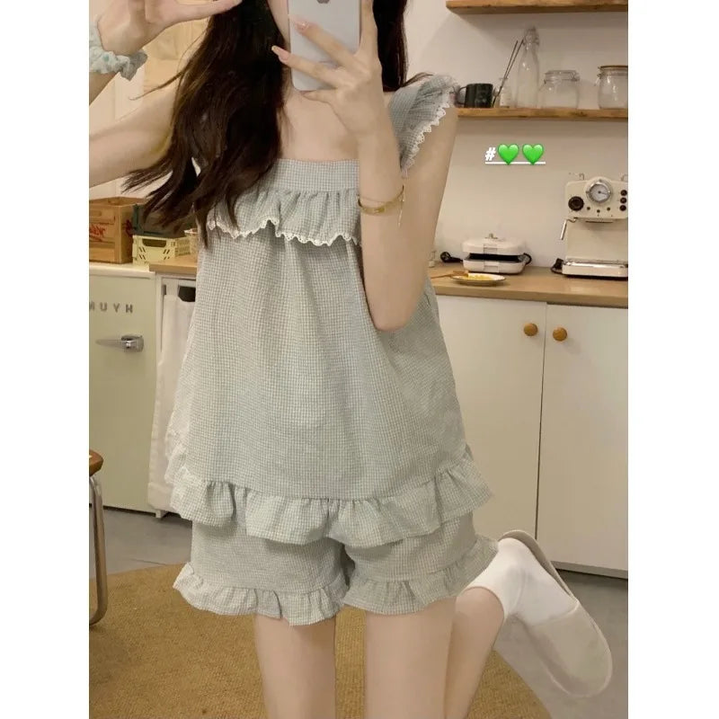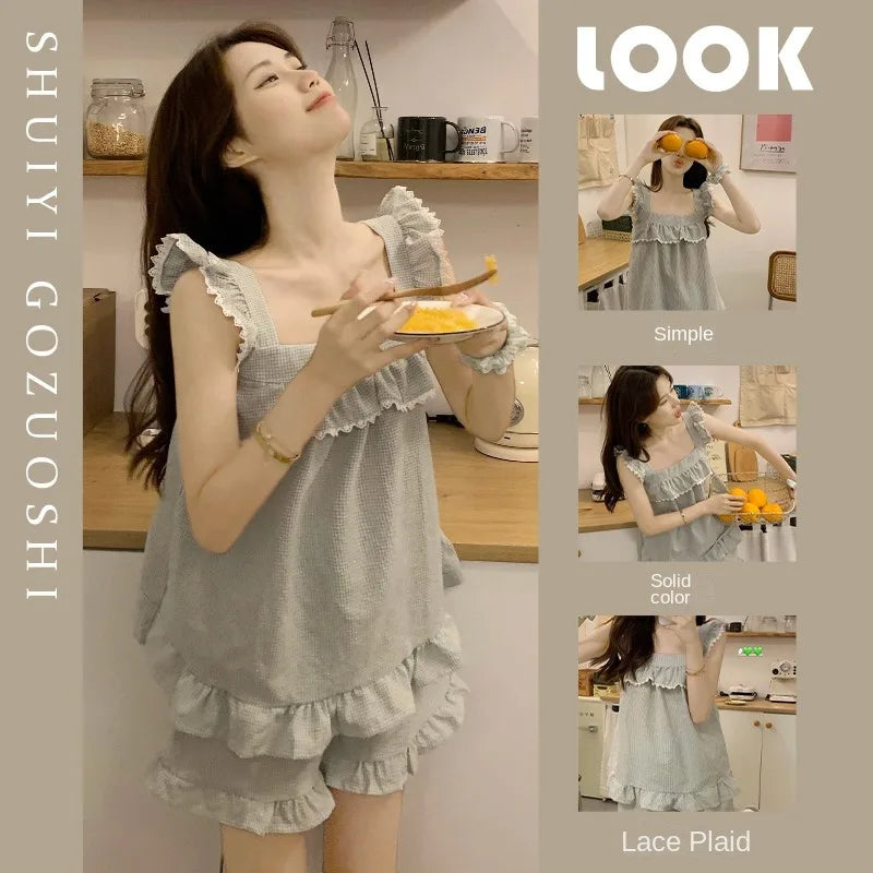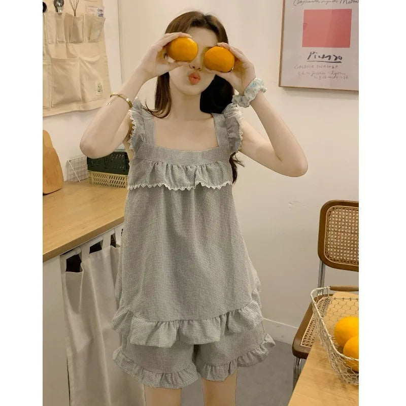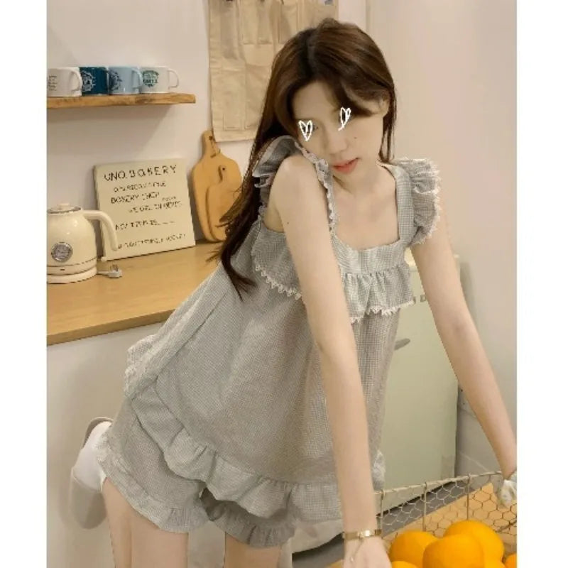 GETADME 섹시 나이트웨어 민소매 파자마 레이스 플레드 퓨어 디자이어 윈드 캐미솔 반바지 여성 홈웨어 투피스 그레이 잠옷 라운지웨어