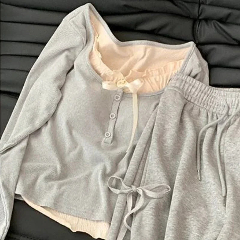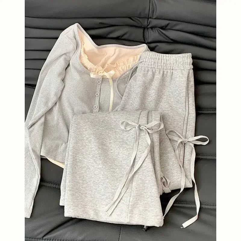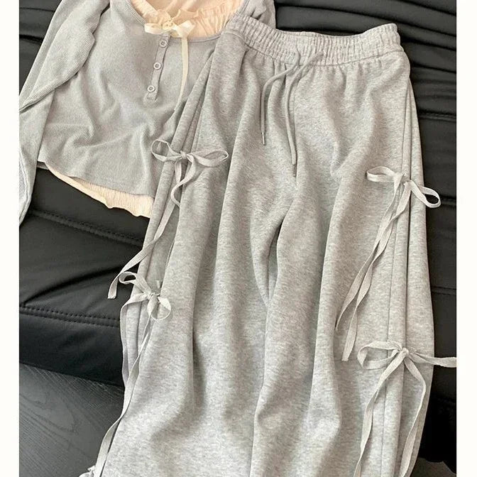 Getadme 봄 가을 시즌 새로운 리본 디자인 하이 웨이스트 슬림 핏 와이드 레그 팬츠 투피스 세트 다재다능한 캐주얼 그레이 여성 세트