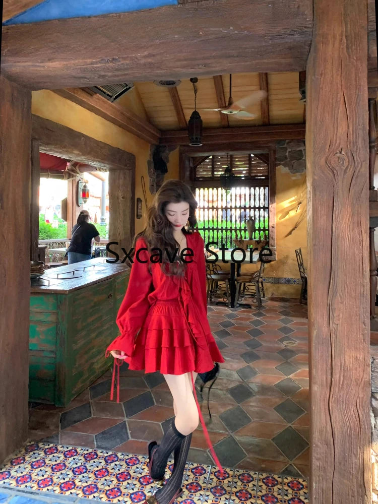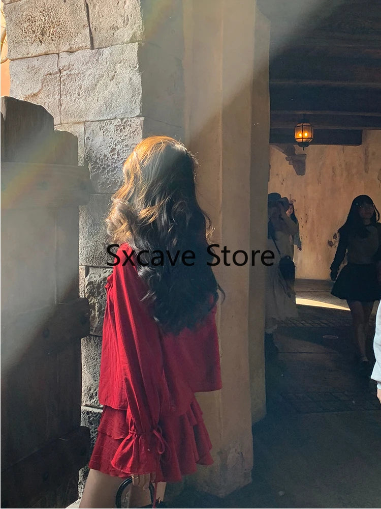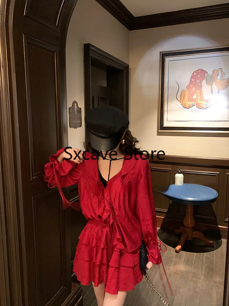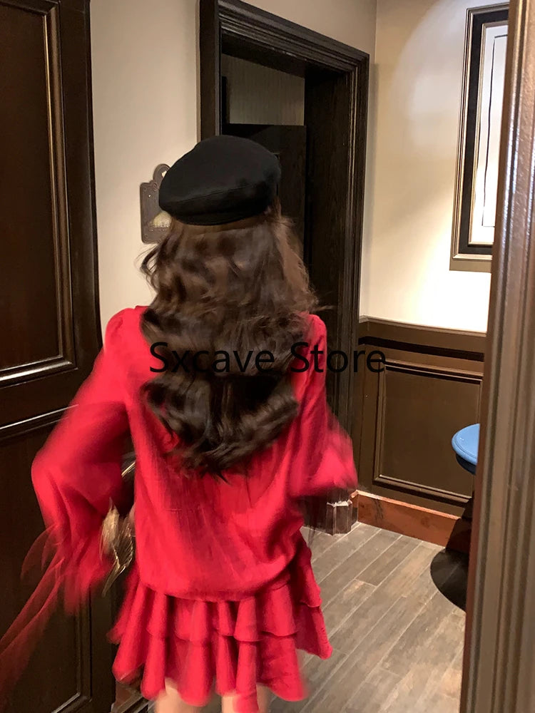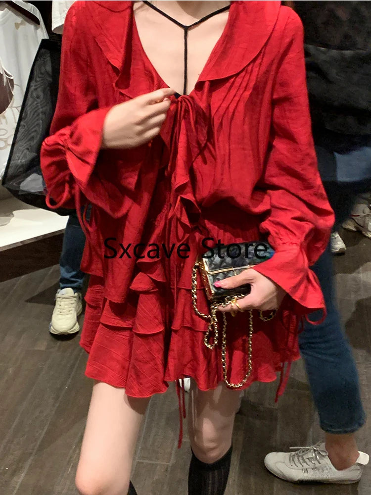 GETADME 2024 가을 레드 2피스 드레스 세트 여성 캐주얼 V넥 Y2K 크롭탑 + 미니스커트 파티복 한국 스타일 패션 정장