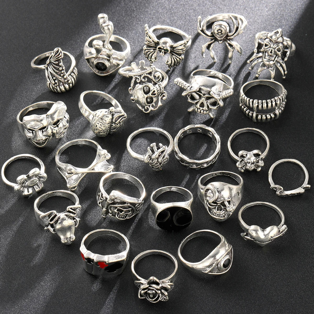 GETADME 24개 세트 고딕 반지 세트 (여성용, 남성용) 패션 광대 얼굴 악마 미소 얼굴 패턴 반지 펑크 할로윈 주얼리 선물