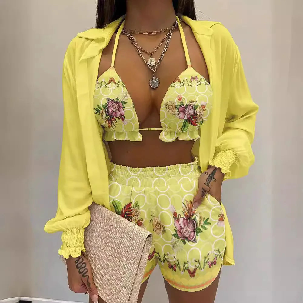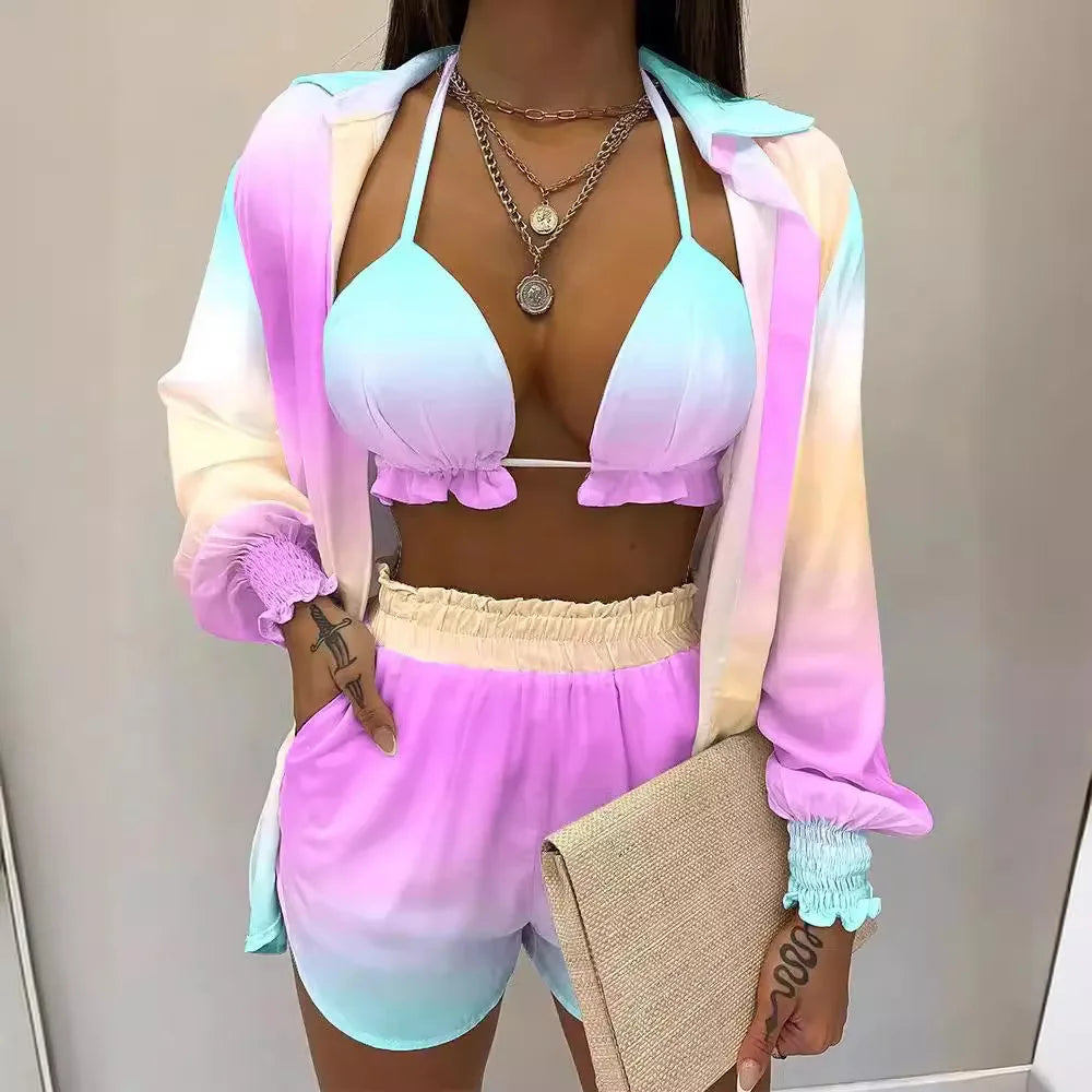 GETADME 보헤미안 여성 3피스 세트 여름 신상품 여성 의류 섹시 3피스 슈트 비치 패션 반바지 슈트 캐주얼 편안함