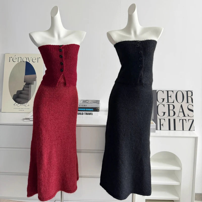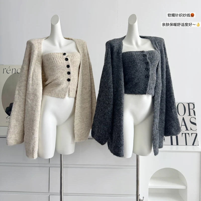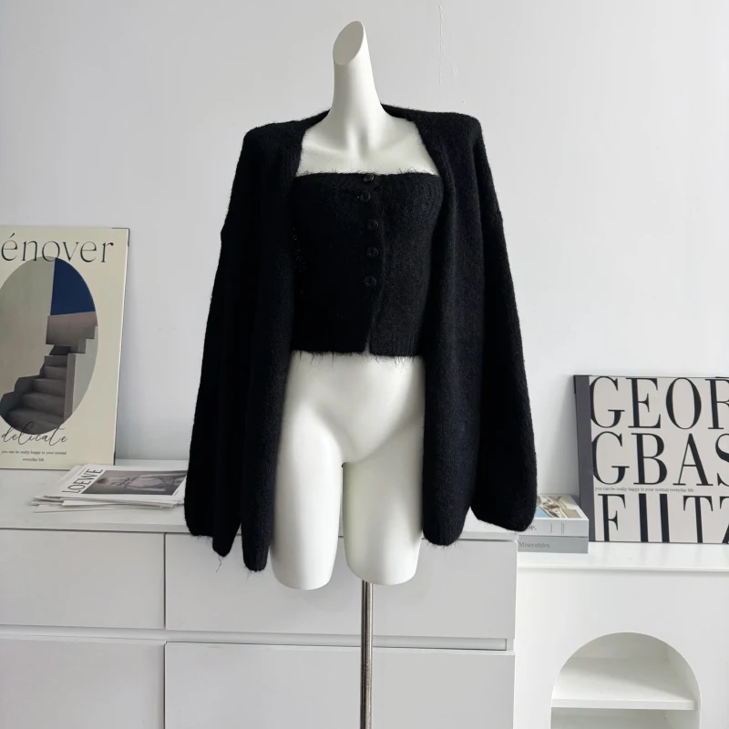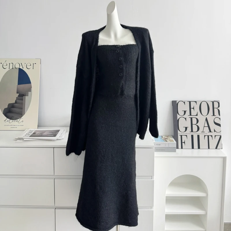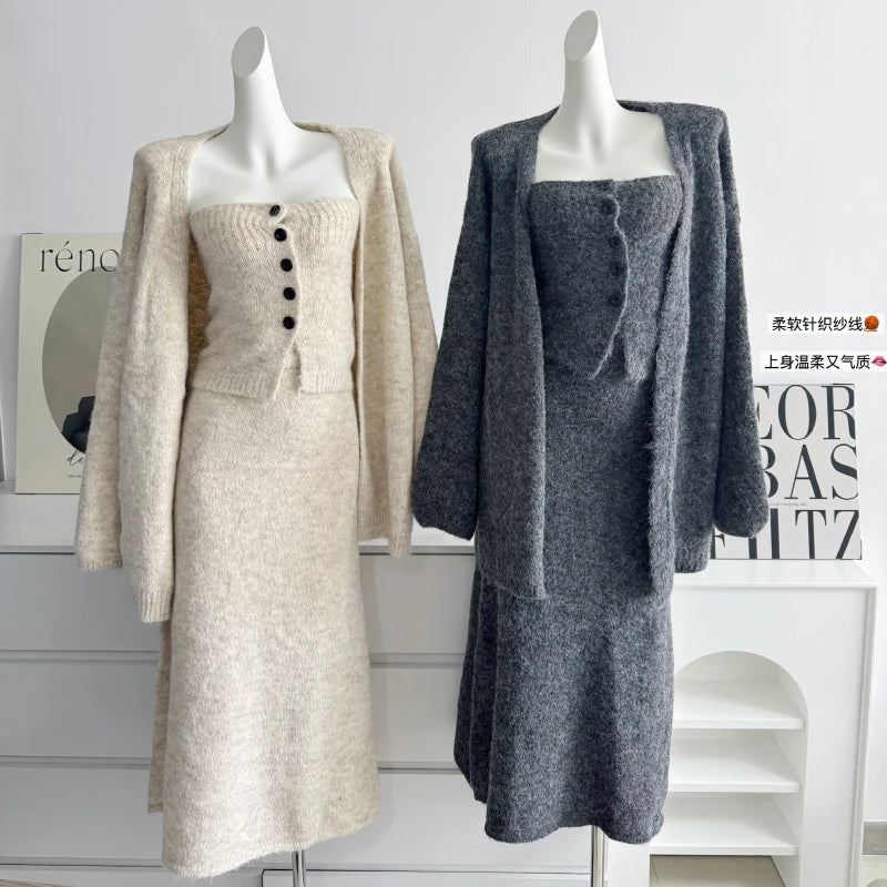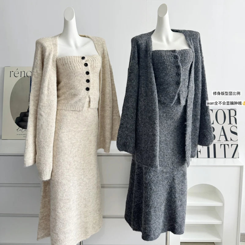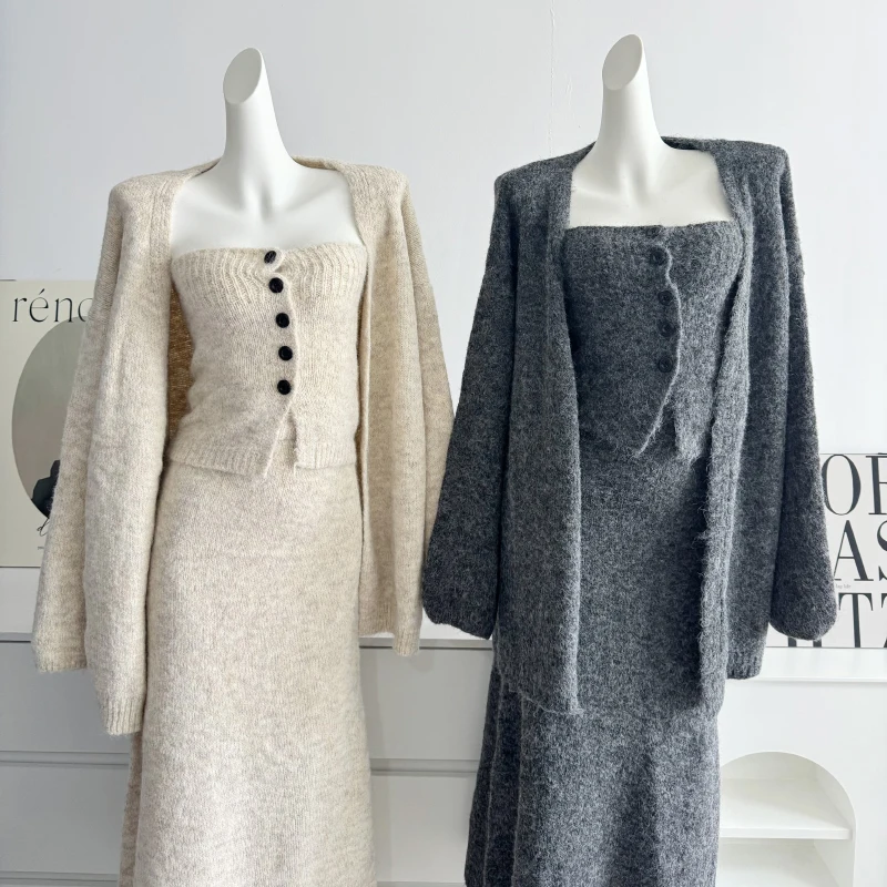 GETADME 보몬 레트로 프린세스 3피스 여성 의류 가을 겨울 신상품 한국 버전 가슴 탑 니트 카디건 스커트 슈트