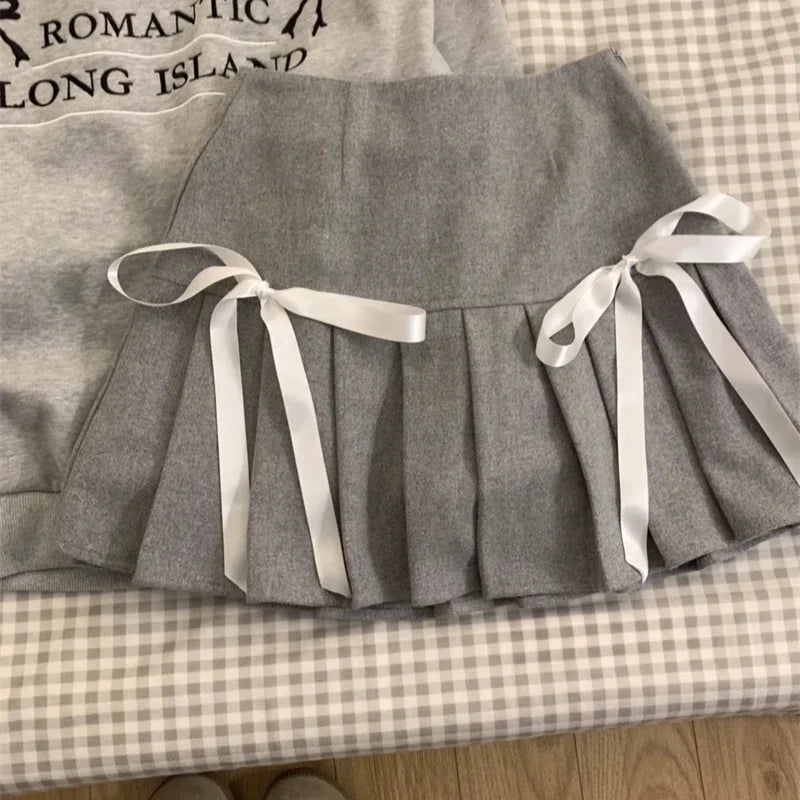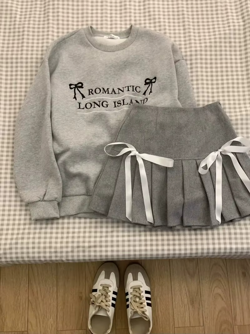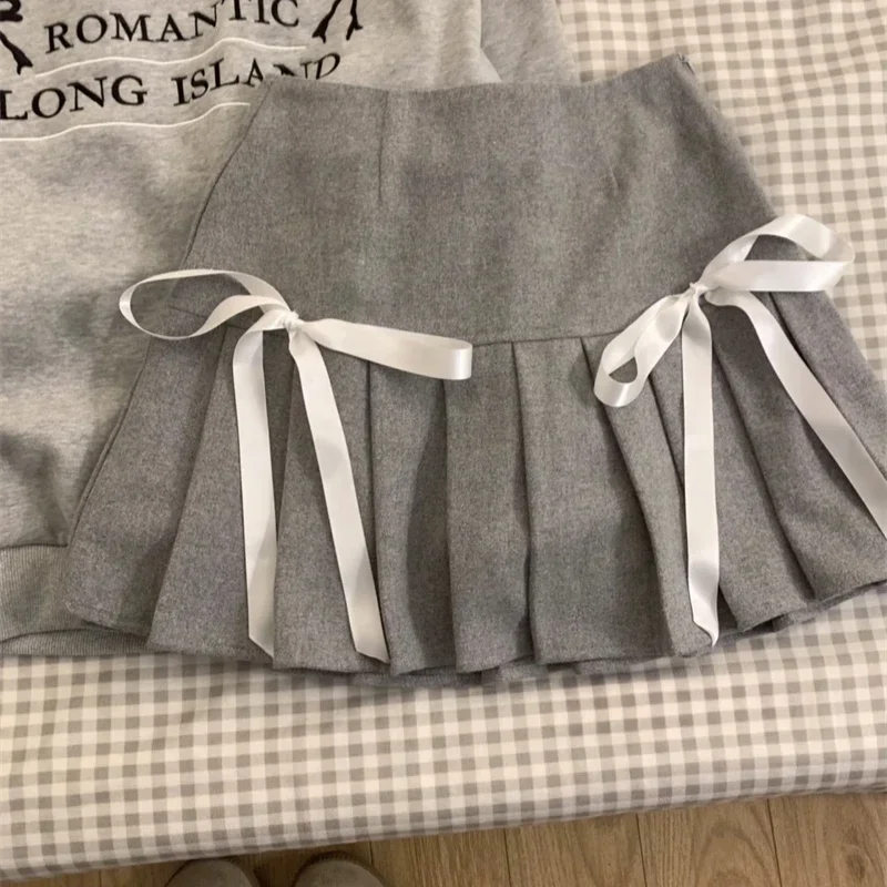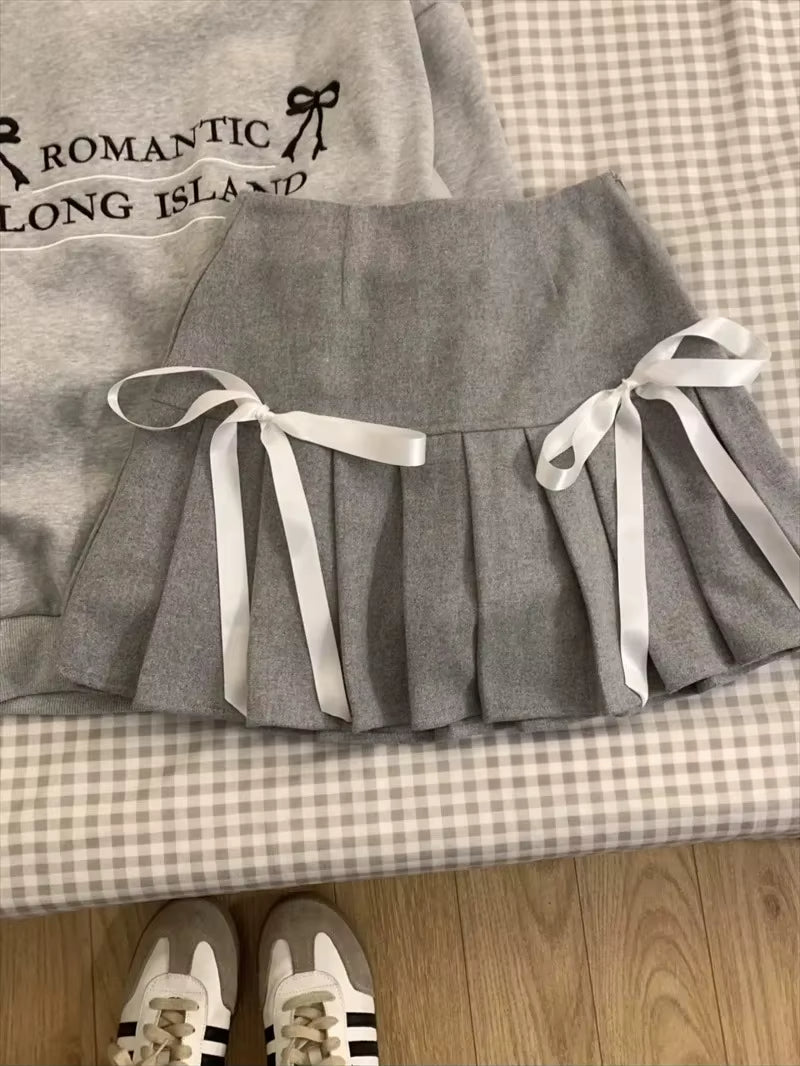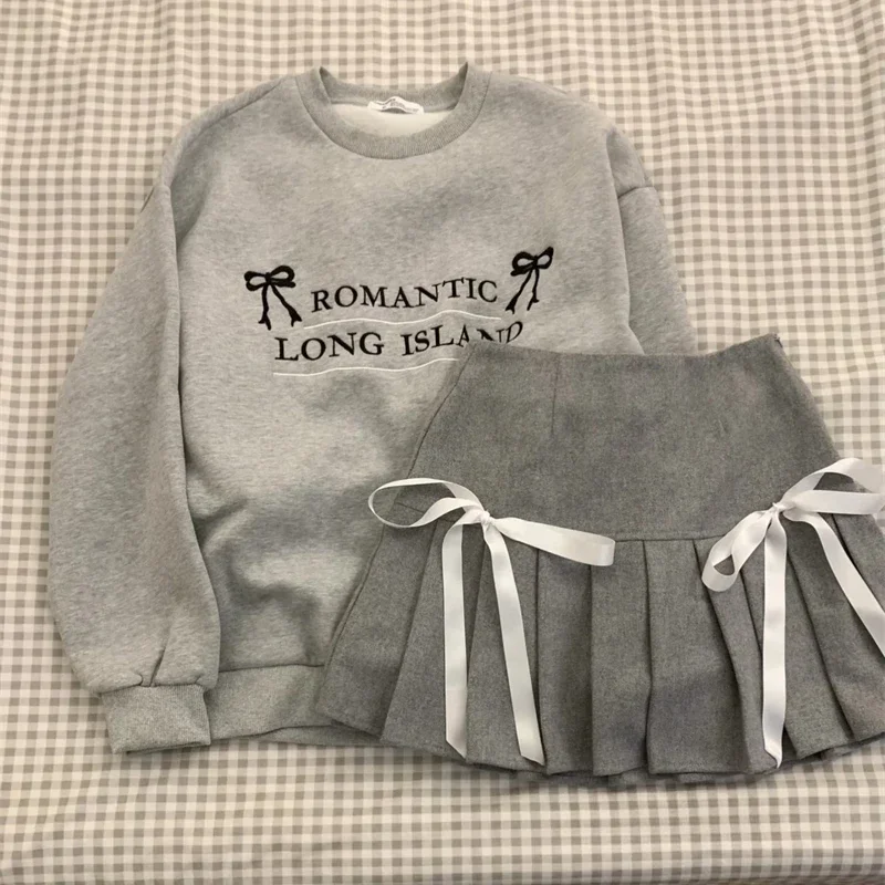 Getadme 대학 스타일 자수 문자 느슨한 스웨트셔츠 거리 Y2K 하이 웨이스트 리본 플리츠 스커트 정장 회색 봄 원피스 여성 정장