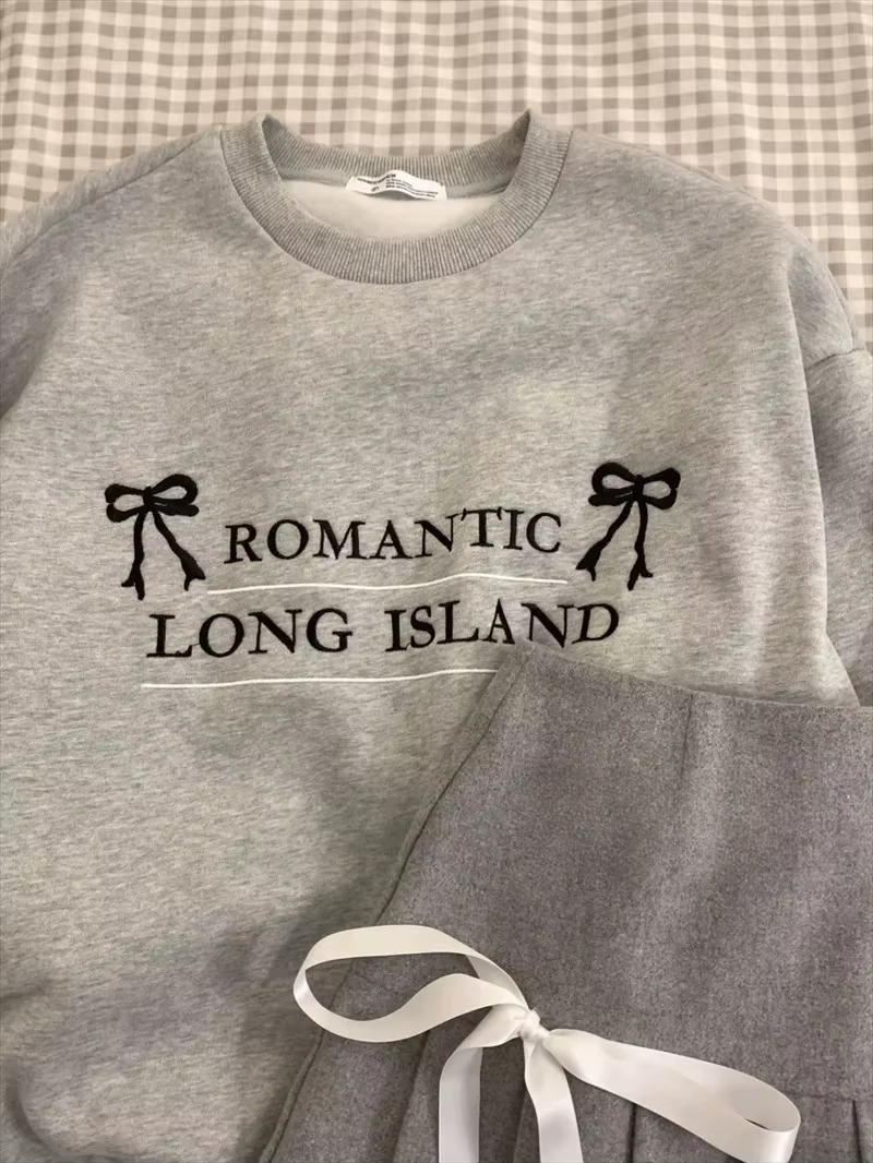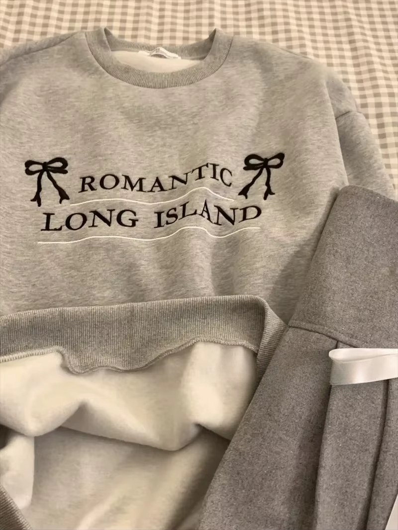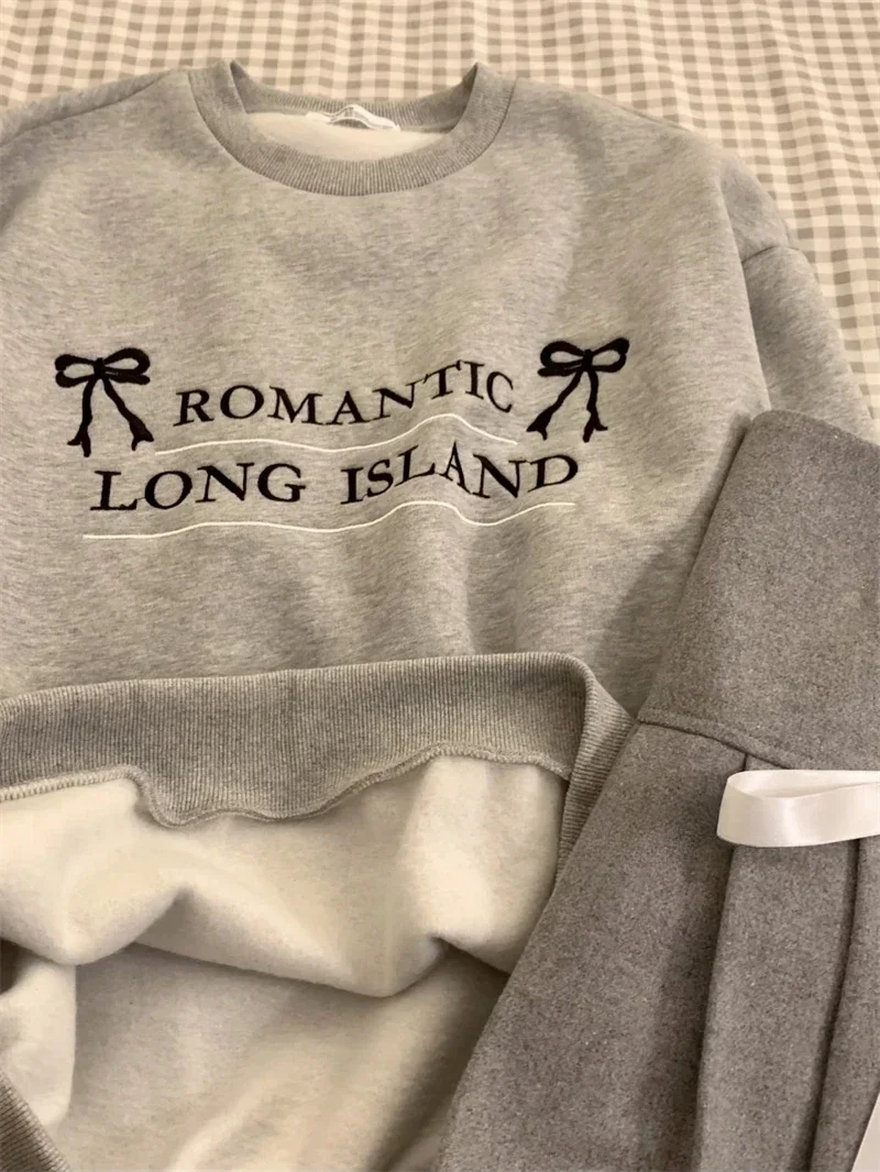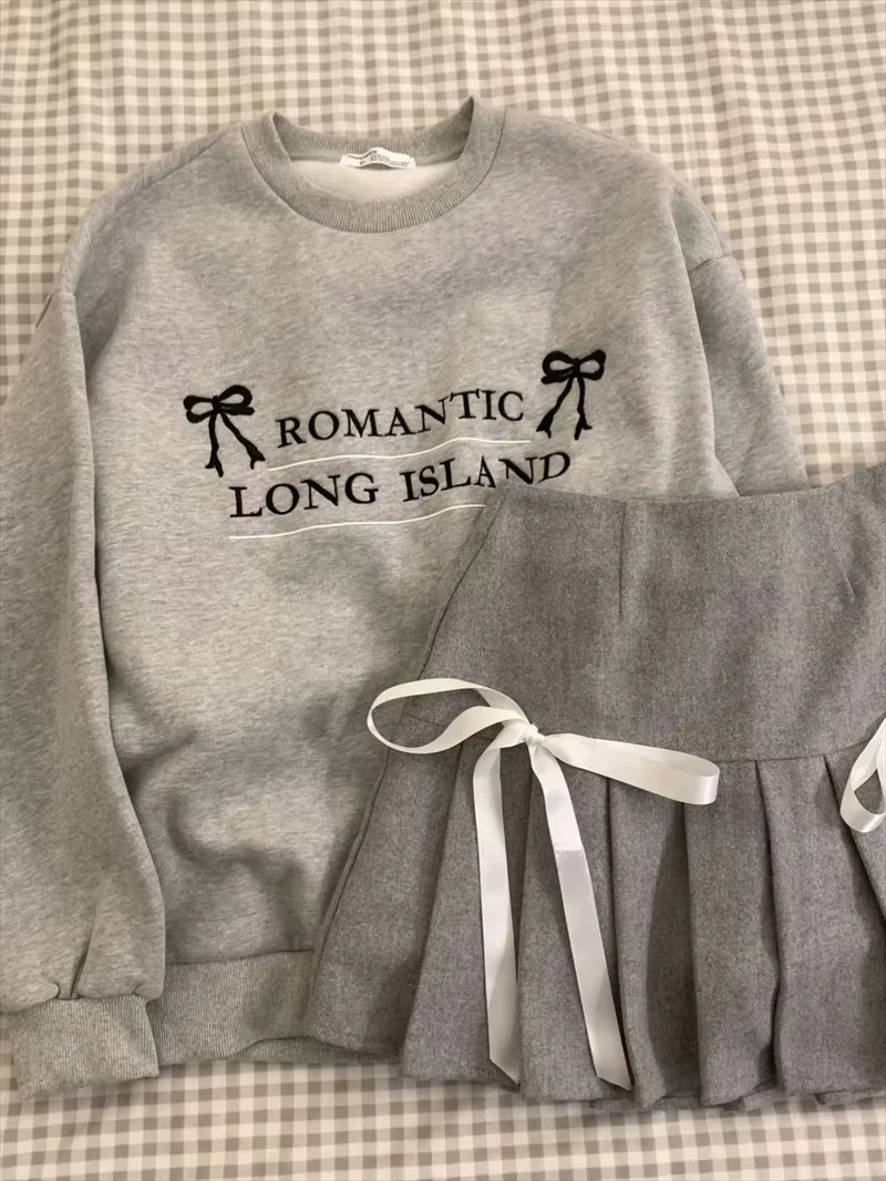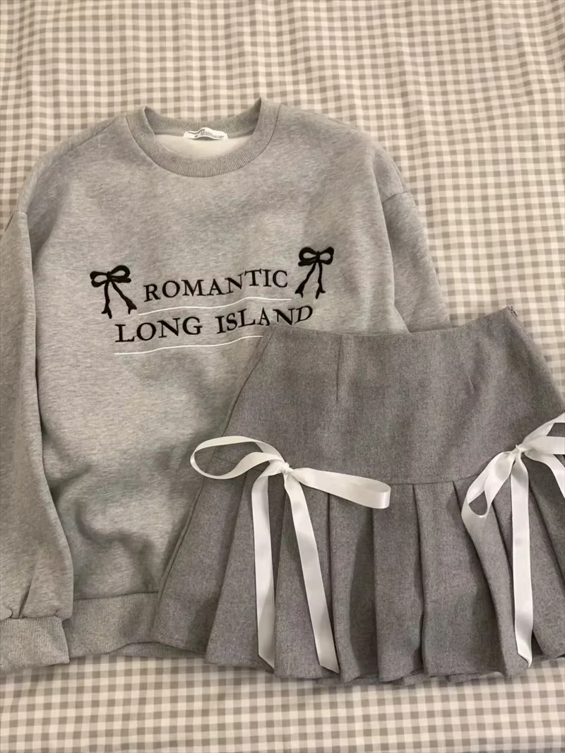 Getadme 대학 스타일 자수 문자 느슨한 스웨트셔츠 거리 Y2K 하이 웨이스트 리본 플리츠 스커트 정장 회색 봄 원피스 여성 정장