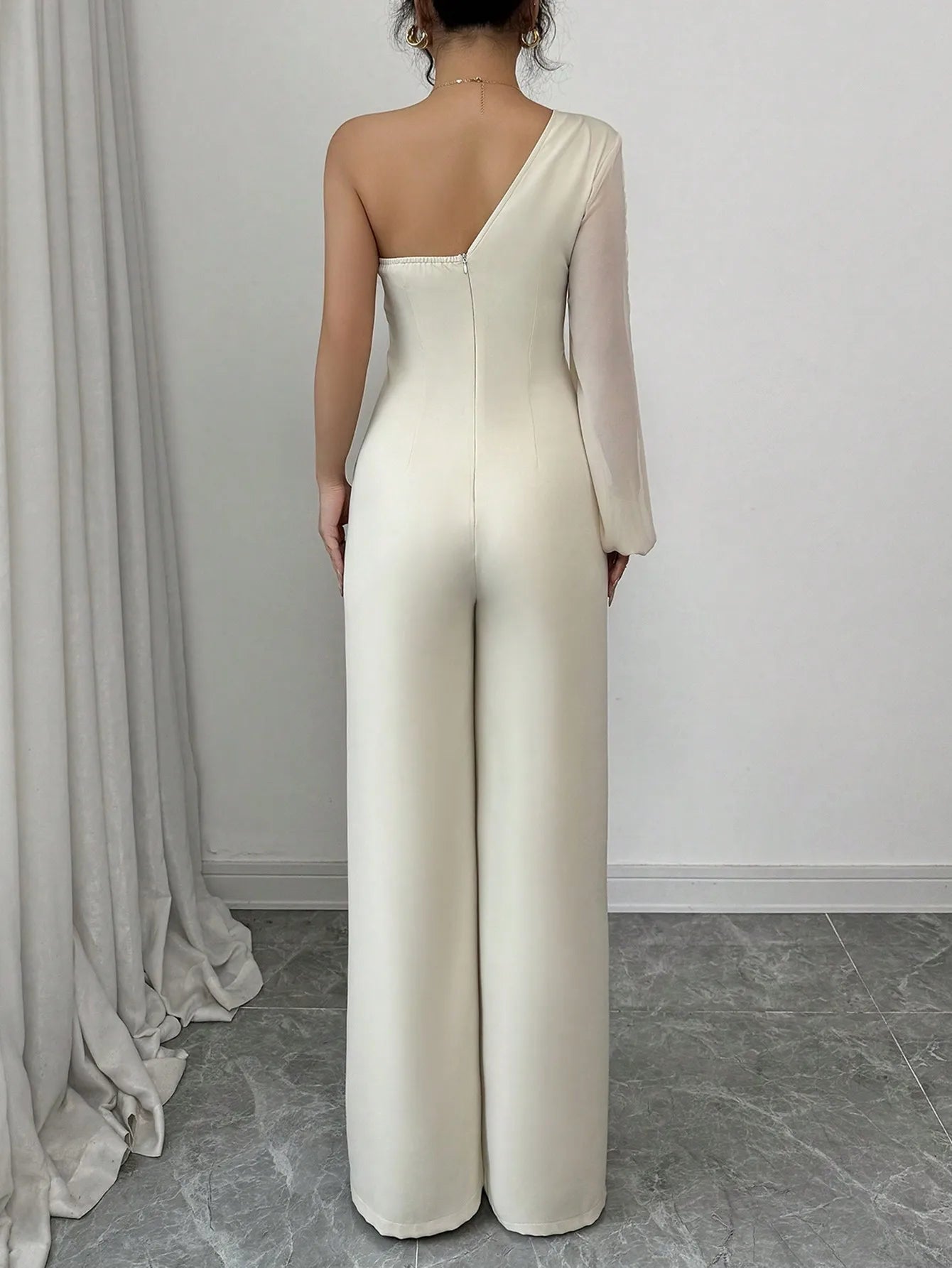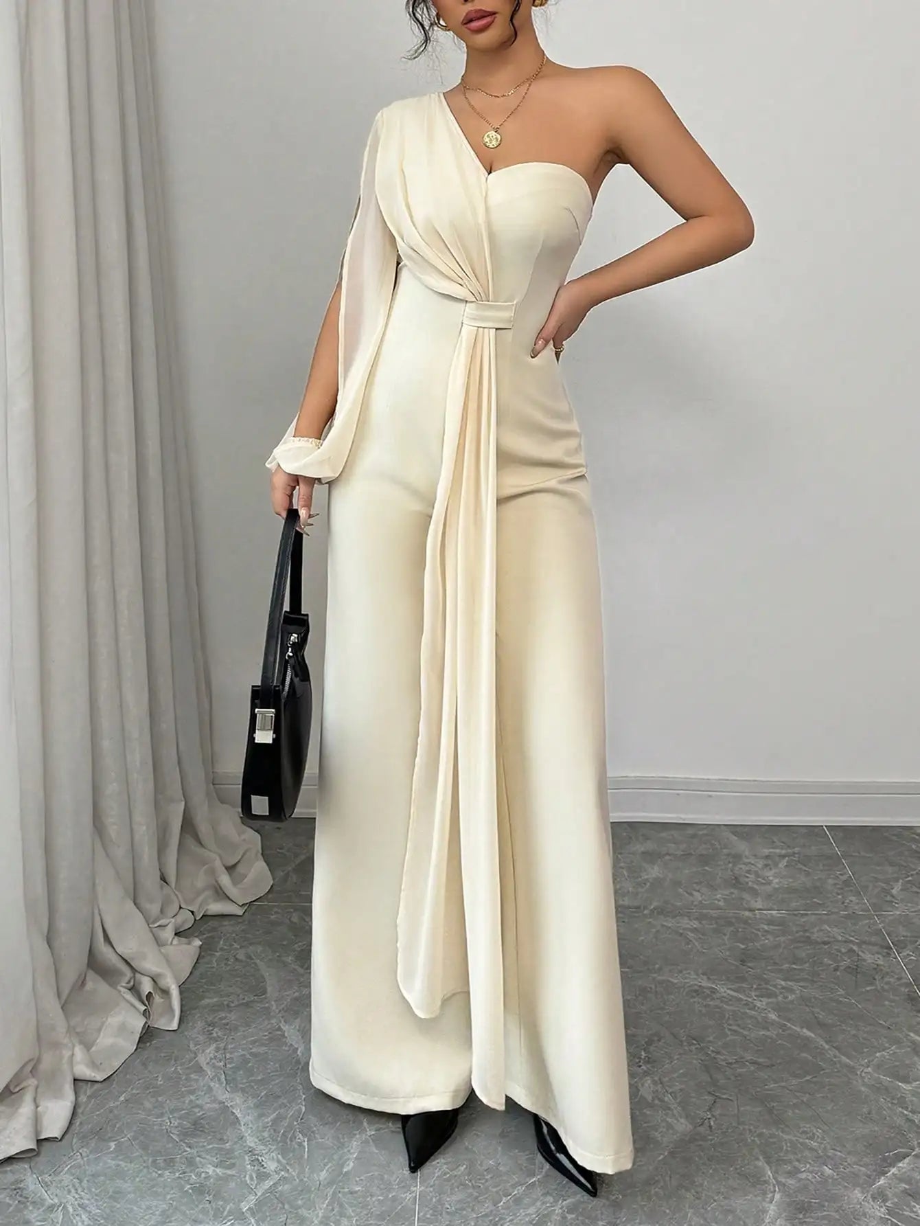 GETADME 우아한 원숄더 싱글 롱슬리브 쉬폰 하프 스트랩리스 하프백 하프에지 쉬폰 봄/여름 여성 점프수트