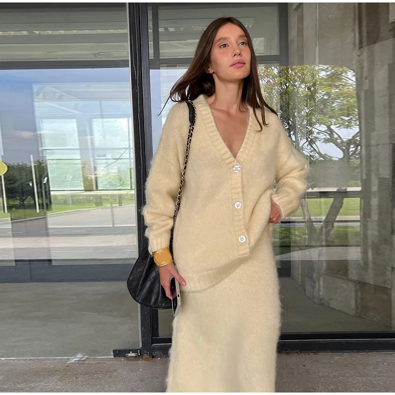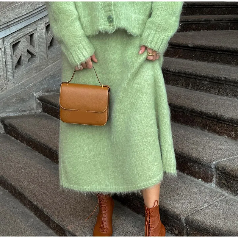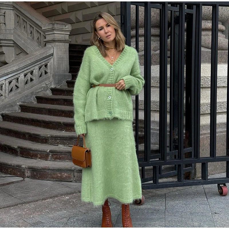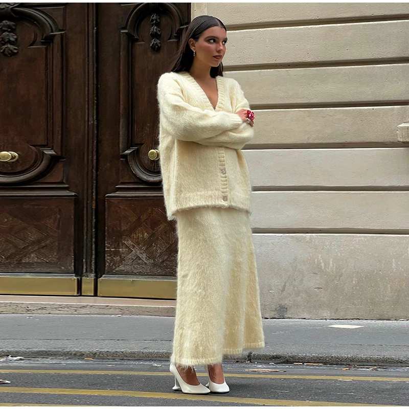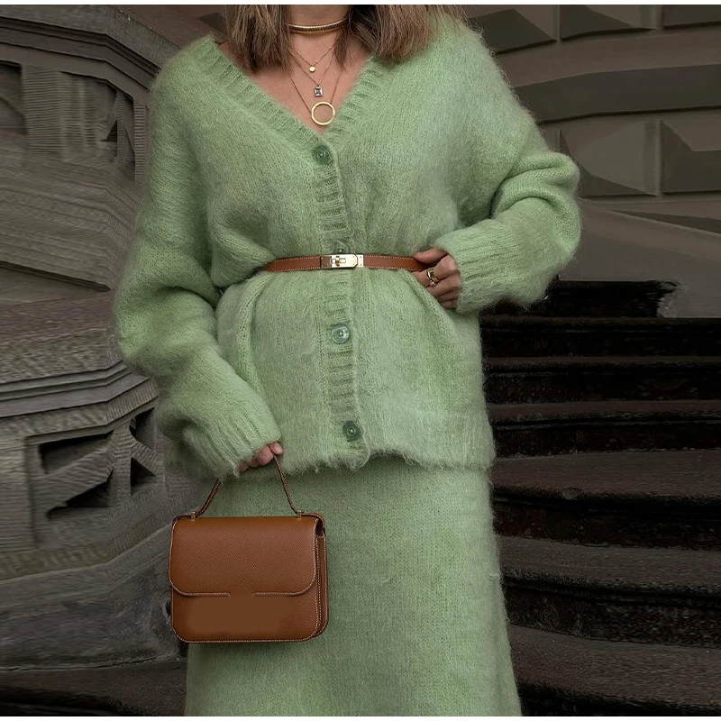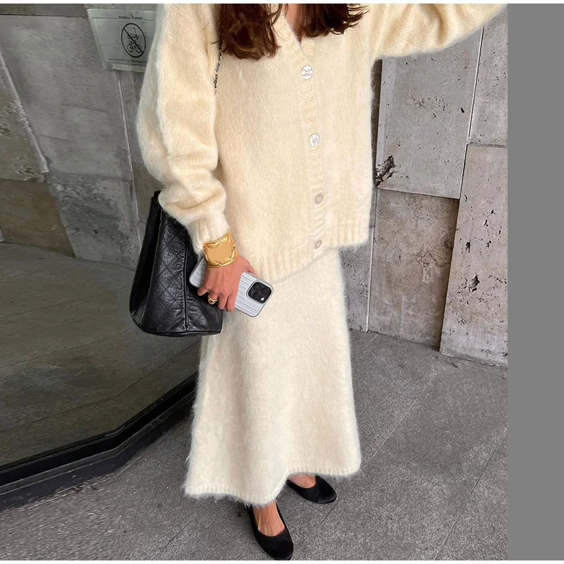 GETADME 우아한 싱글 브레스티드 모헤어 니트 카디건 수트 여성 시크 솔리드 하이웨이스트 캐시미어 미디 스커트 세트 2024 레이디 캐주얼 아웃핏