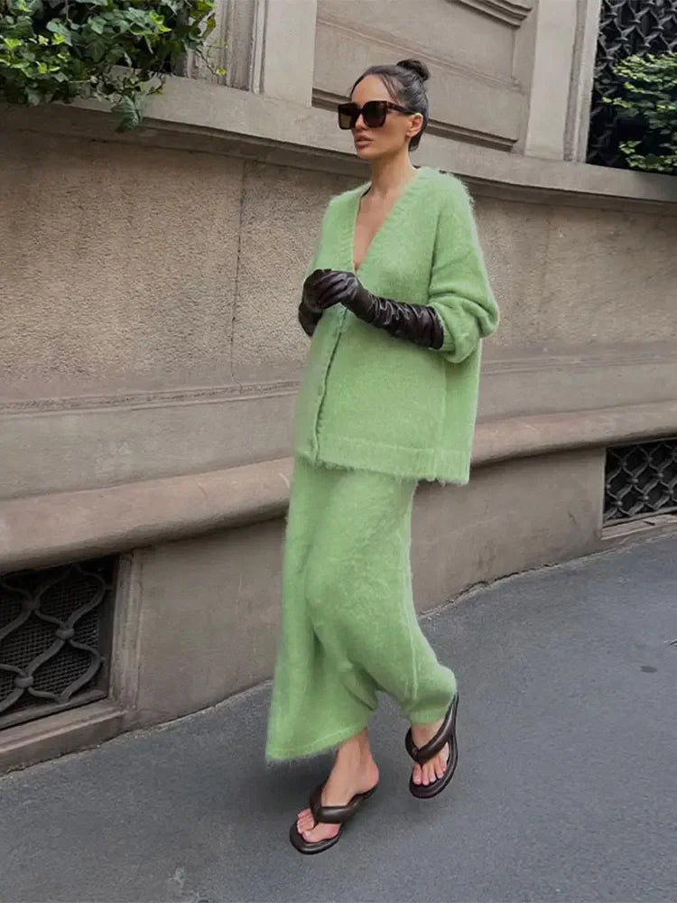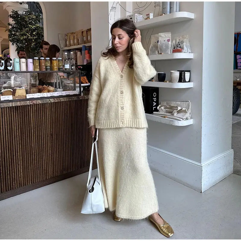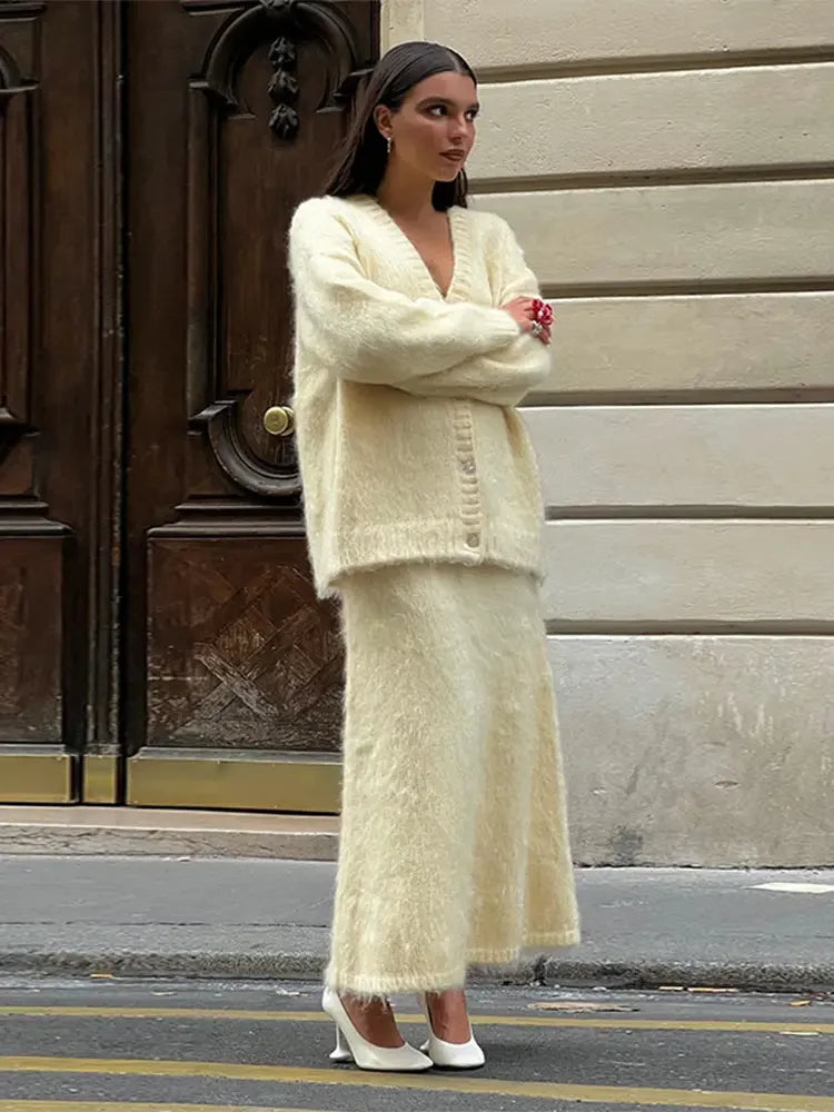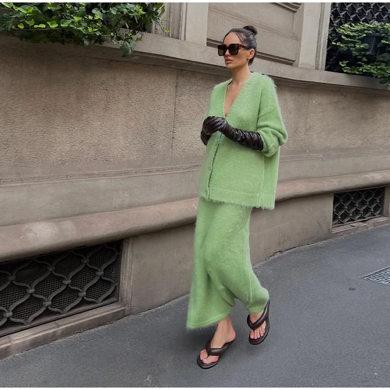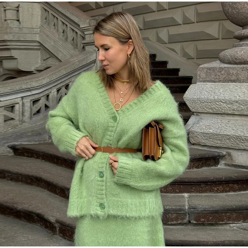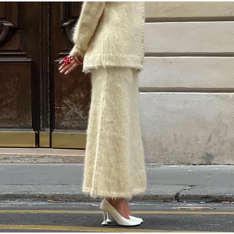 GETADME 우아한 싱글 브레스티드 모헤어 니트 카디건 수트 여성 시크 솔리드 하이웨이스트 캐시미어 미디 스커트 세트 2024 레이디 캐주얼 아웃핏