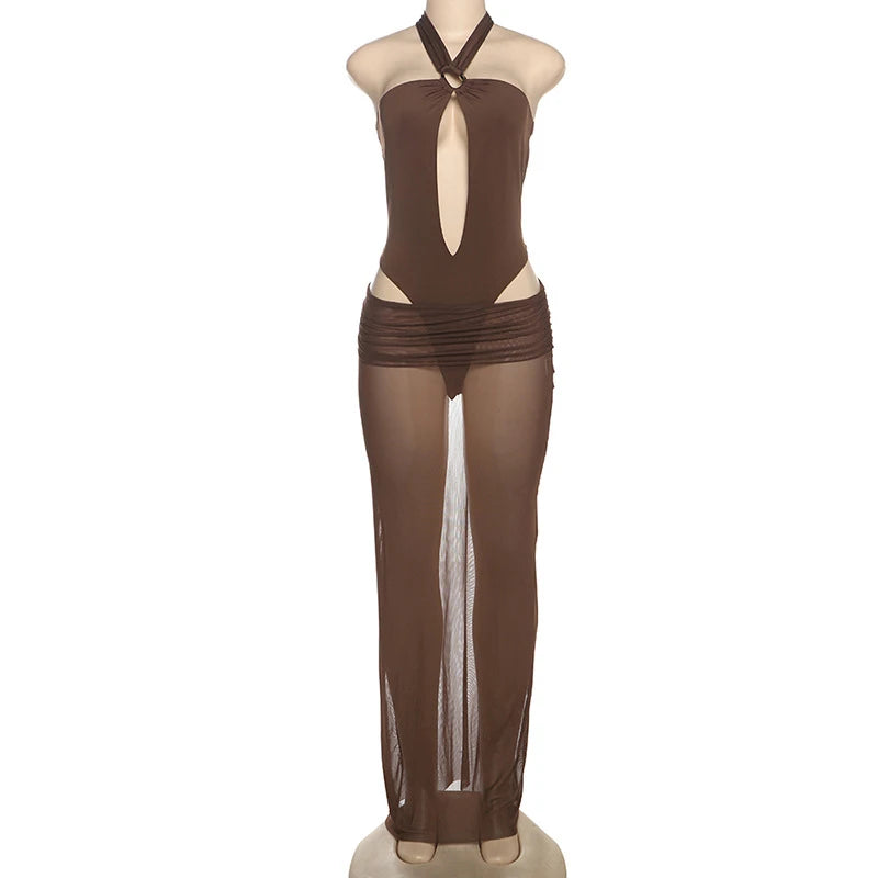 GETADME 패션 레이디 솔리드 2피스 세트 여성 홀터넥 바디수트 & 메시 롱 스커트 트렌드 비치 스타일 여름 의상