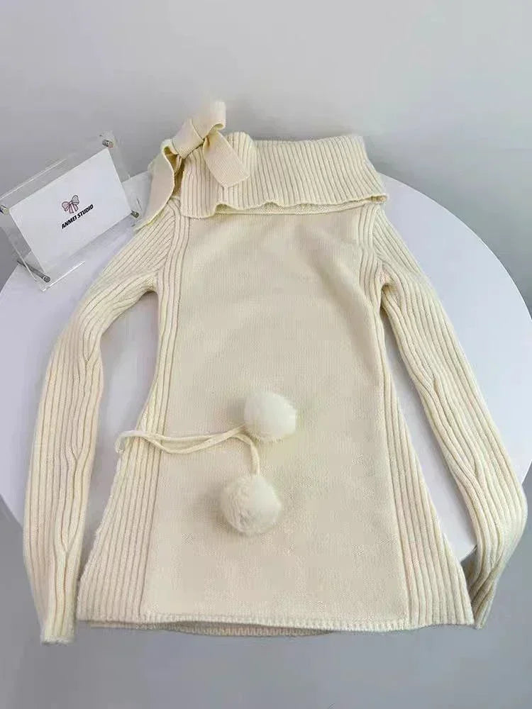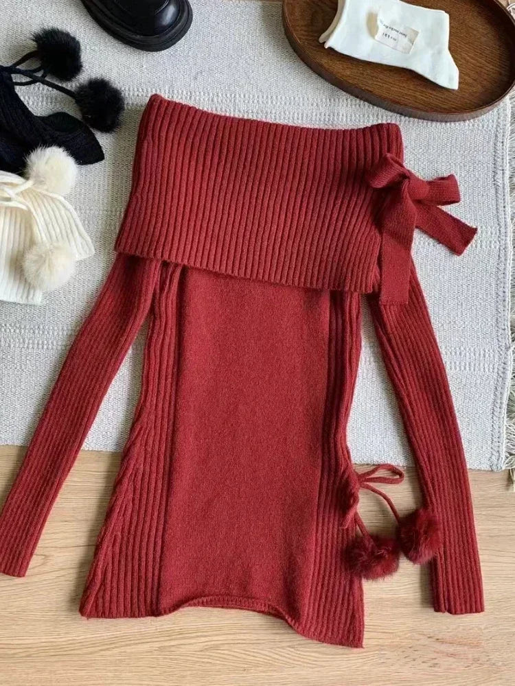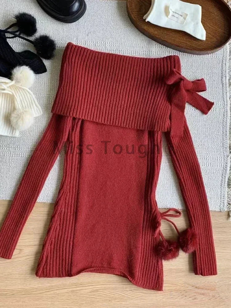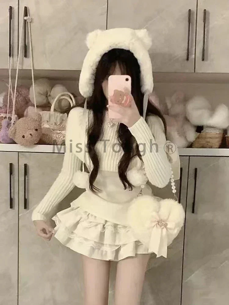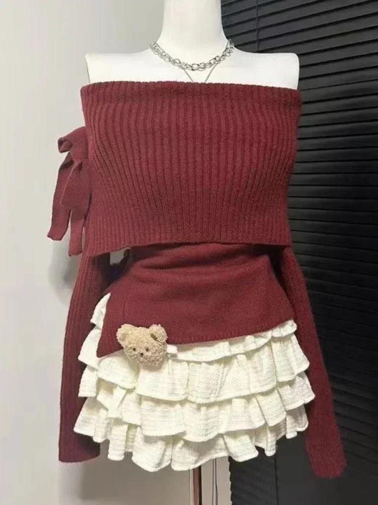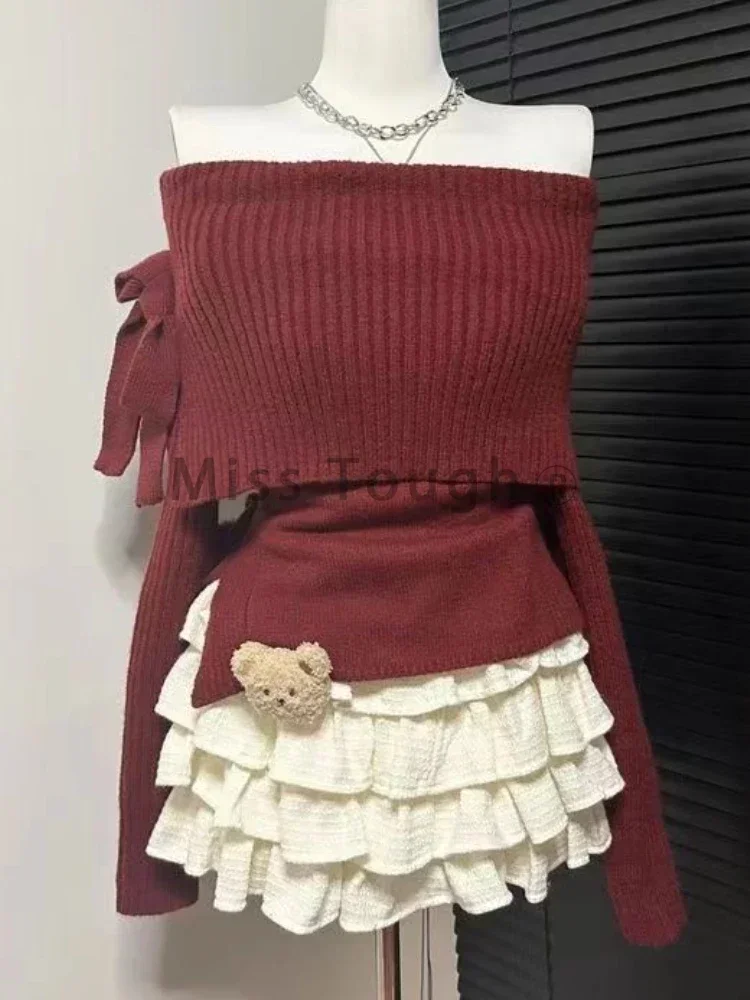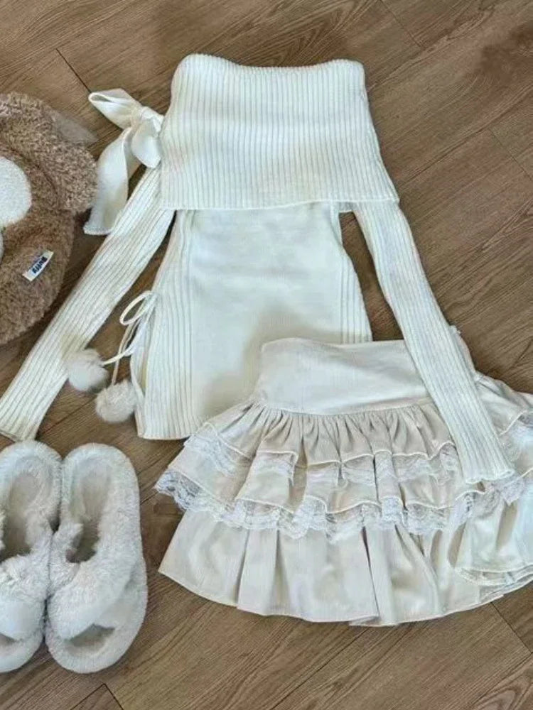 GETADME 패션 스위트 엘라스틱 슬림 2피스 세트 여성 겨울 시크 솔리드 리본 긴팔 상의 여성 + 하이웨이스트 얇은 러플 숏 스커트