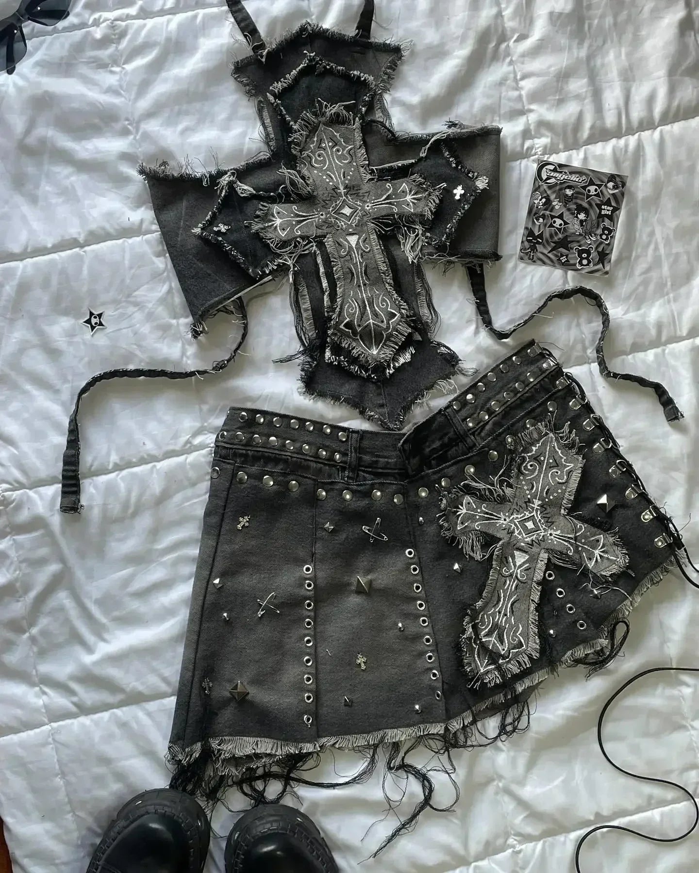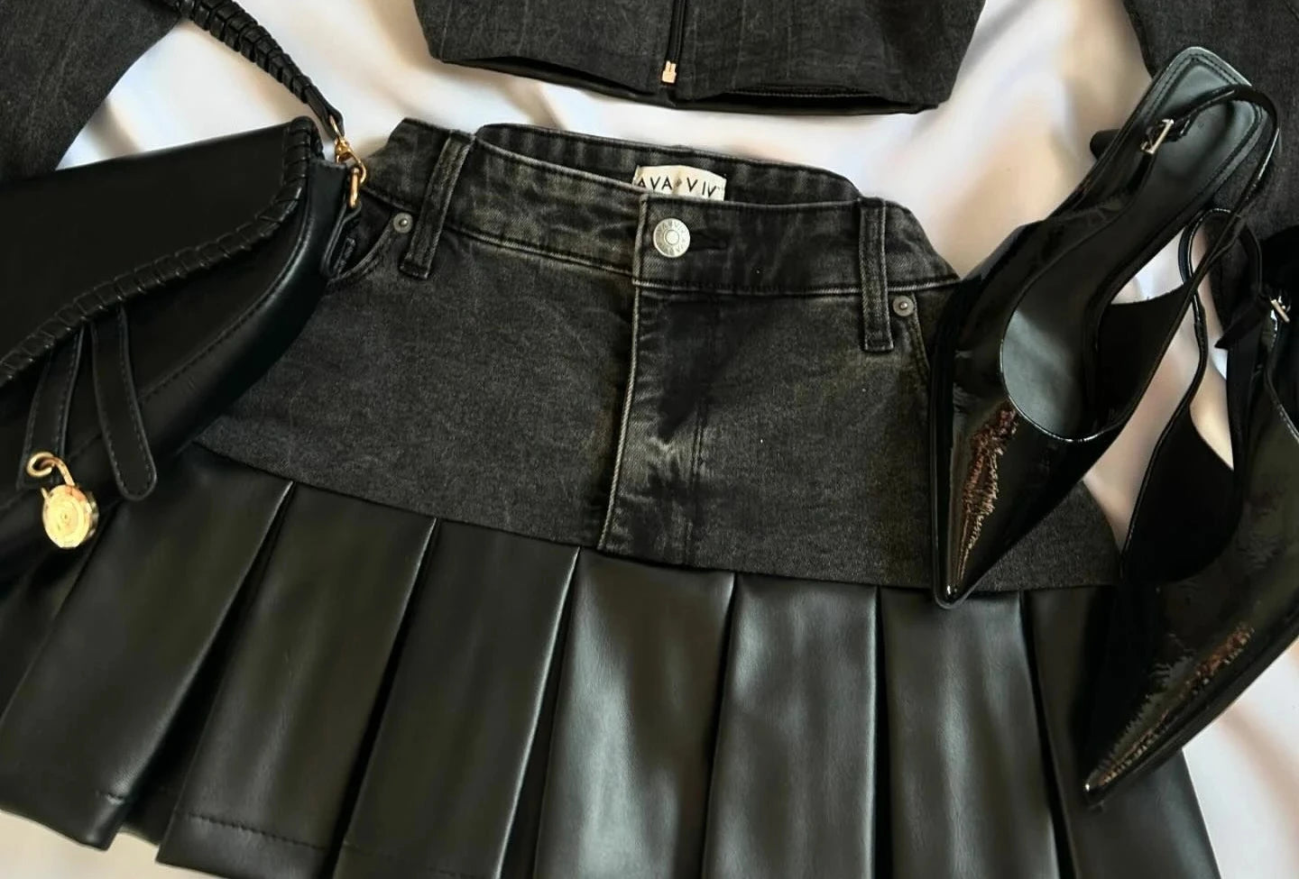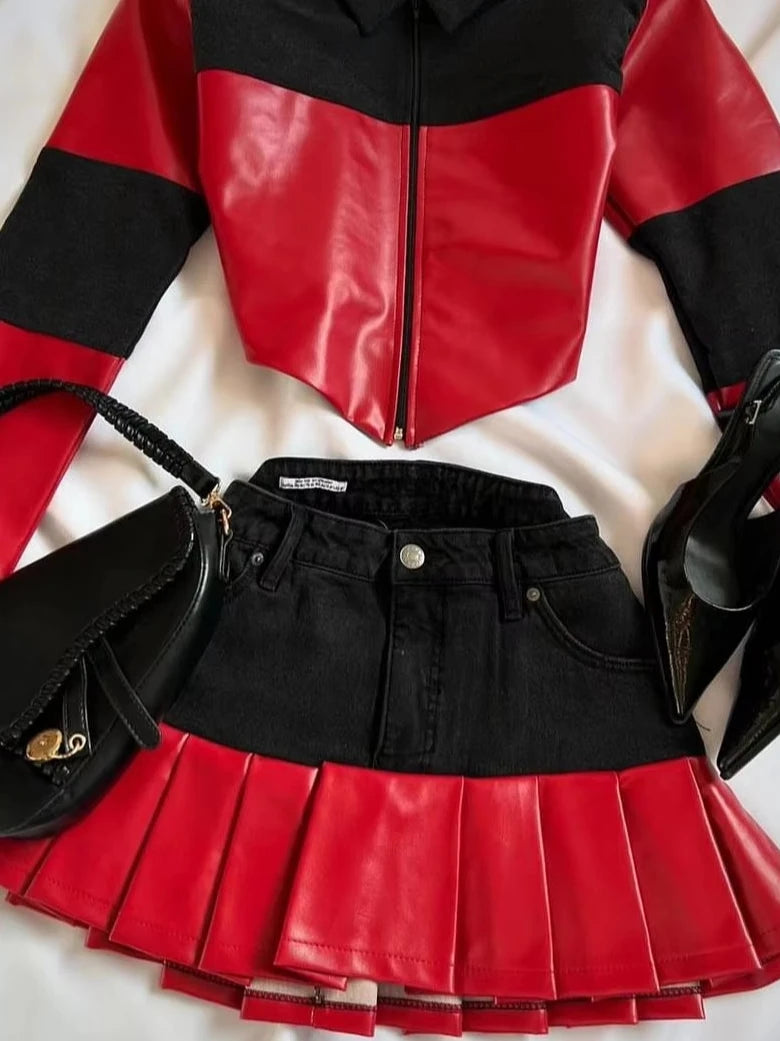 하라주쿠 핫걸 스트리트웨어 투피스 세트 여성복 레트로 고스 신상 Y2K 스커트 세트 긴팔 가죽 지퍼 재킷