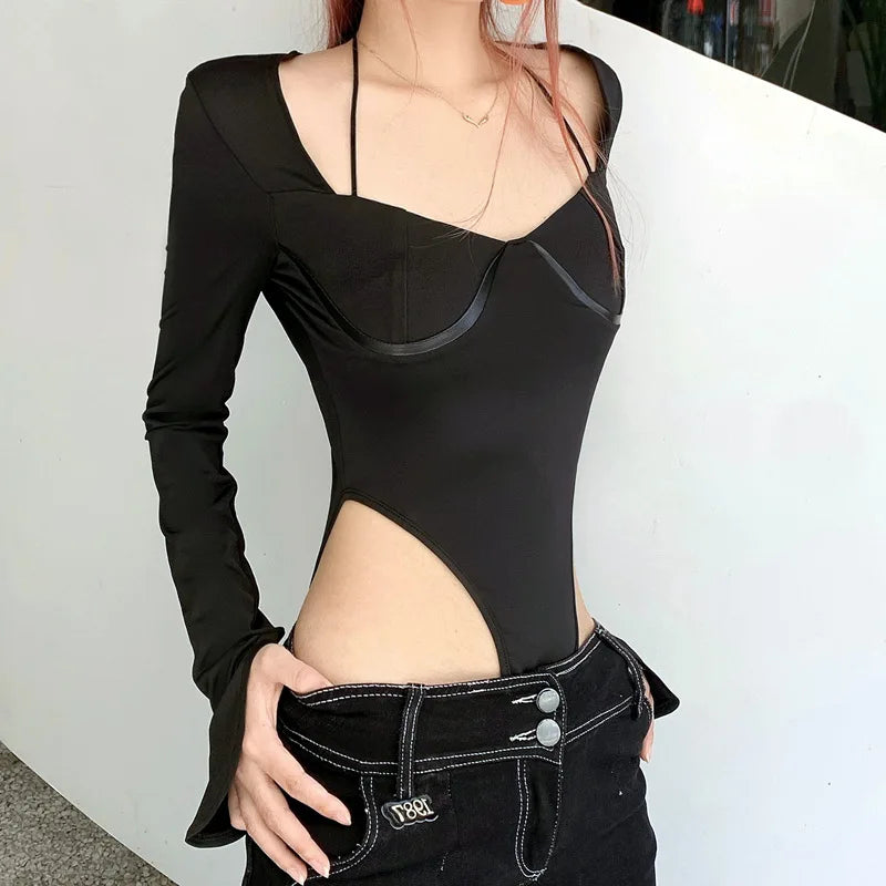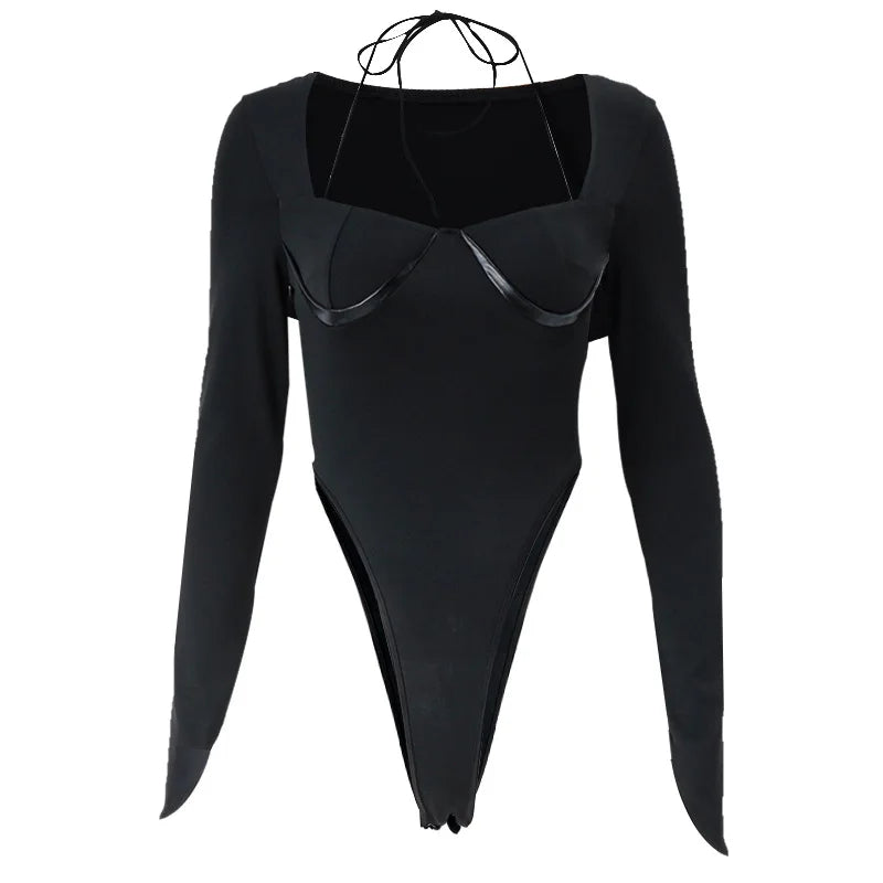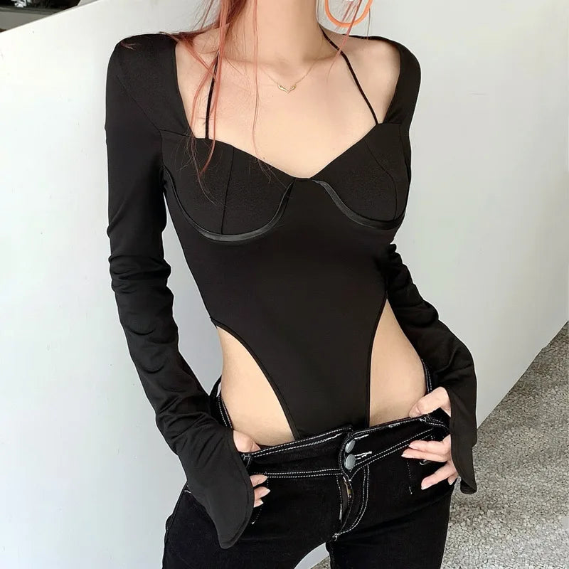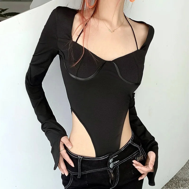 GETADME 하이 스트리트 여성 바디수트 긴팔 로우컷 섹시 홀터 블랙 스키니 셰이프 웨어 원피스 슬리밍 클럽 베이직 탑 가을
