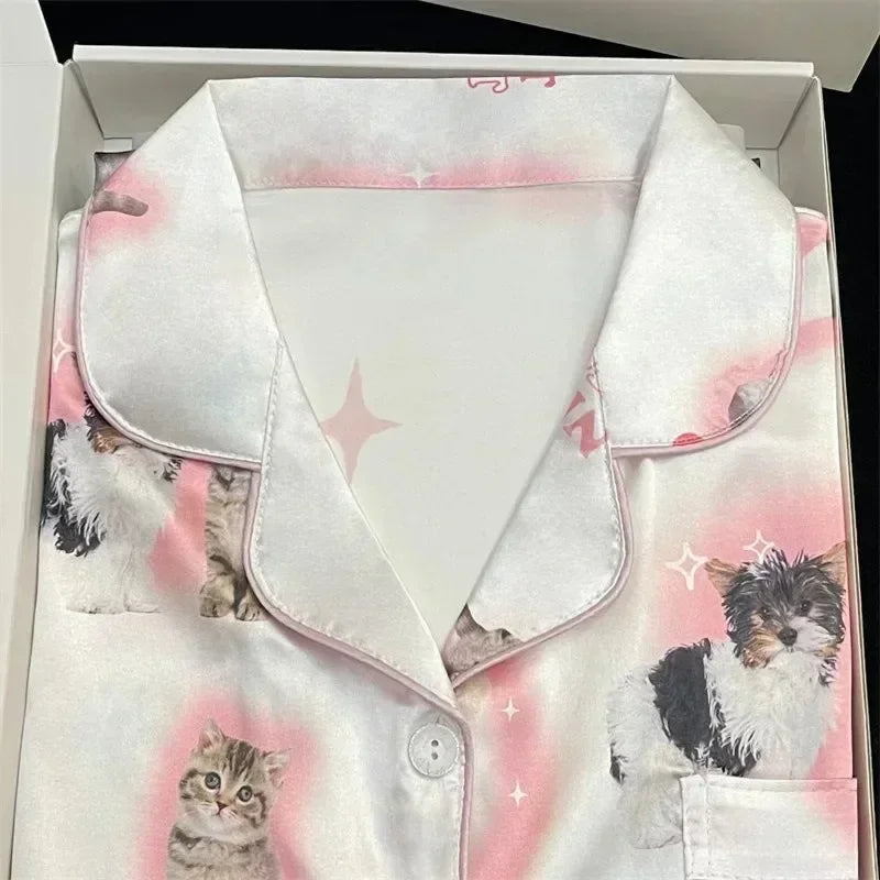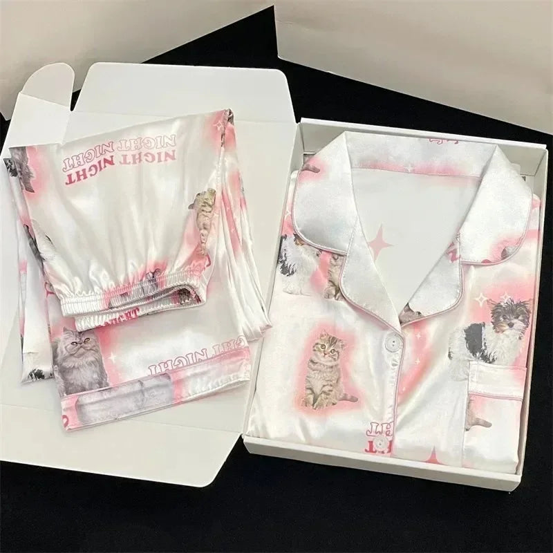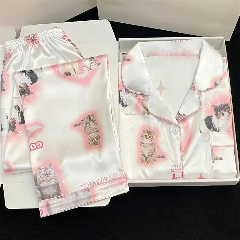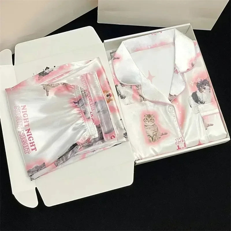 귀여운 청소년 소녀용 잠옷 새틴 홈웨어 긴 짧은 패션 잠옷 귀여운 고양이 프린트 여름 신상품 여성용 얇은 잠옷 실크 홈 세트