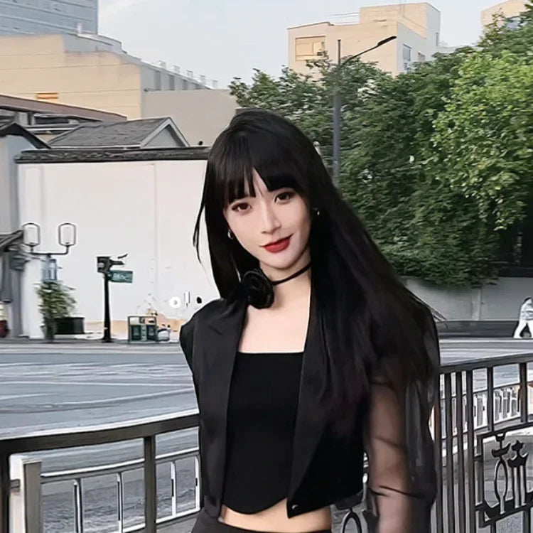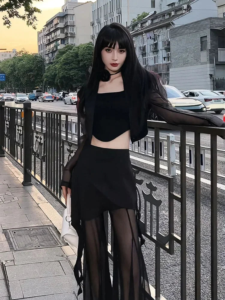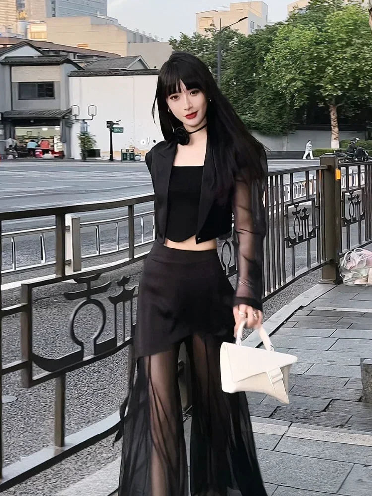 GETADME 한국식 심플 하이웨이스트 할로우 아웃 블랙 팬츠 + Y2K E-Girl 슬림핏 메시 롱슬리브 탑 여성 그런지 투피스 세트