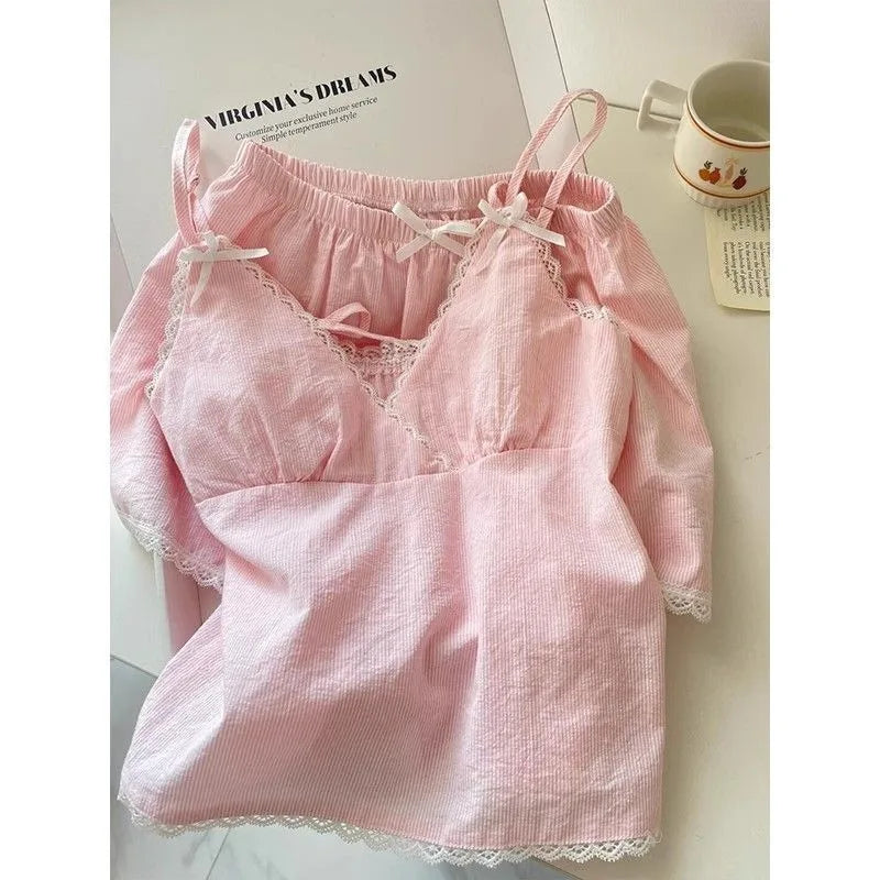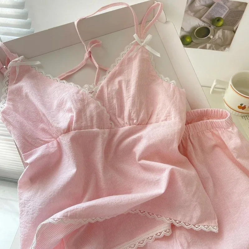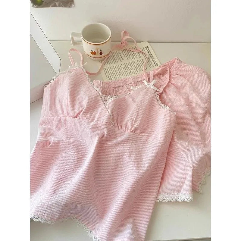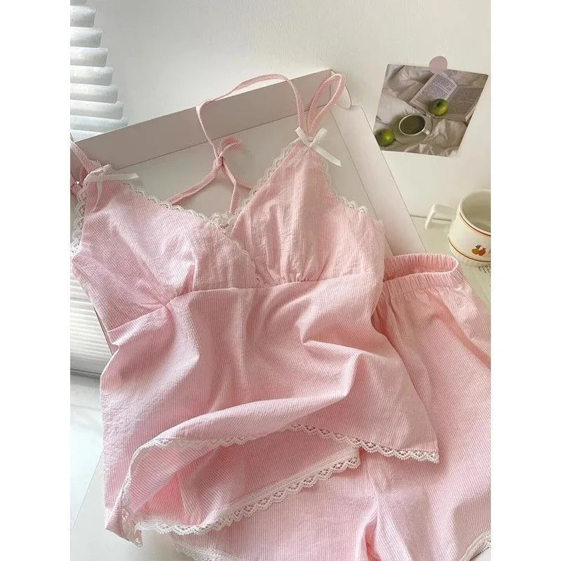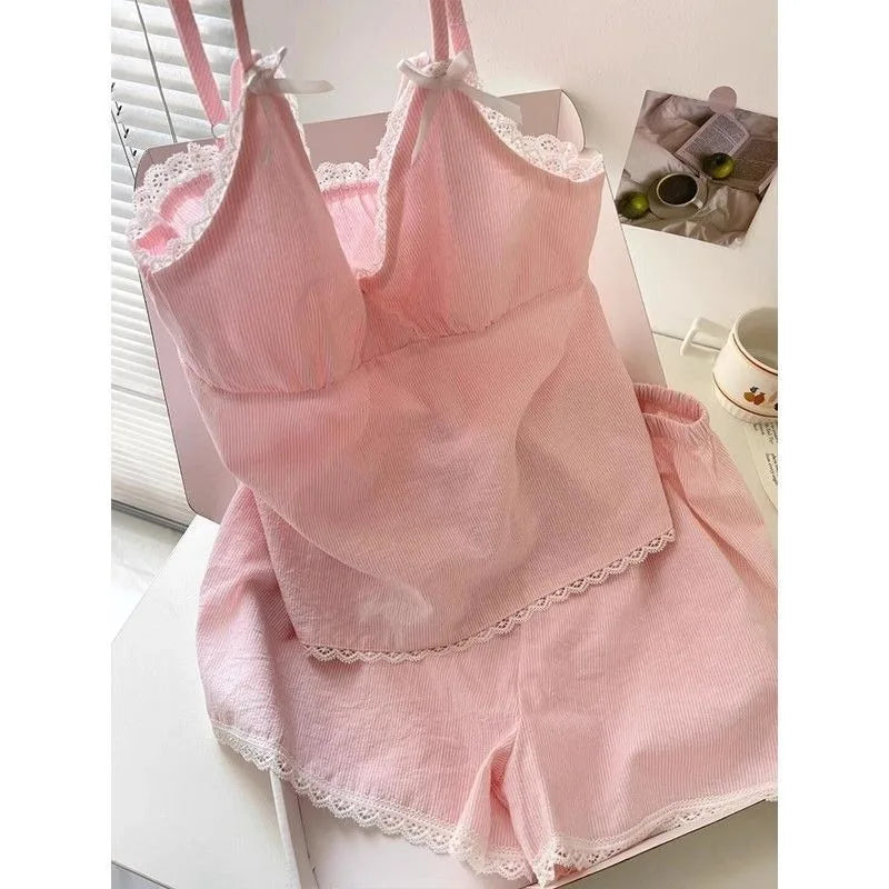 GETADME 레이스 잠옷 여성 파자마 세트 솔리드 한국식 피아마 여름 반바지 세트 2피스 스파게티 스트랩 나이트웨어 캐주얼 홈 슈트