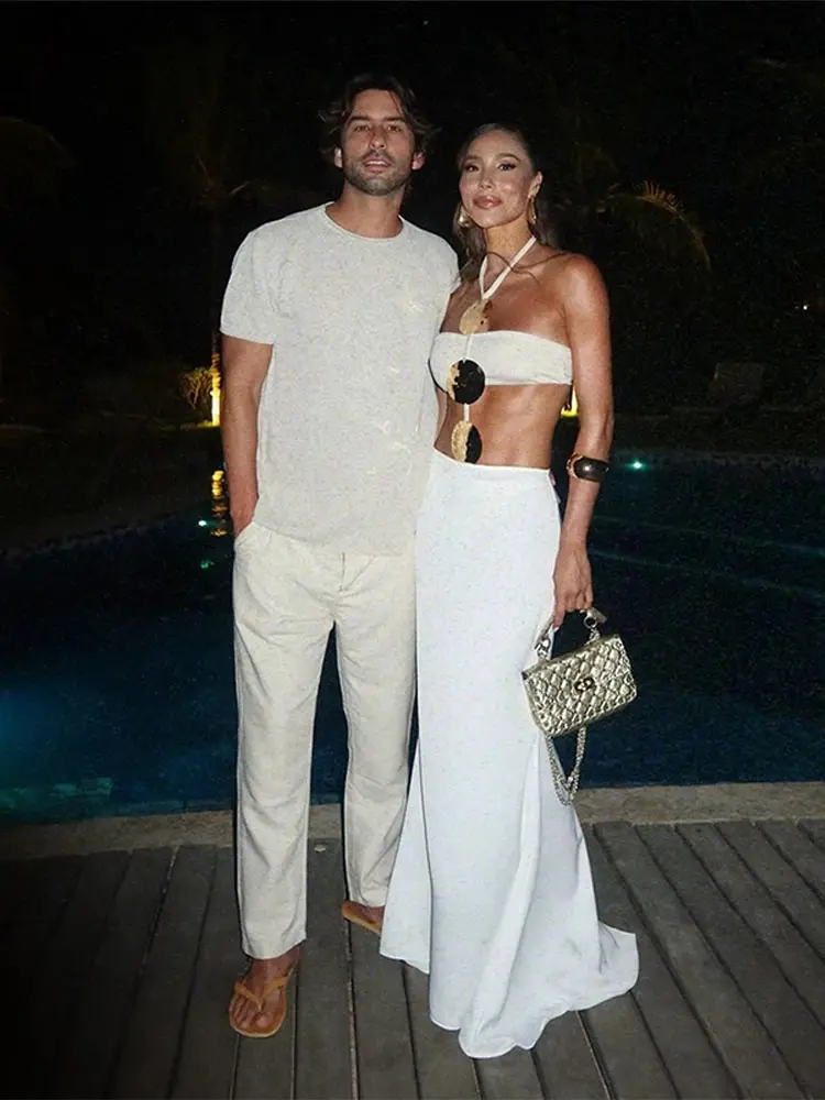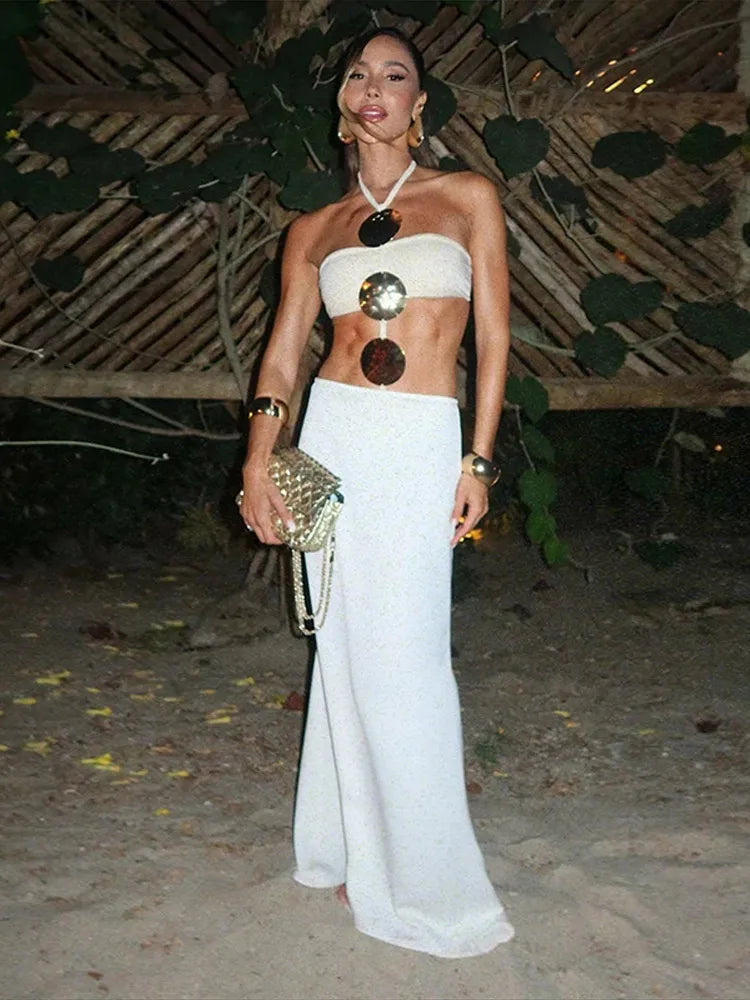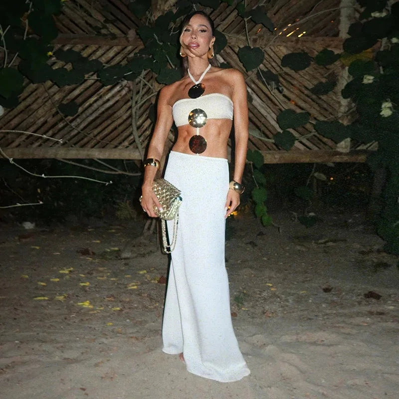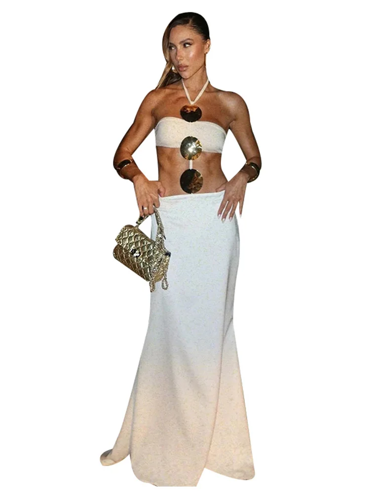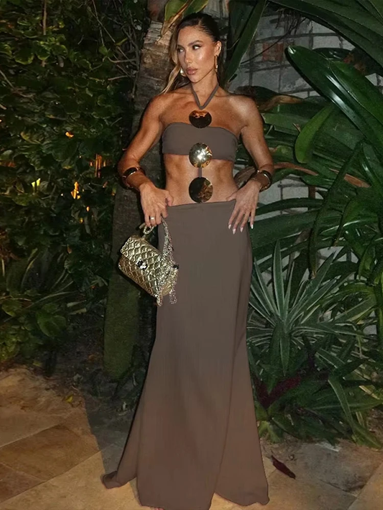 GETADME 메탈 스트랩리스 비키니 홀터 탑 스플릿 스커트 투피스 세트 여성 수영복 수영복 넥 걸이형 휴가용 비치 메시 드레스