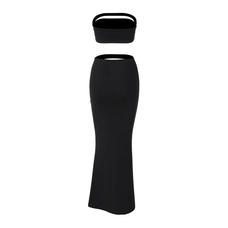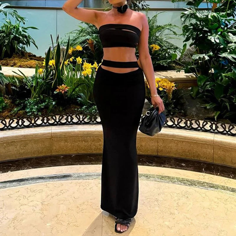 GETADME 여성용 새로운 매칭 세트 할로우 아웃 붕대 슬리브리스 튜브 탑 + 하이 웨이스트 롱 스커트 여름 클럽 2피스 의상 스트리트웨어