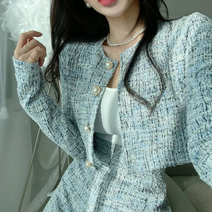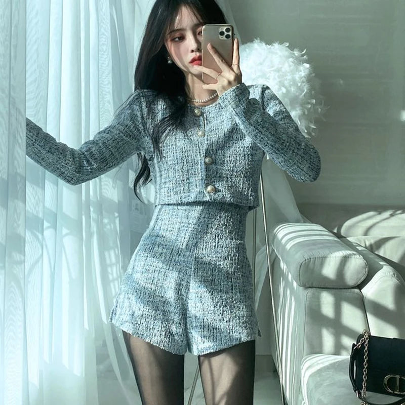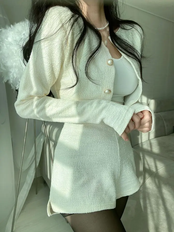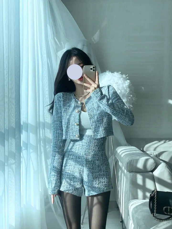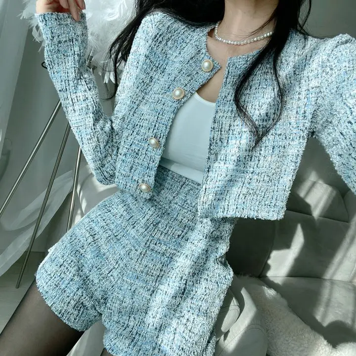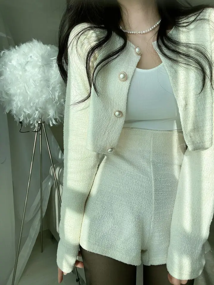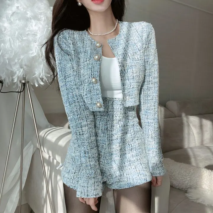 GETADME 신상 봄 스몰 프래그런스 스타일 투피스 세트 여성 O넥 싱글 브레스티드 재킷+하이웨이스트 패션 반바지 정장 여성 의상