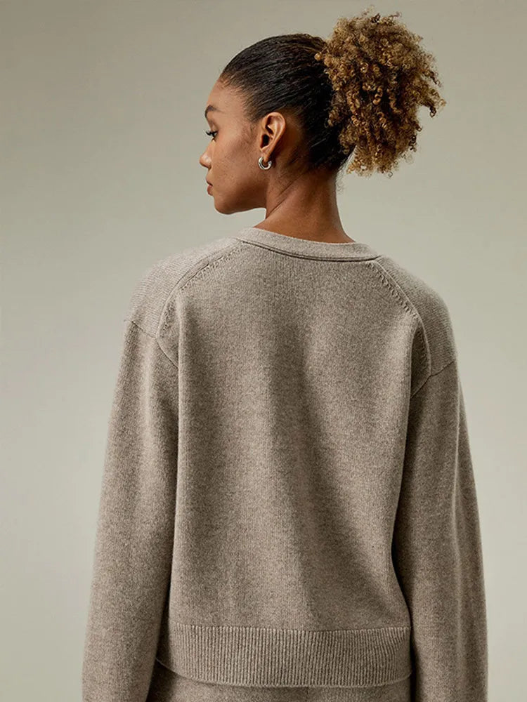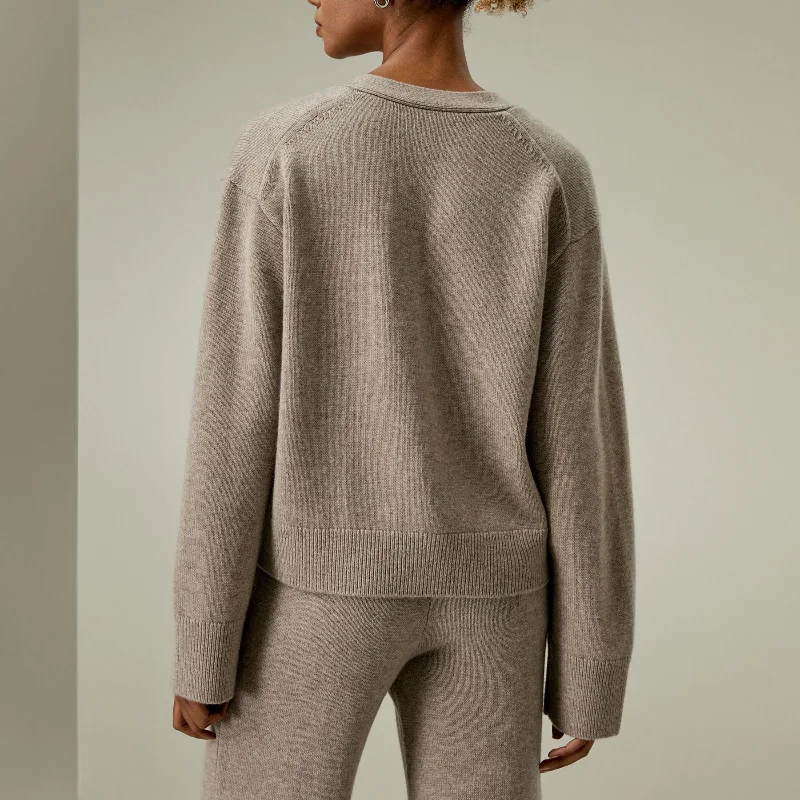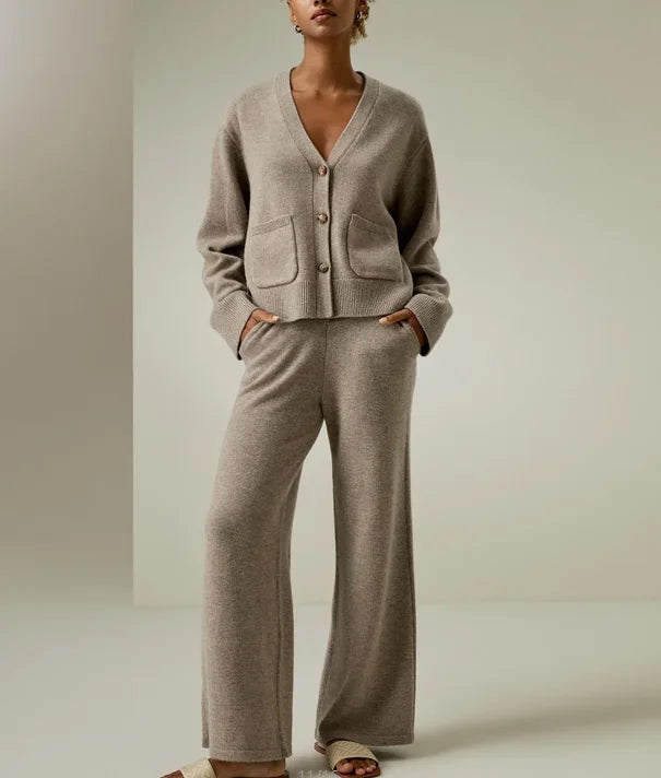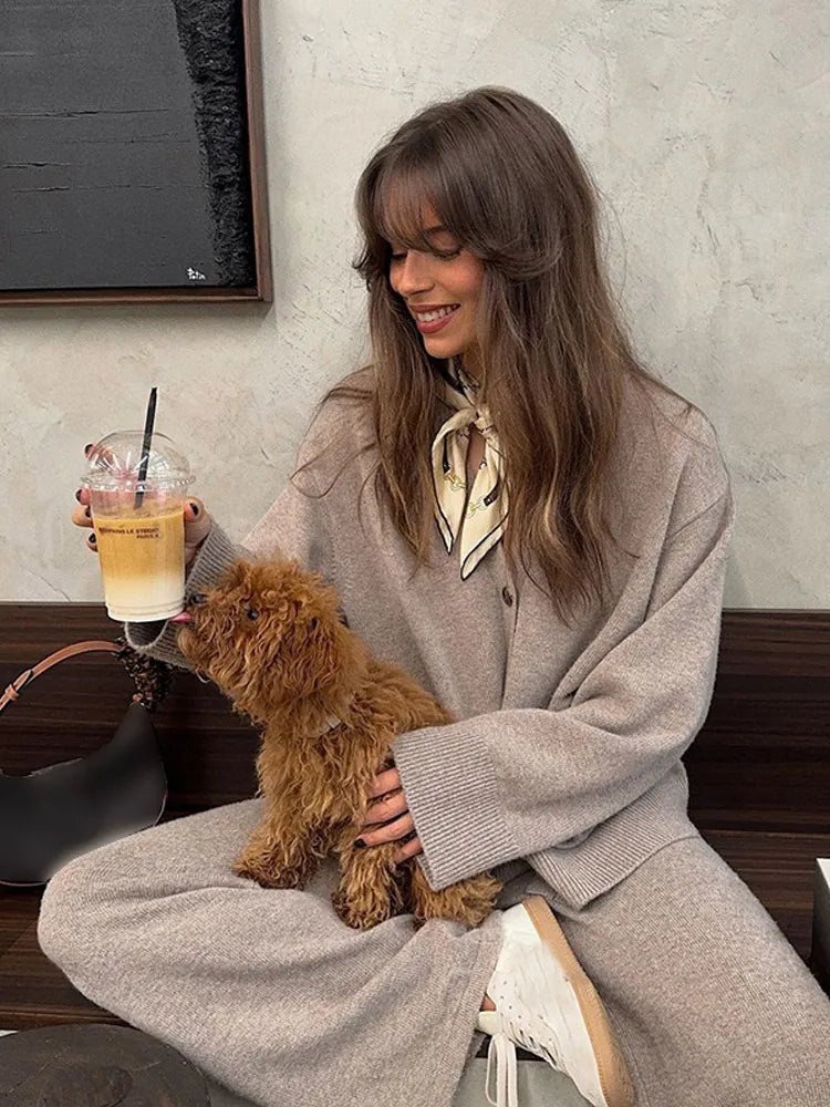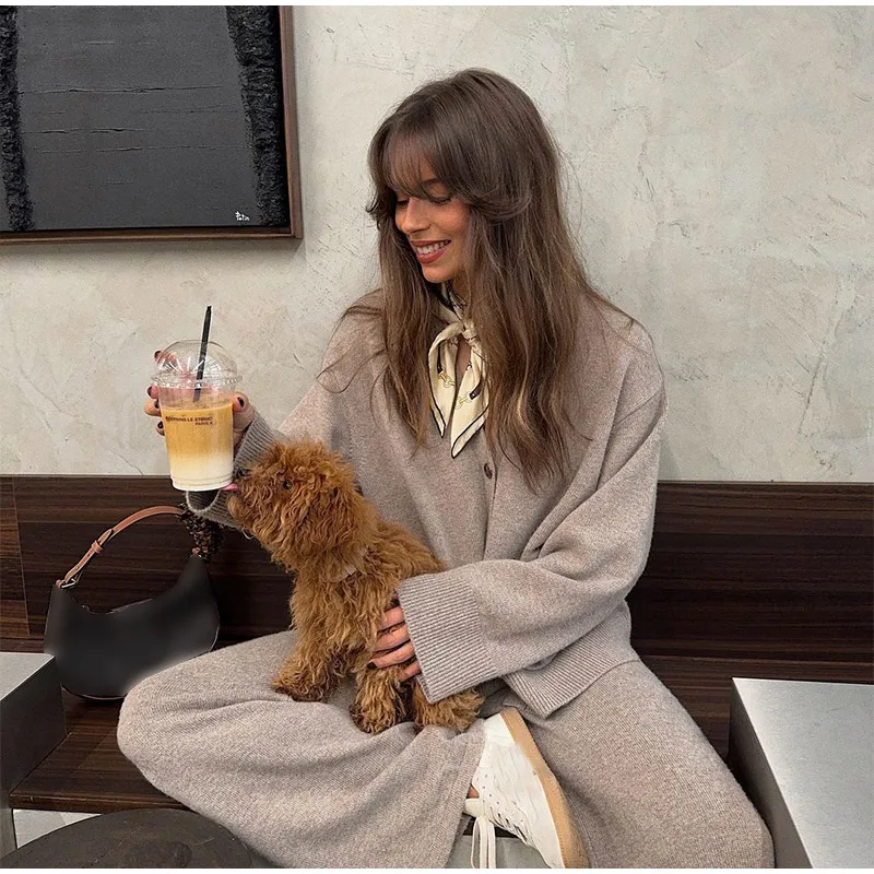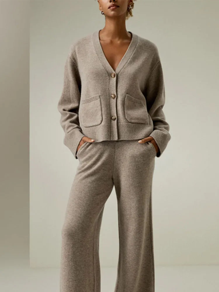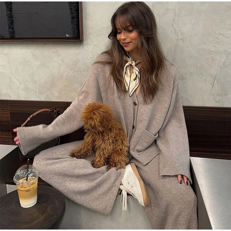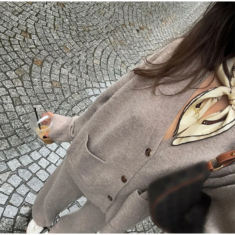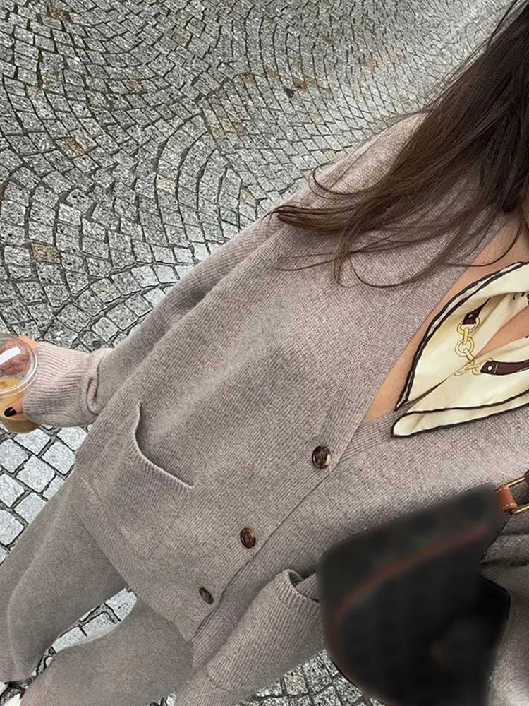 모델 번호: 새로운 여성용 세련된 솔리드 버튼 V넥 니트 카디건 세트