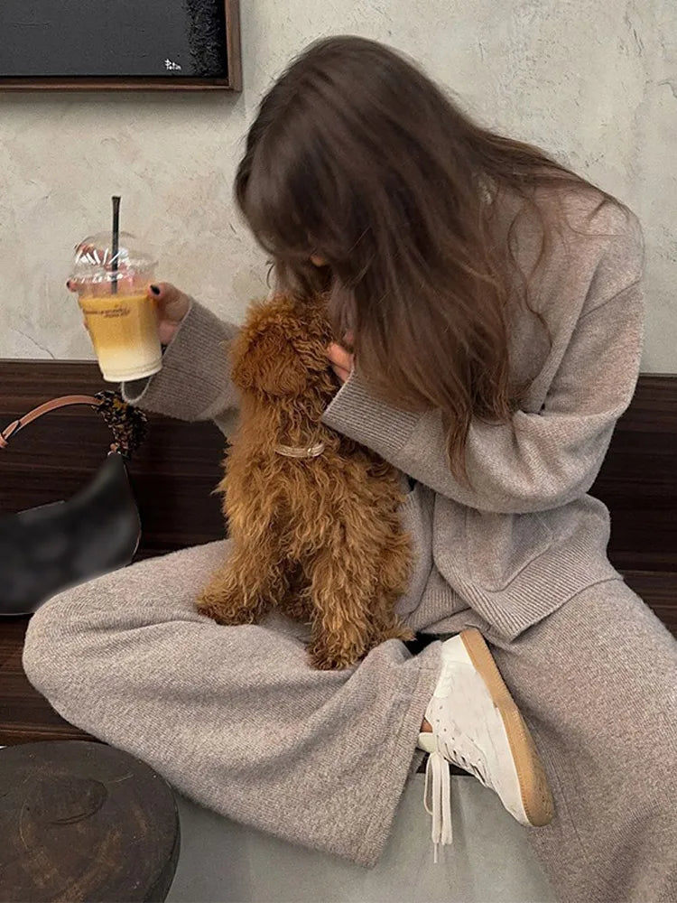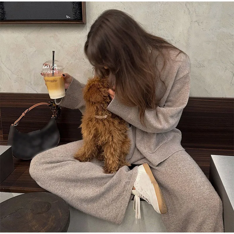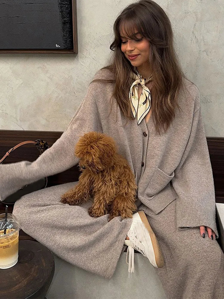 GETADME 여성용 시크 솔리드 버튼 V넥 니트 가디건 세트 패션 캐주얼 루즈 와이드 레그 롱 팬츠 정장 2024 레이디 데일리룩