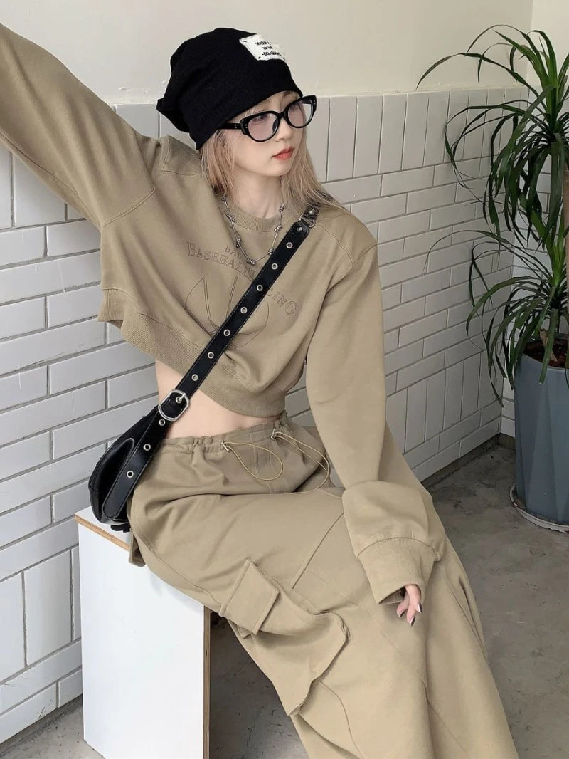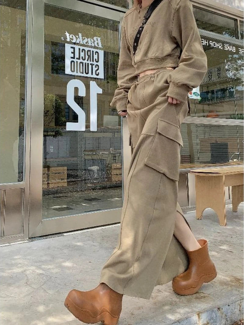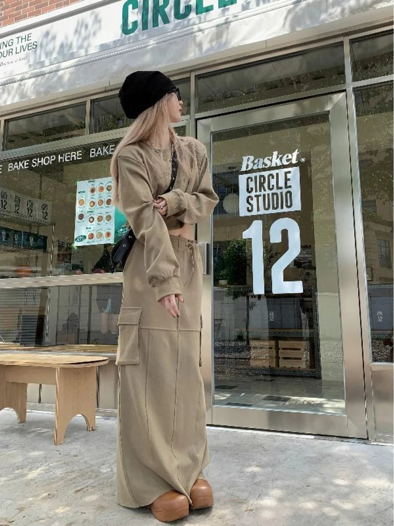 Getadme-레트로 여성 세트 새로운 봄 가을 패션 긴팔 프린트 탑 포켓 스플릿 롱 스커트 솔리드 투피스 세트 여성