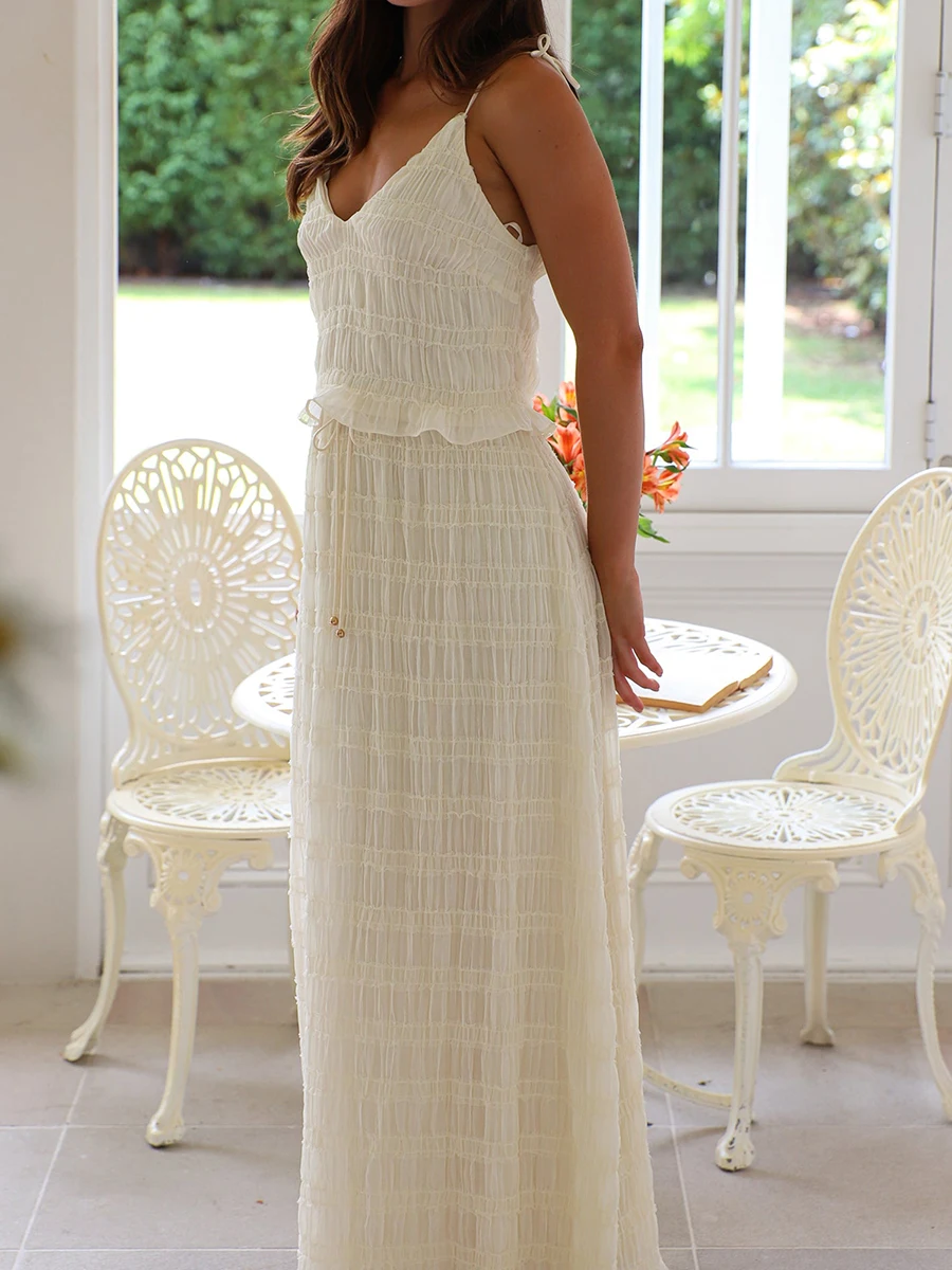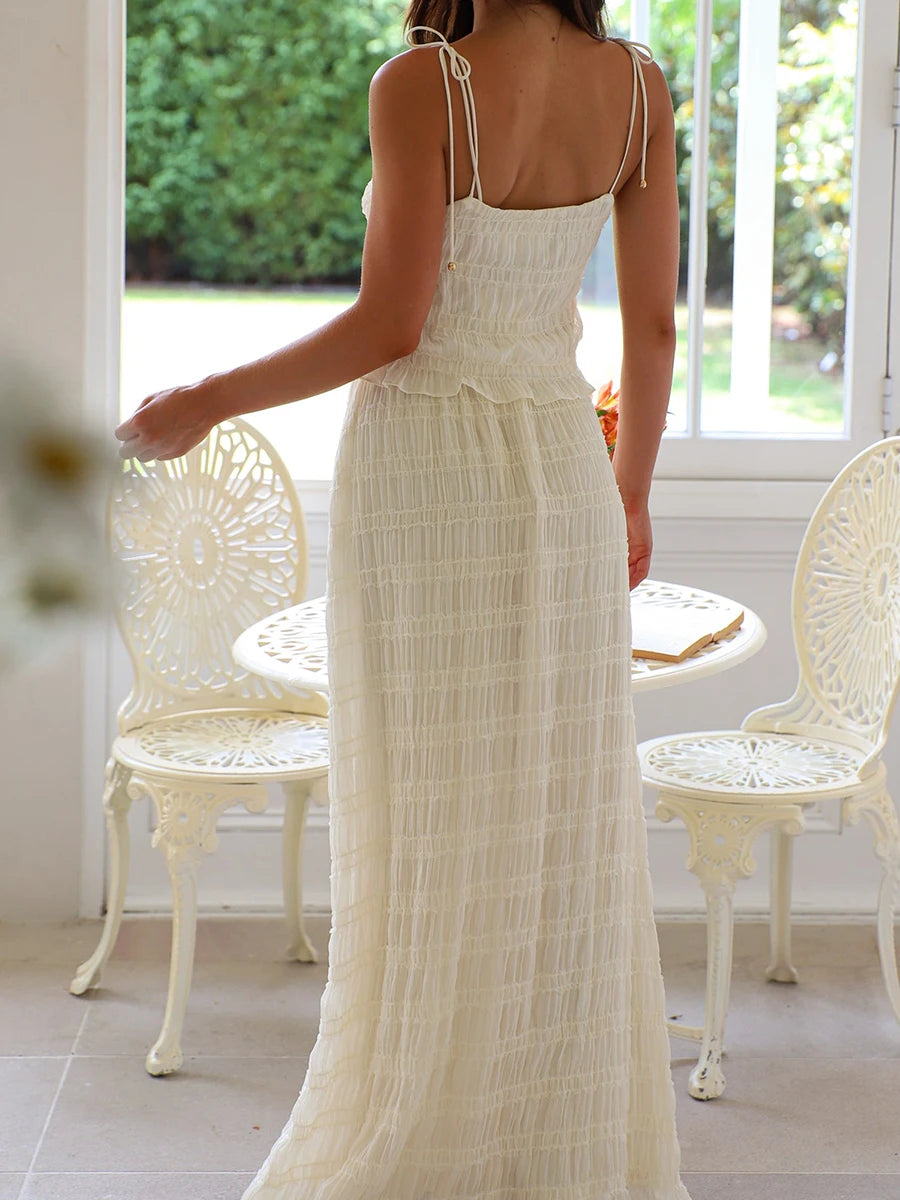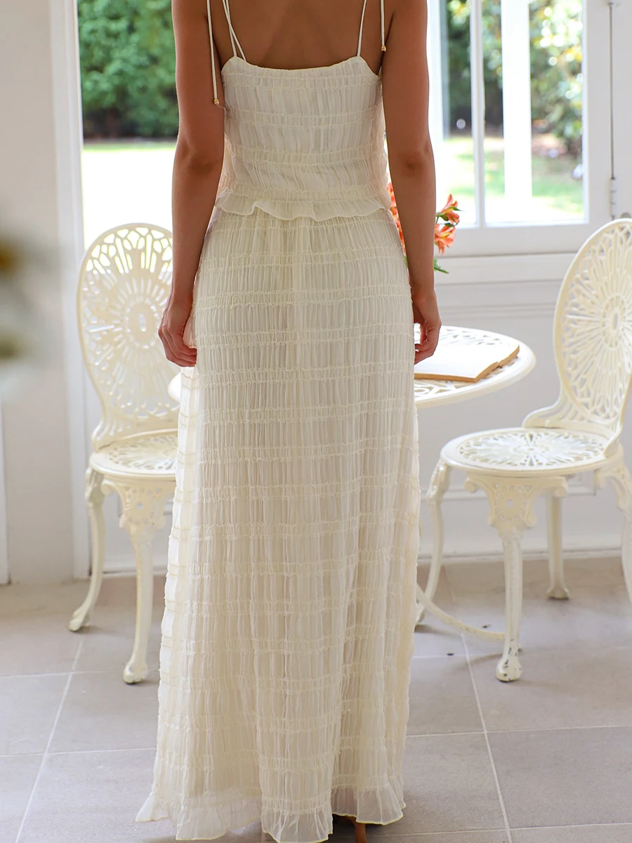 GETADME 섹시 여성 보헤미안 2피스 세트 비치 셔링 백리스 스파게티 스트랩 캐미솔+맥시 스커트 홀리데이 바캉스 클럽웨어 매칭 슈트
