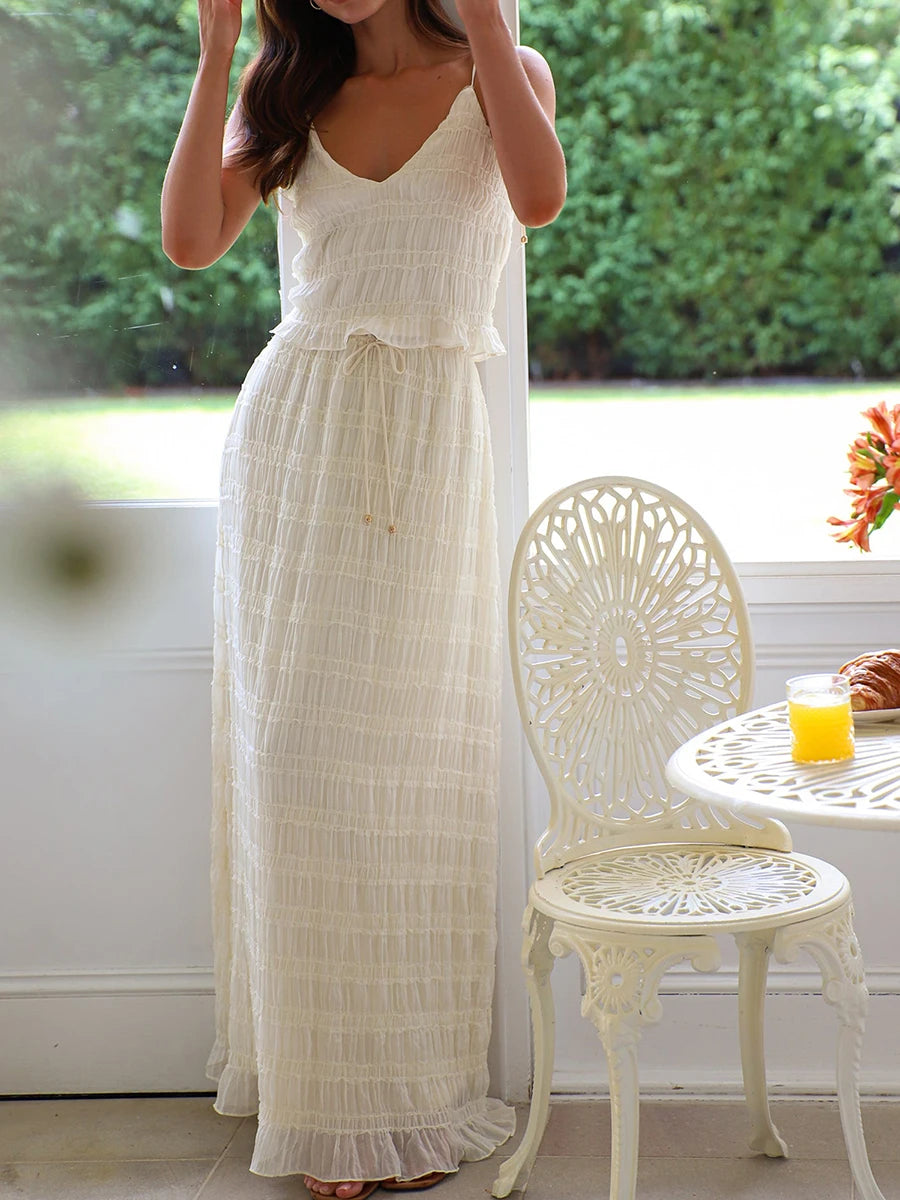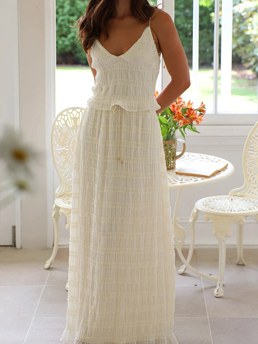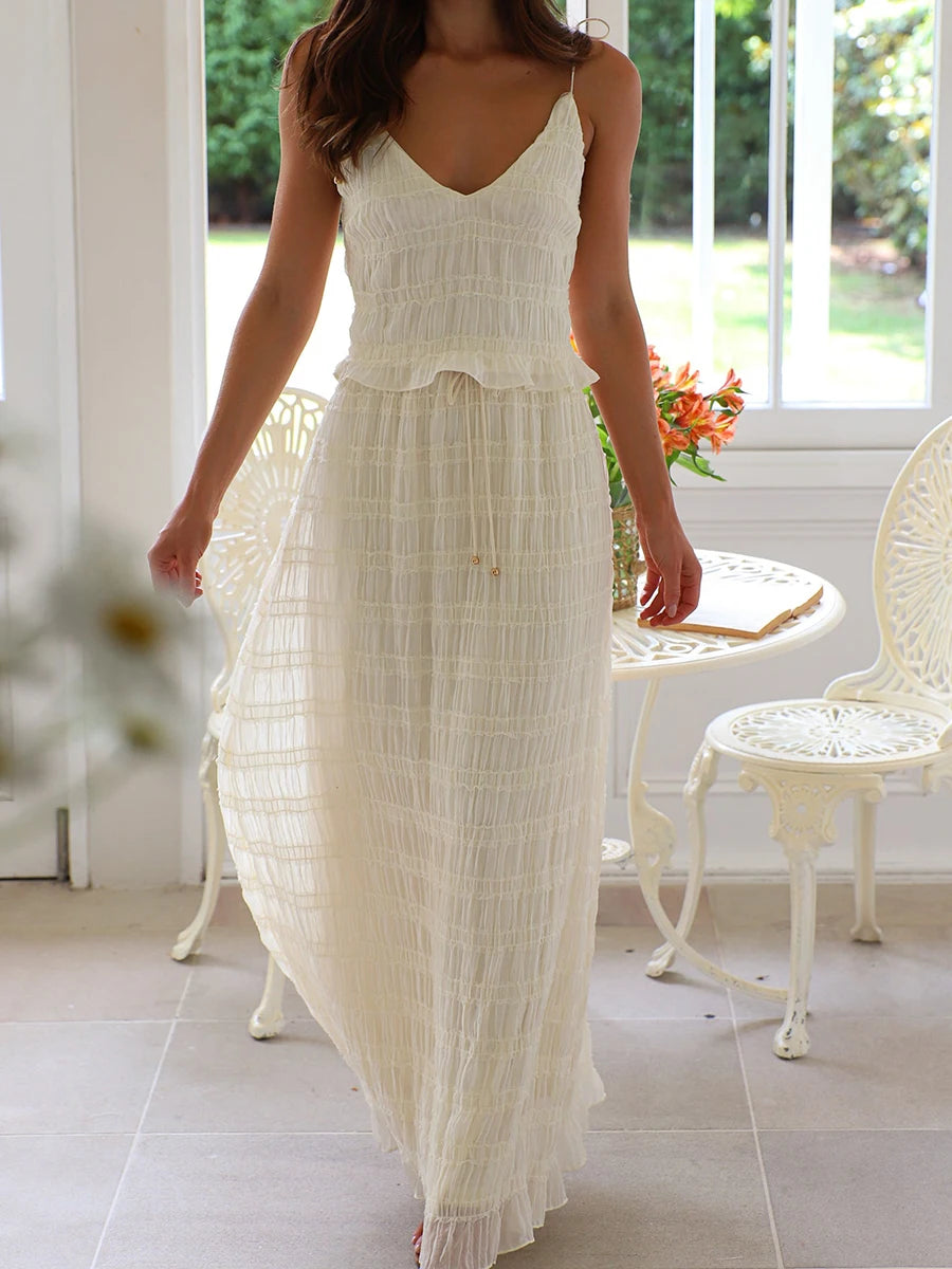 GETADME 섹시 여성 보헤미안 2피스 세트 비치 셔링 백리스 스파게티 스트랩 캐미솔+맥시 스커트 홀리데이 바캉스 클럽웨어 매칭 슈트