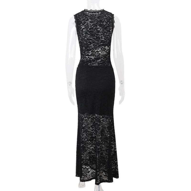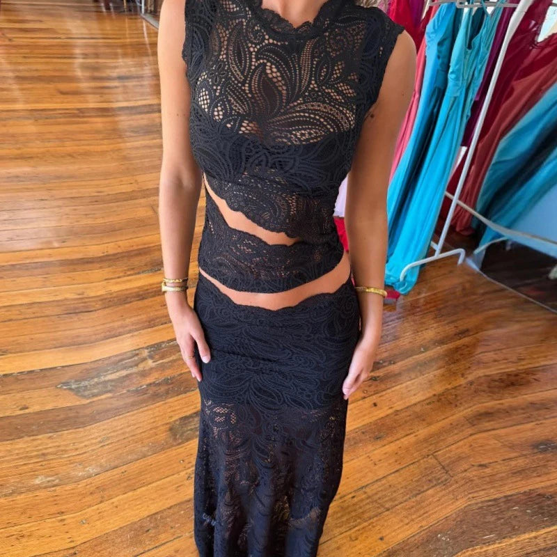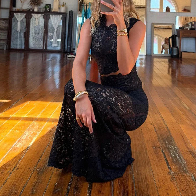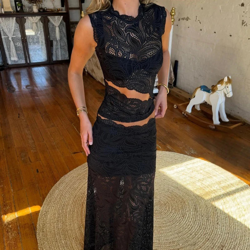 Getadme 섹시 여성 패션 레이스 시스루 투피스 세트 중공 불규칙한 시스루 크롭 탑 및 하이웨이스트 스커트 클럽웨어