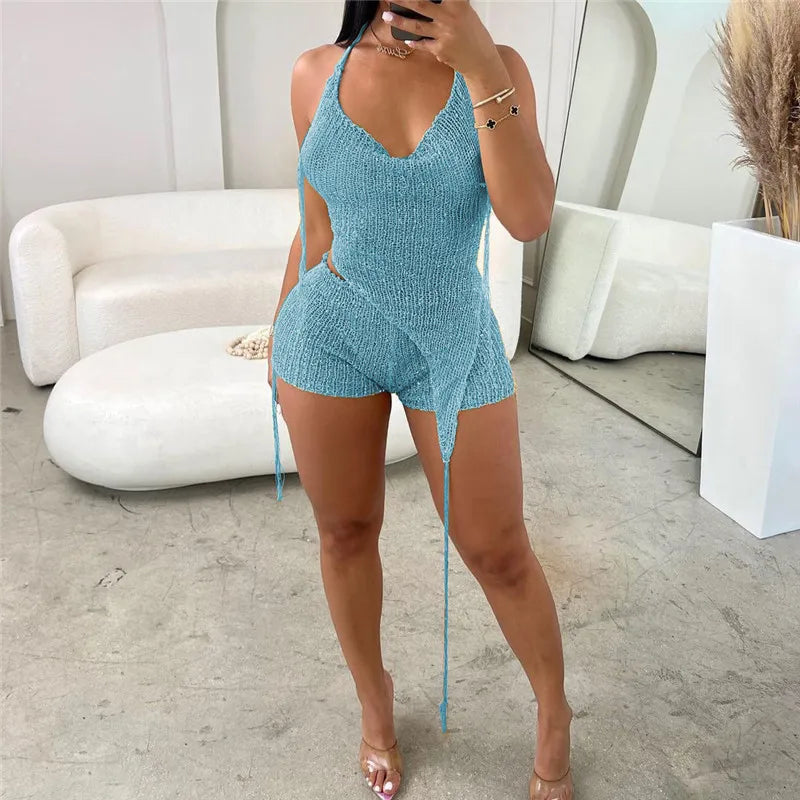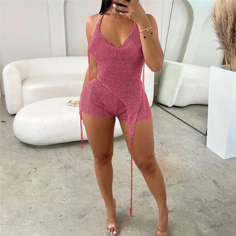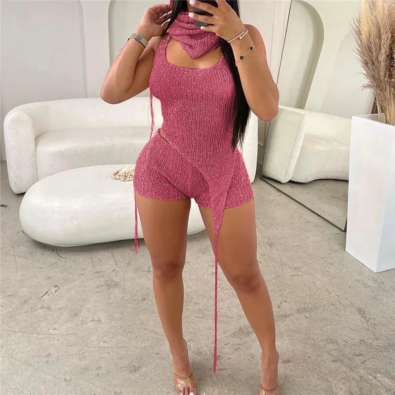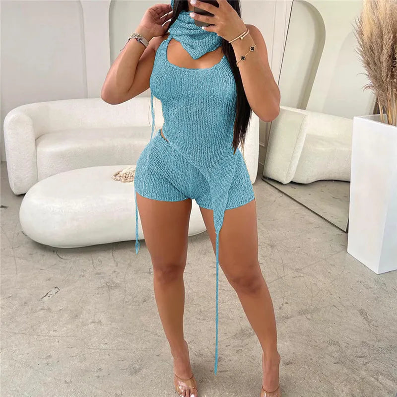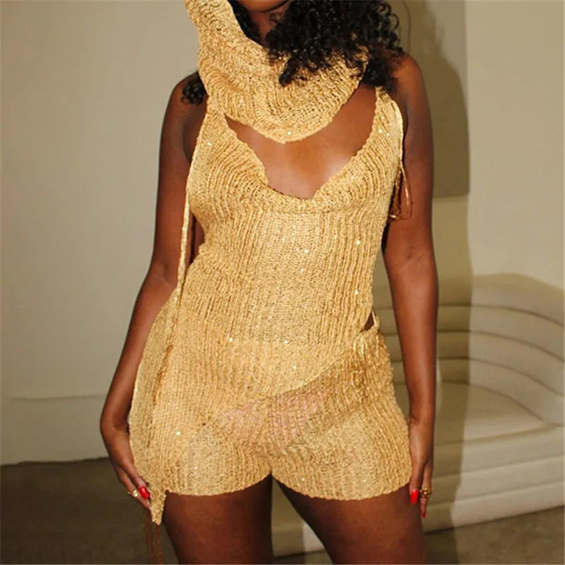 GETADME 반짝이는 스팽글 크로셰 후드 홀터 크롭 탑 & 스키니 반바지 3피스 세트, 섹시 백리스 힙스터 레이브 Y2K 매칭 의상