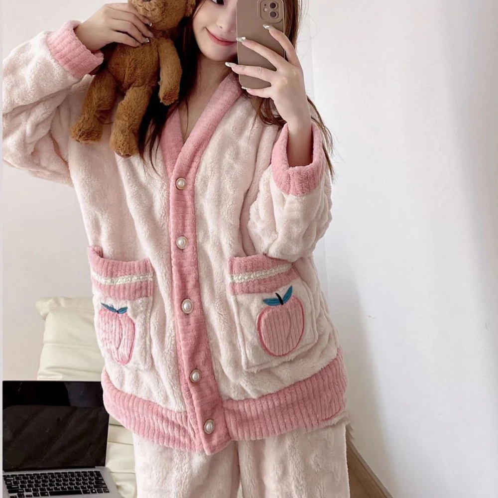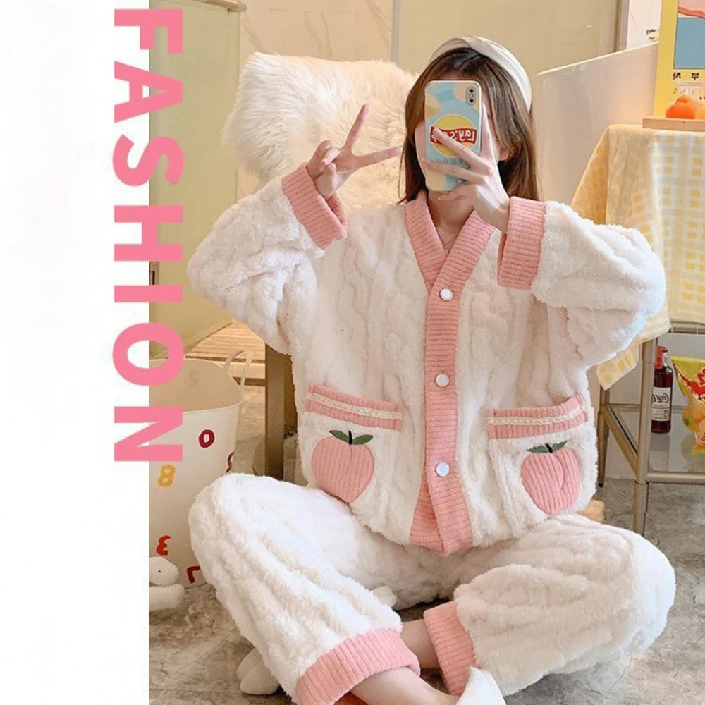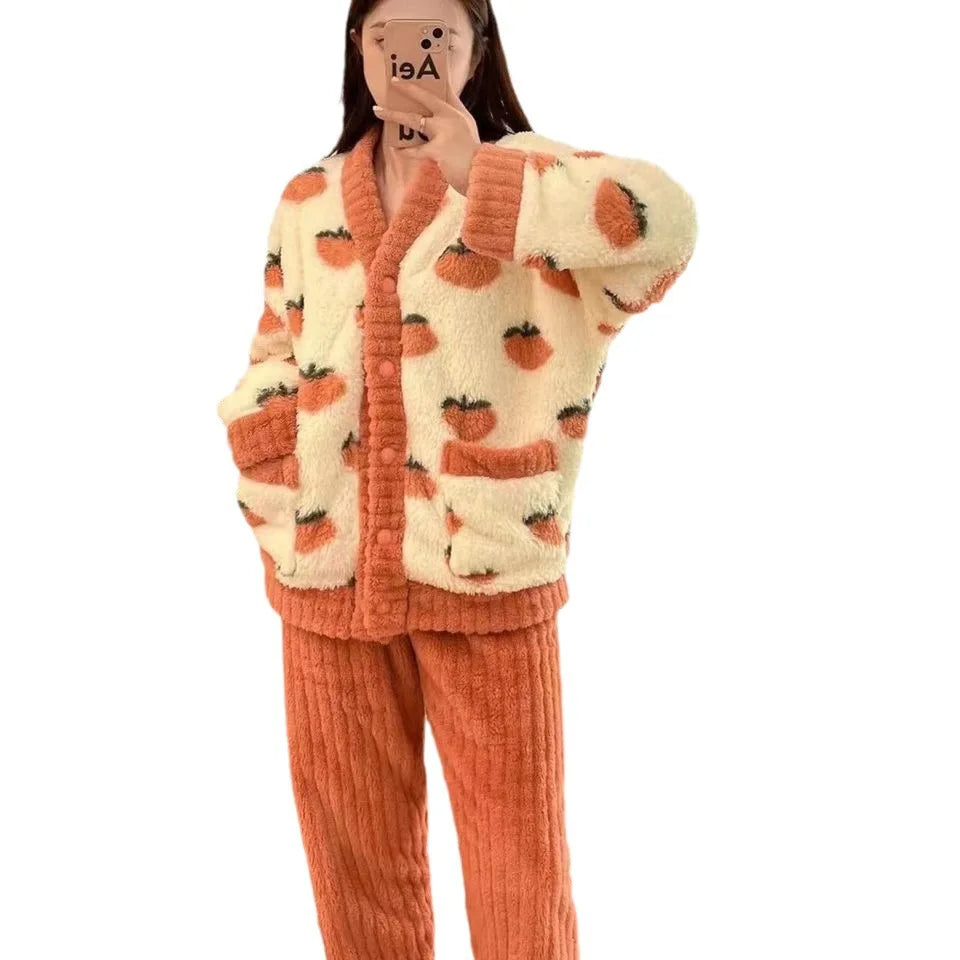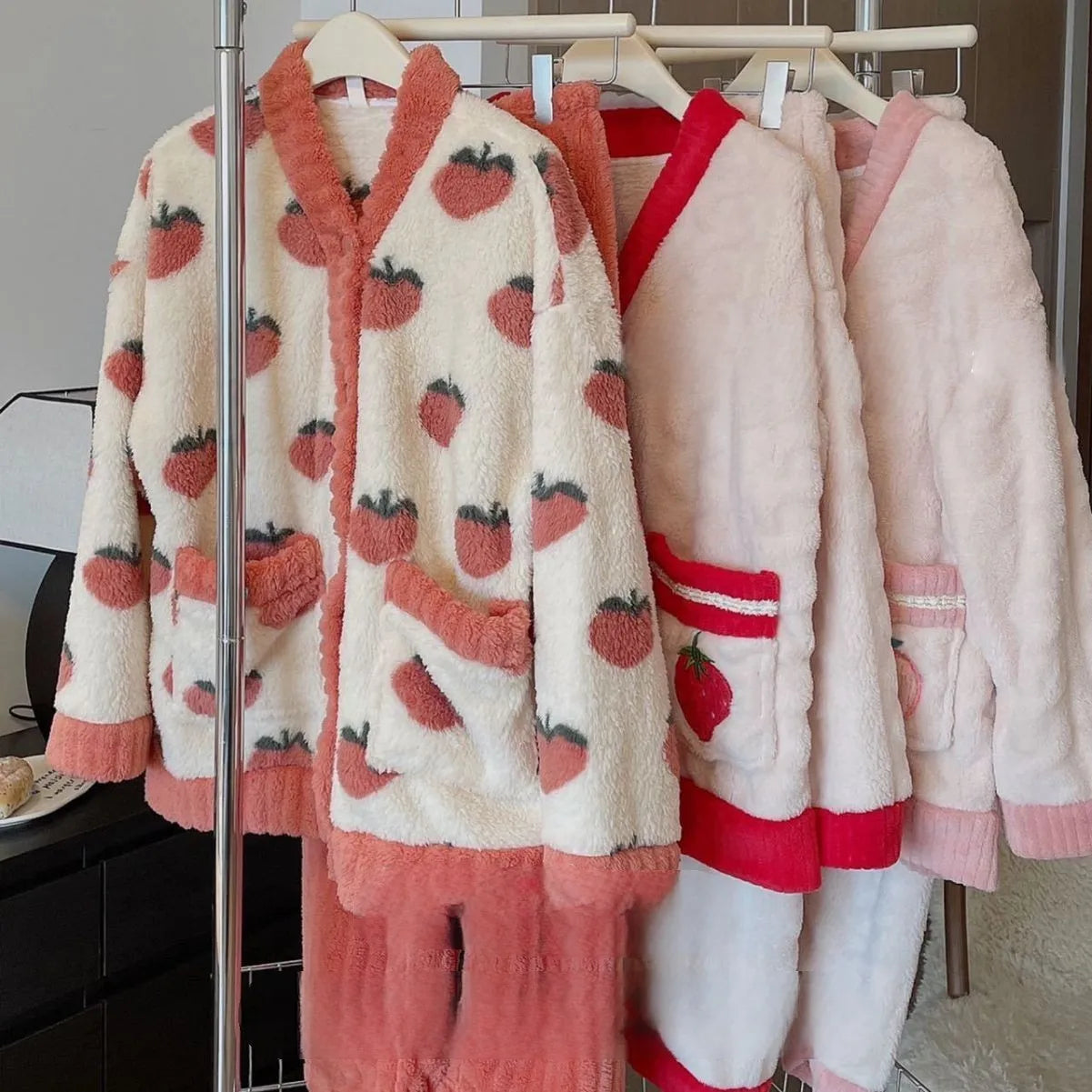 GETADME 딸기 프린트 잠옷 여성 파자마 세트 겨울 플리스 벨벳 1세트 홈 수트 수면 푹신한 한국식 피아마 따뜻한 나이트웨어 신제품