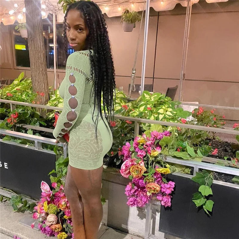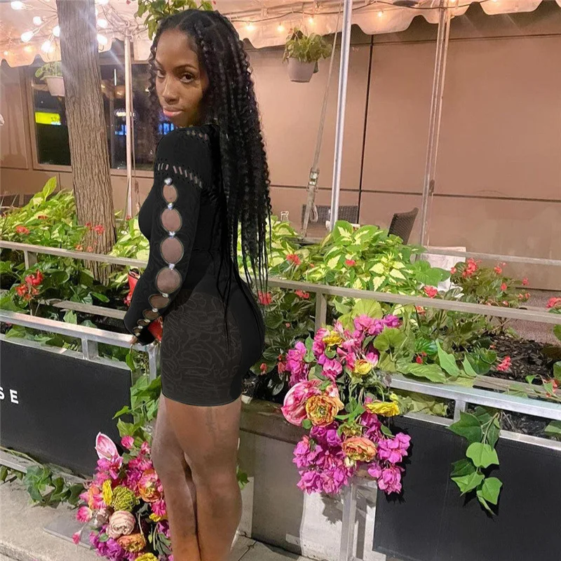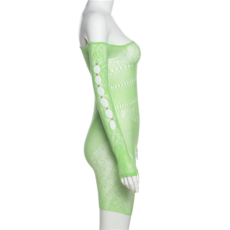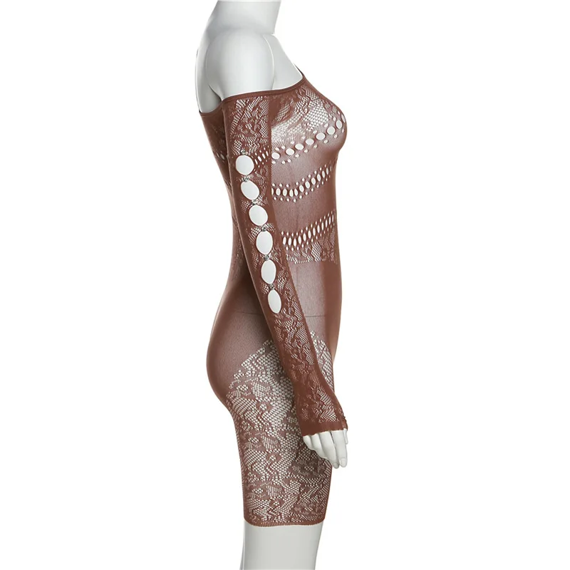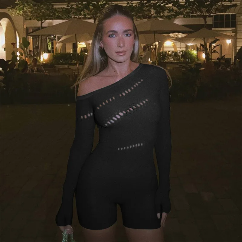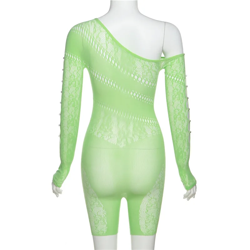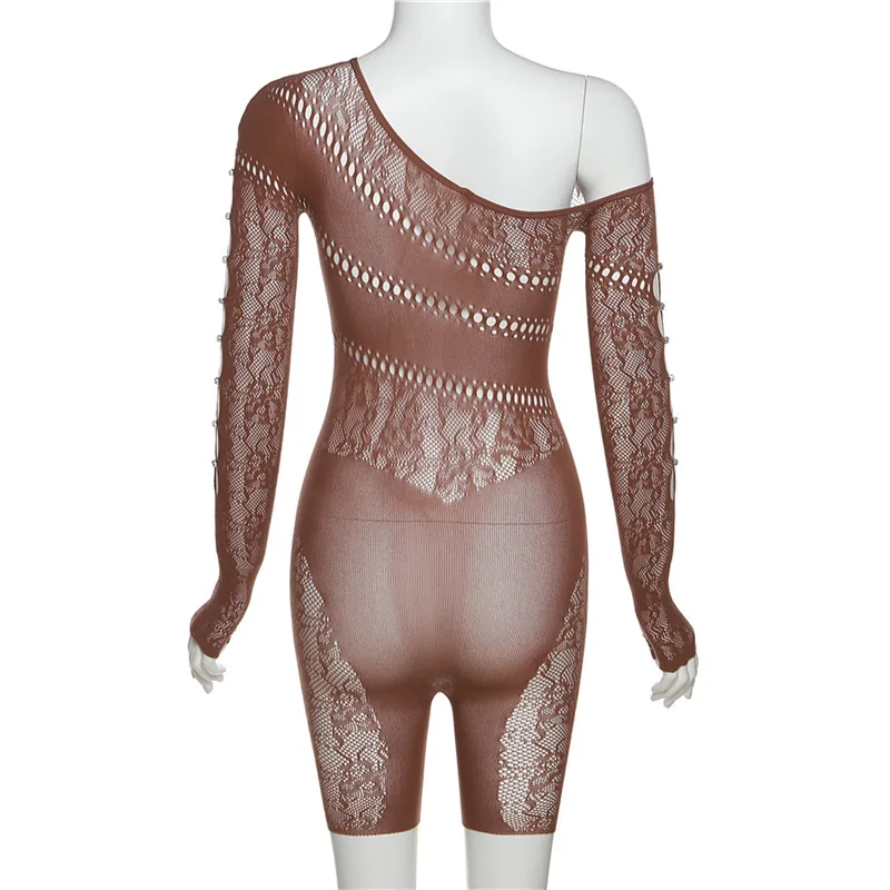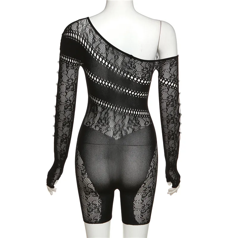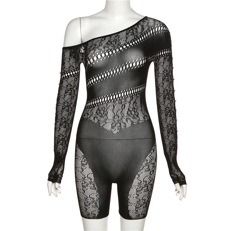 GETADME 여름 레이스 중공 메시 시스루 플레이수트 여성 니트 섹시 원숄더 긴팔 스키니 원피스 오버올 의상