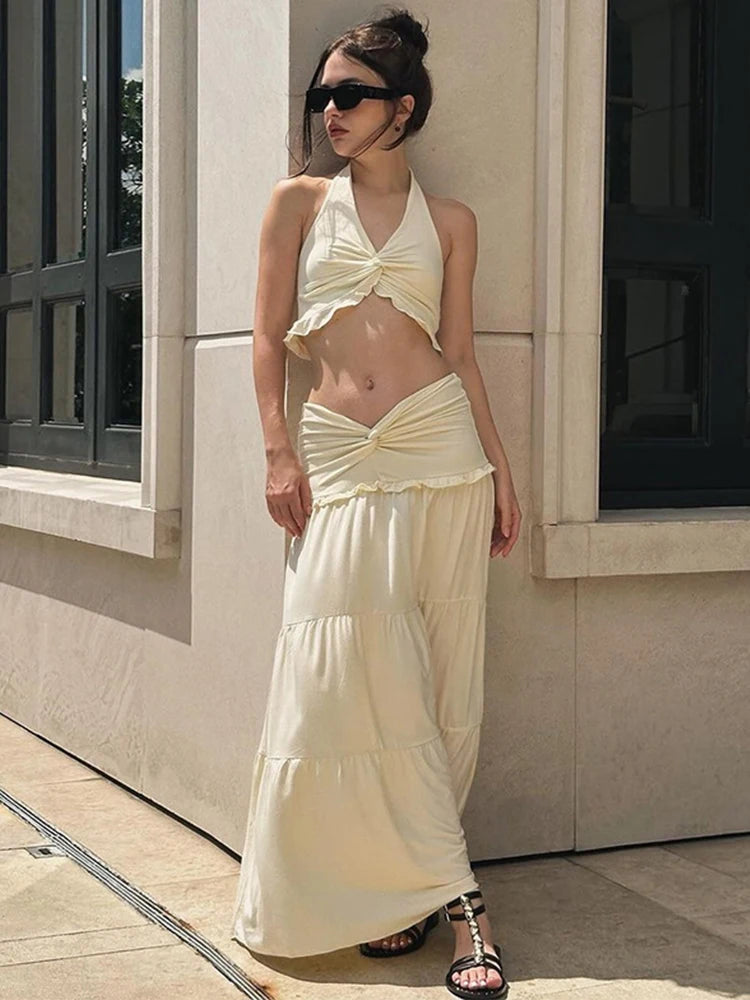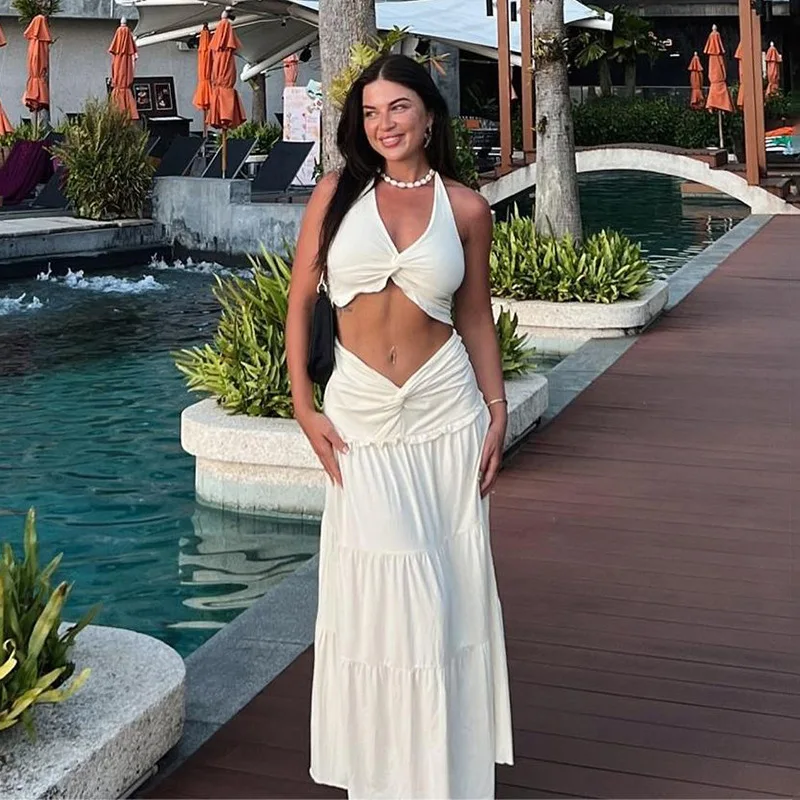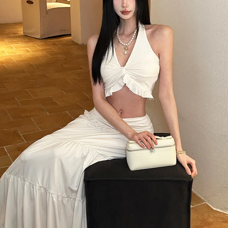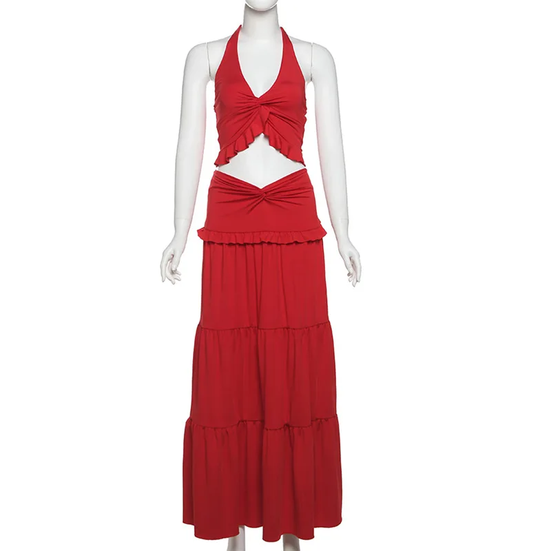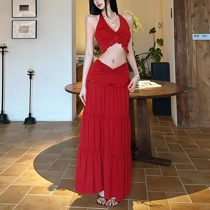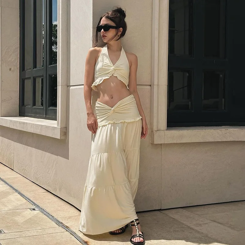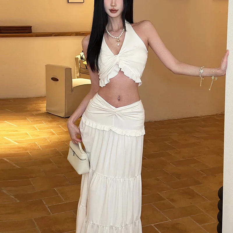 GETADME Trendix 플리츠 패치워크 러플 드레스 세트 여성용 V넥 백리스 레이스업 브라 바캉스 섹시 비치 롱 스커트 투피스 슈트