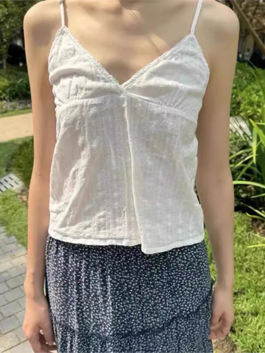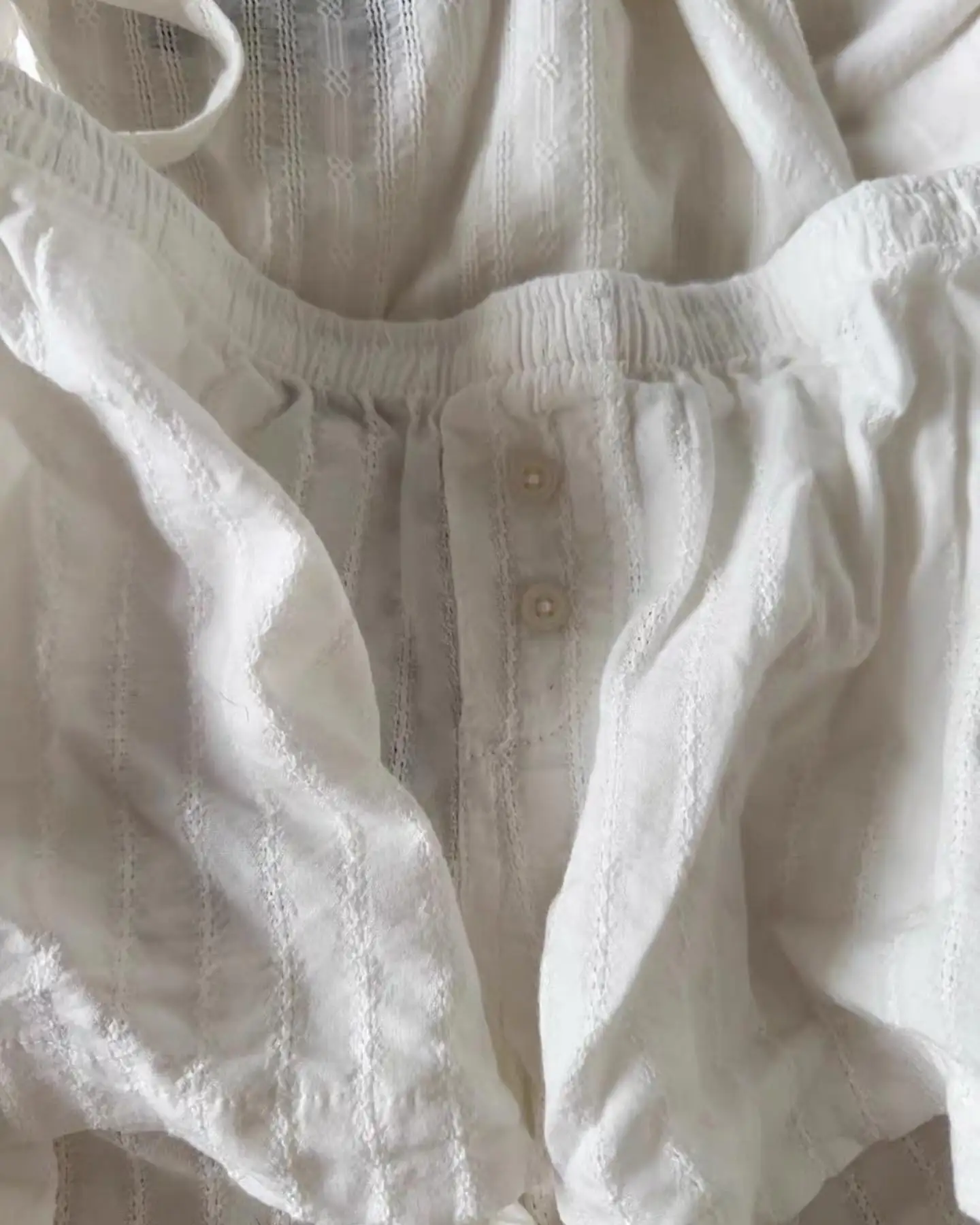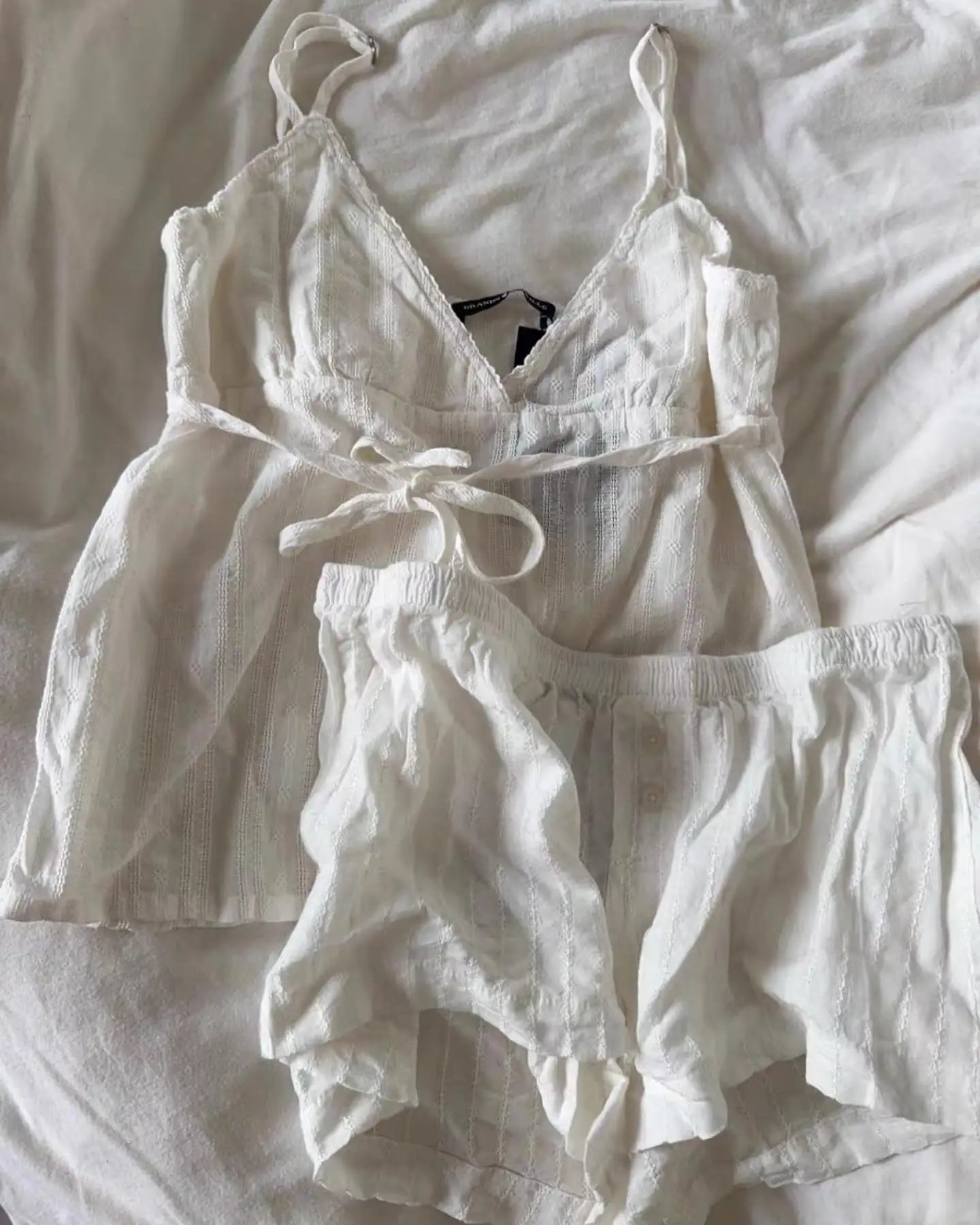 GETADME 화이트 아이릿 홈 코지 2피스 세트 여성 레이스 트림 V넥 레이스업 탱크탑+단추 반바지 여름 스위트 시크 캐주얼 파자마 슈트