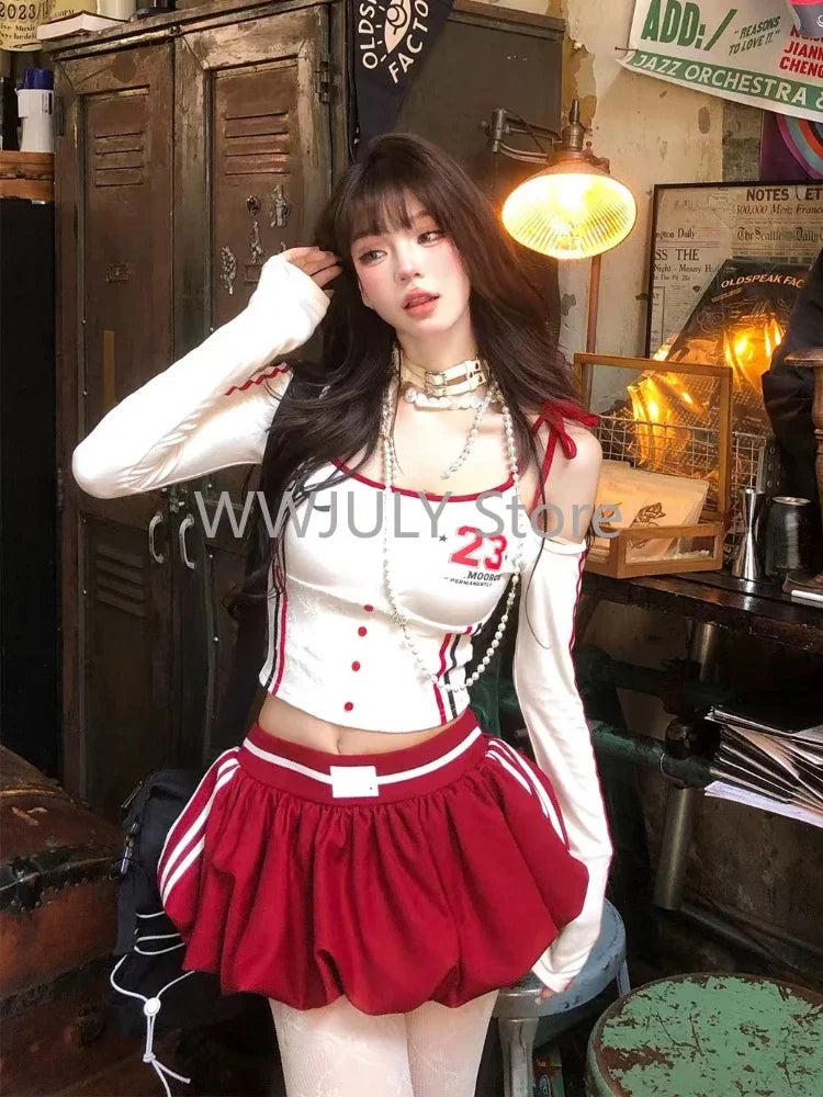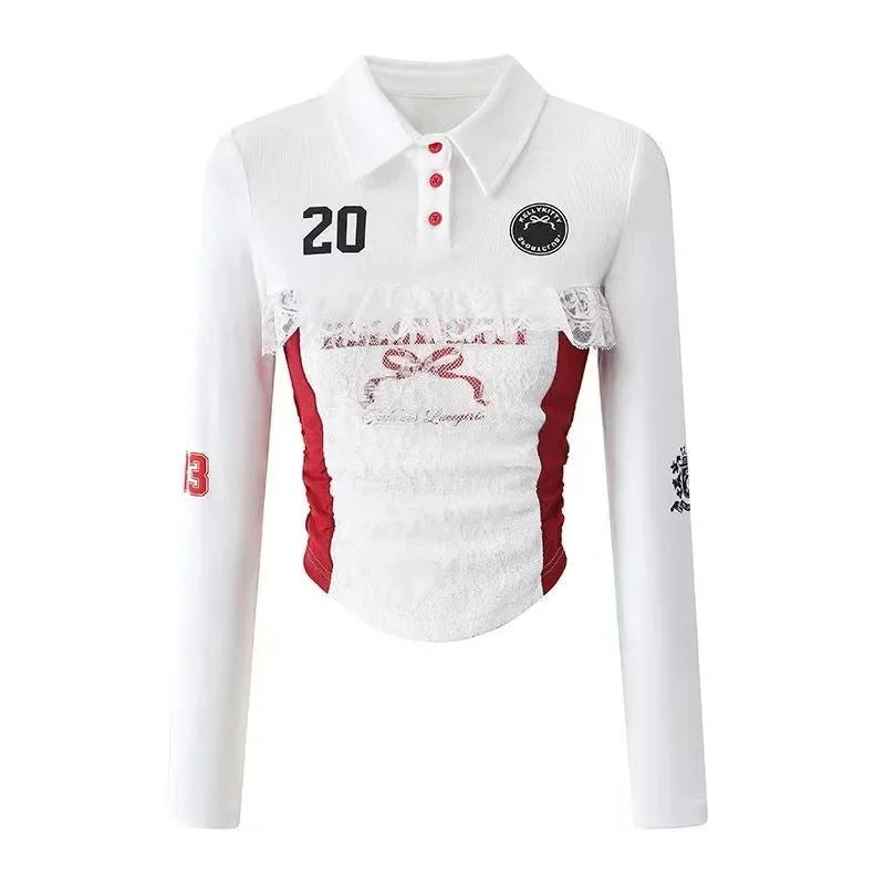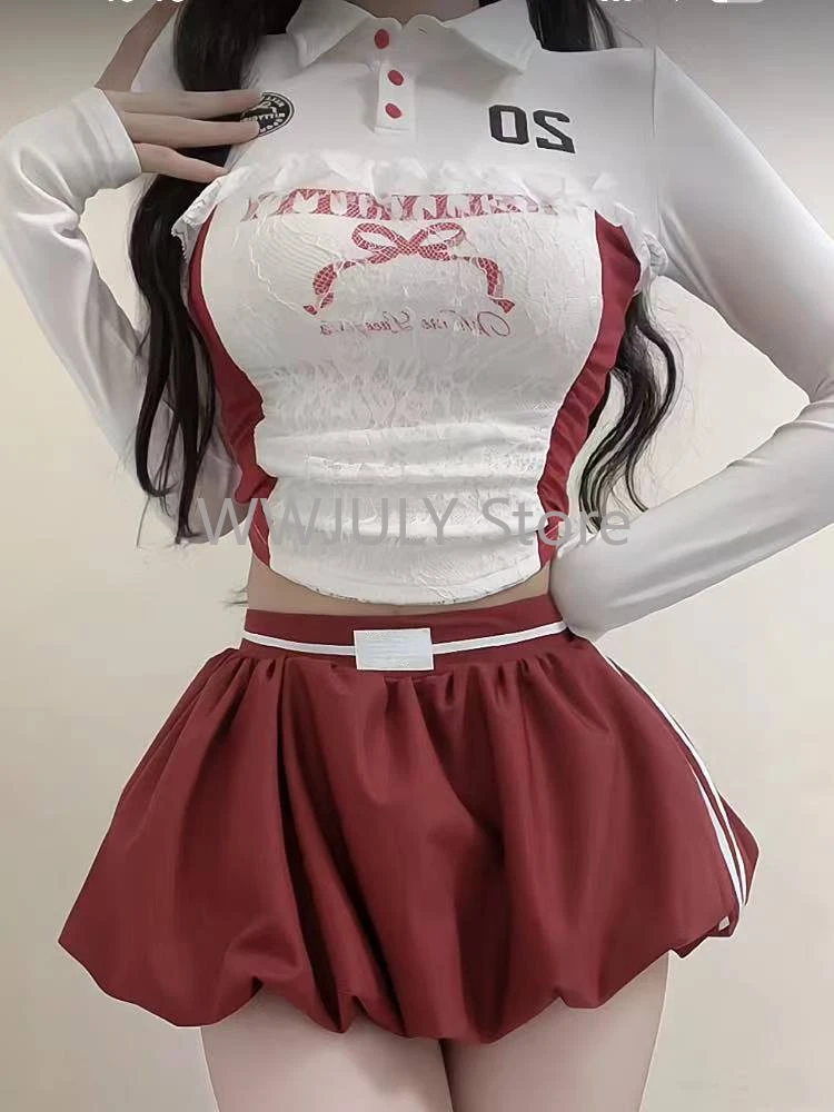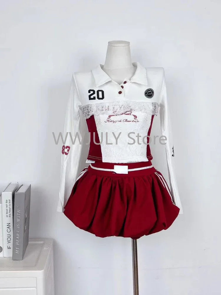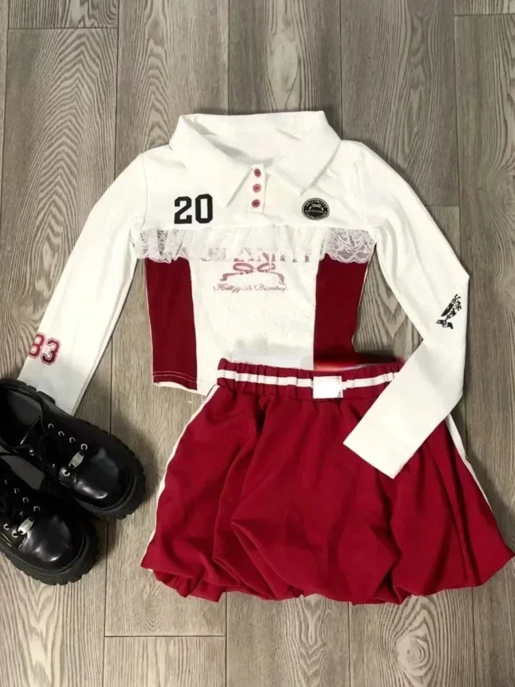 GETADME 여성 가을 예쁜 스타일 슬림 2피스 세트 여성 E-girls 긴팔 라펠 얇은 상의 여성 + 레이스 패치워크 미니 스커트 세련된