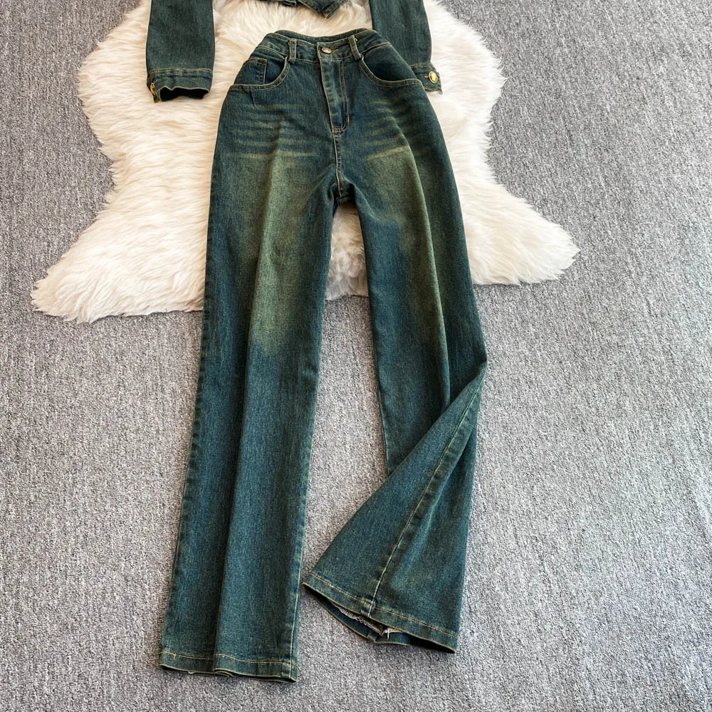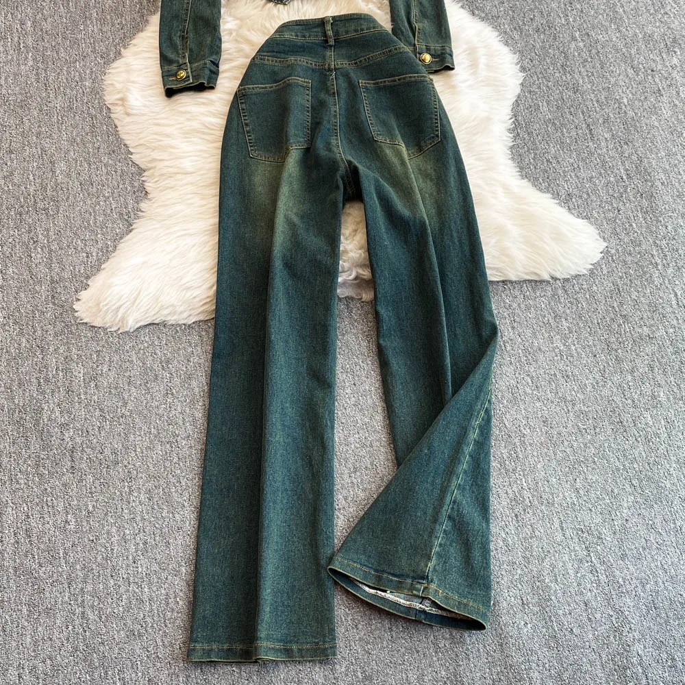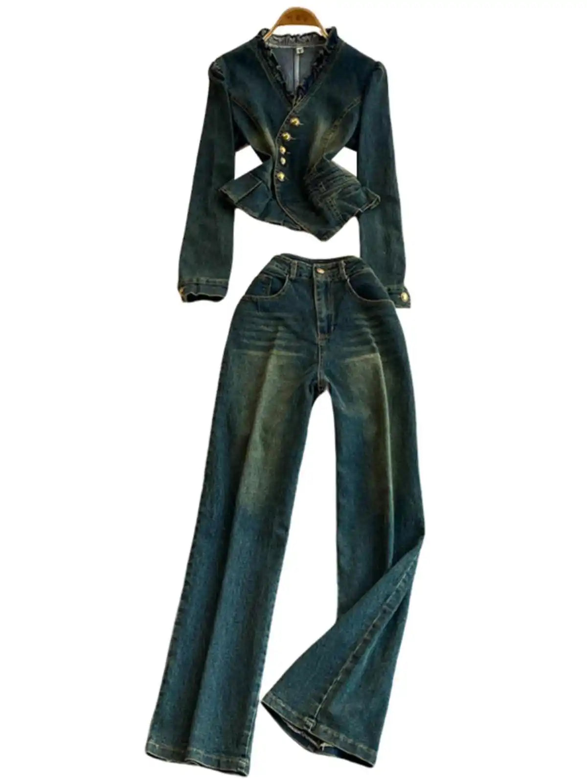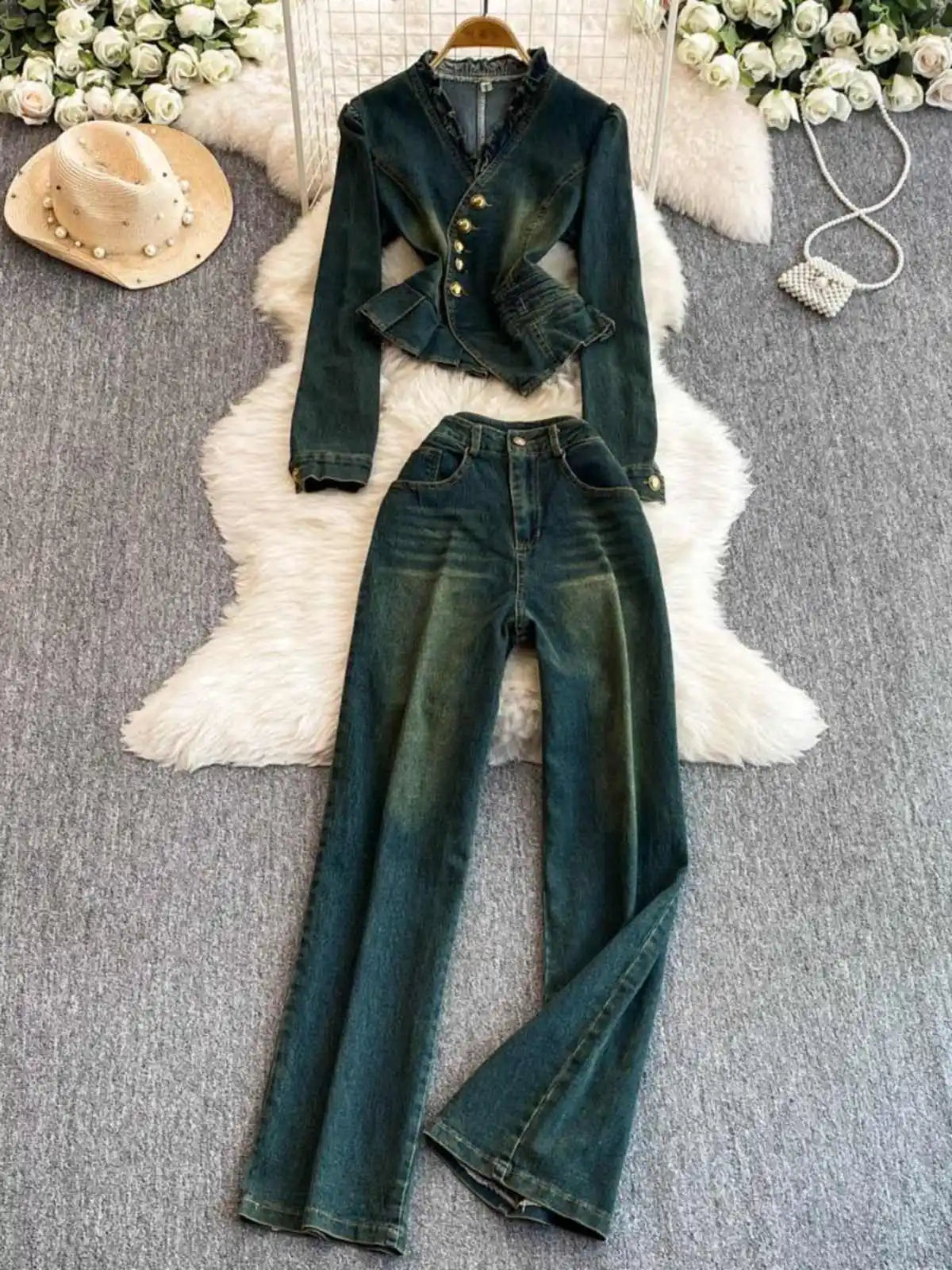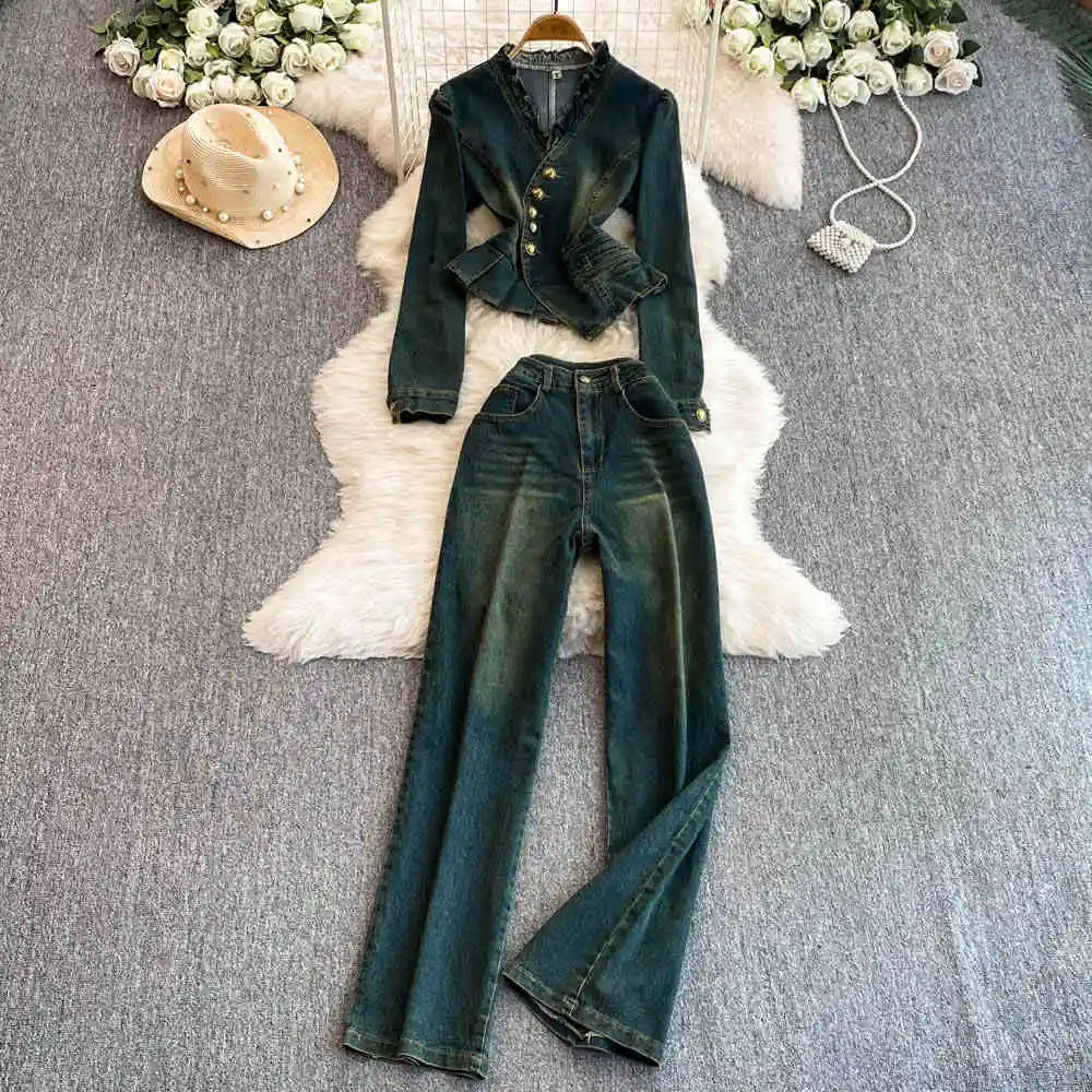GETADME 여성 패션 데님 롱 팬츠 슈트 봄 V넥 골드 버튼 슬림 코트+하이웨이스트 스트레이트 진 투피스 세트