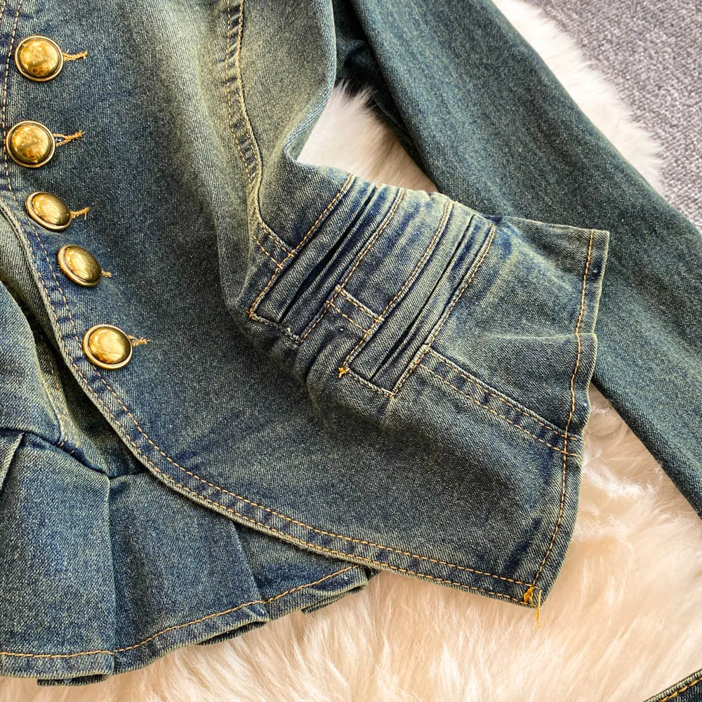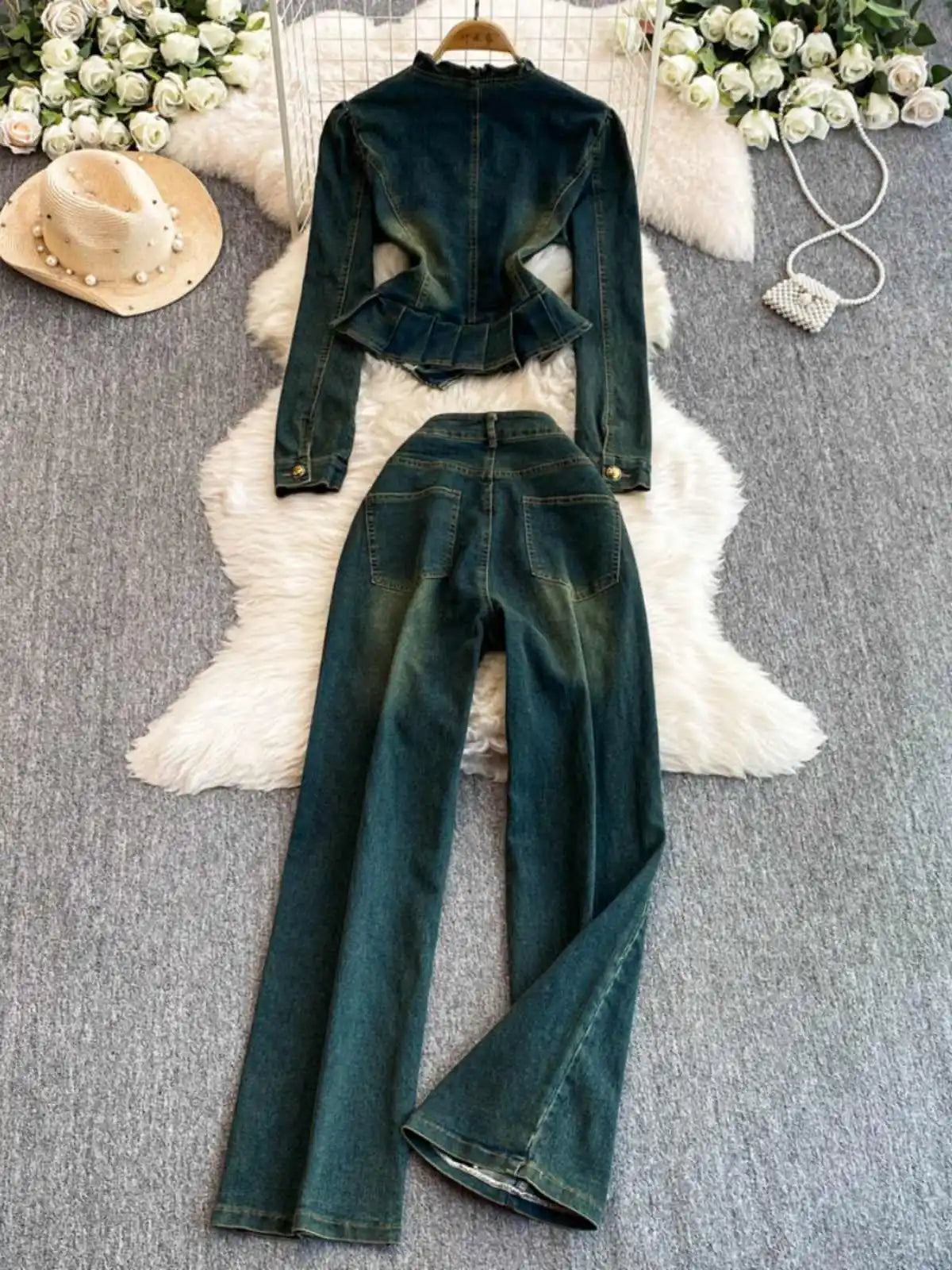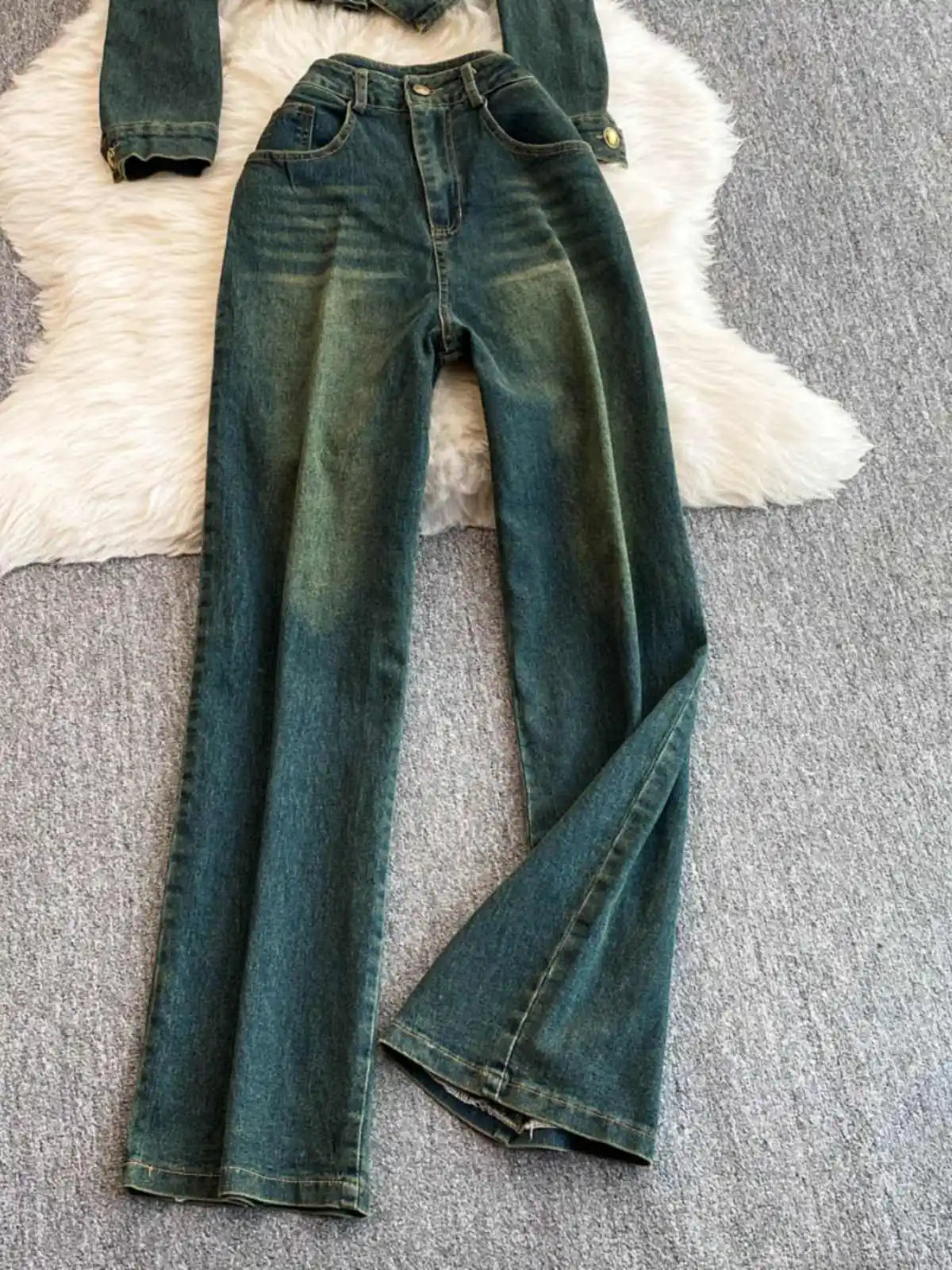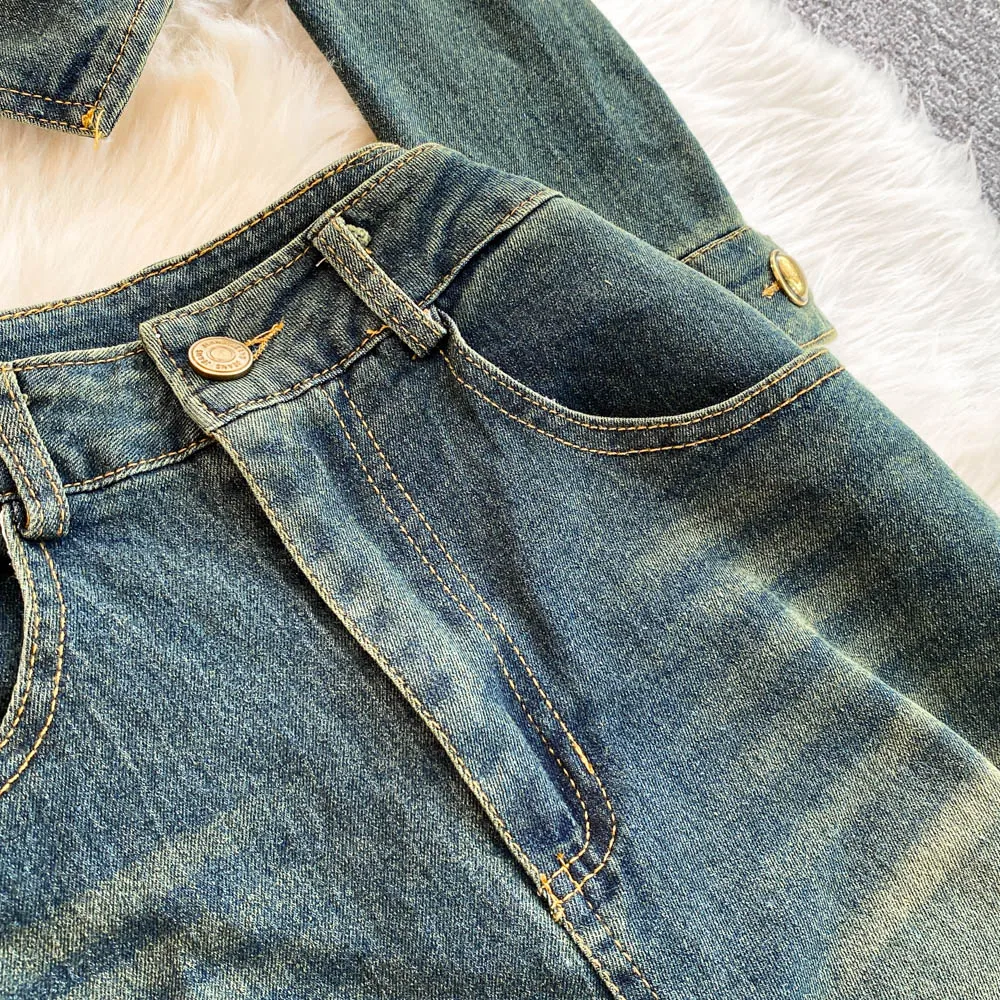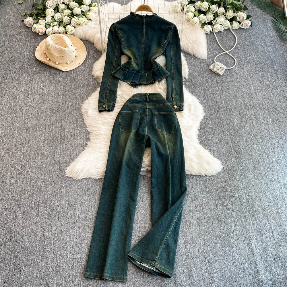 GETADME 여성 패션 데님 롱 팬츠 슈트 봄 V넥 골드 버튼 슬림 코트+하이웨이스트 스트레이트 진 투피스 세트