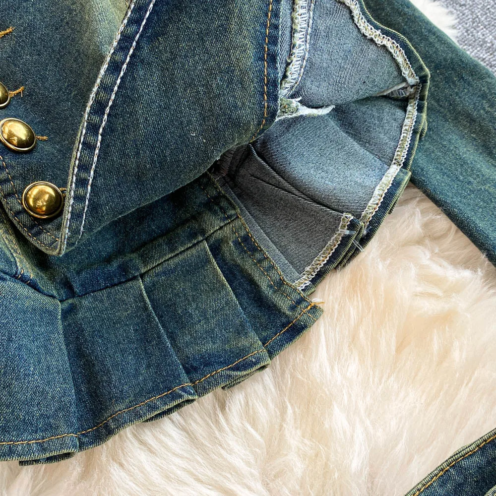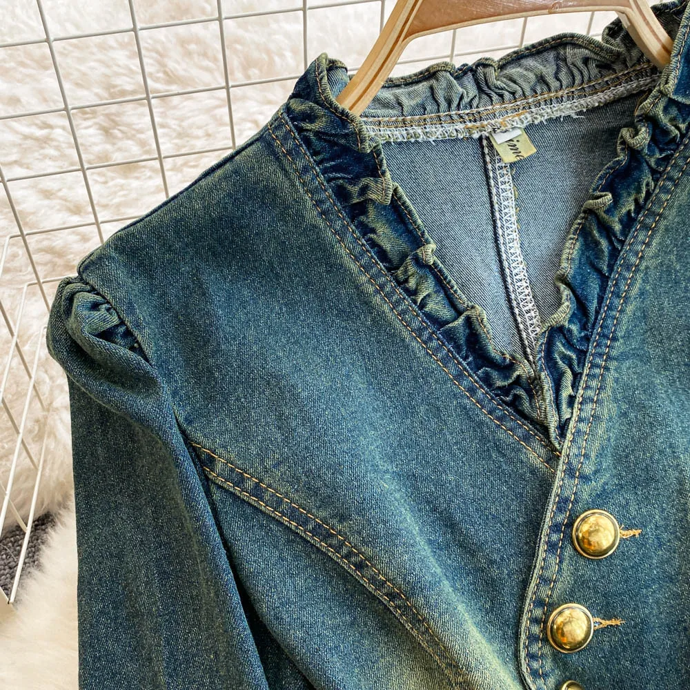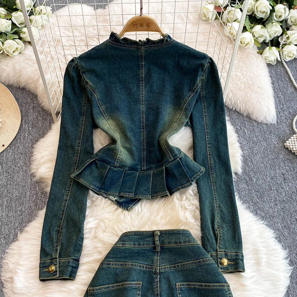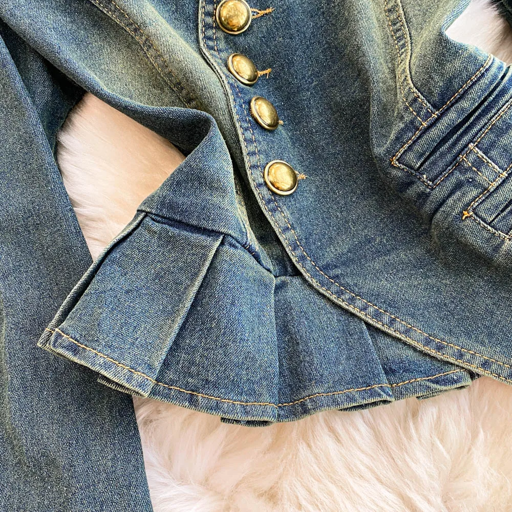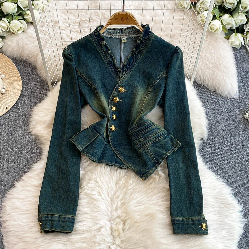 GETADME 여성 패션 데님 롱 팬츠 슈트 봄 V넥 골드 버튼 슬림 코트+하이웨이스트 스트레이트 진 투피스 세트