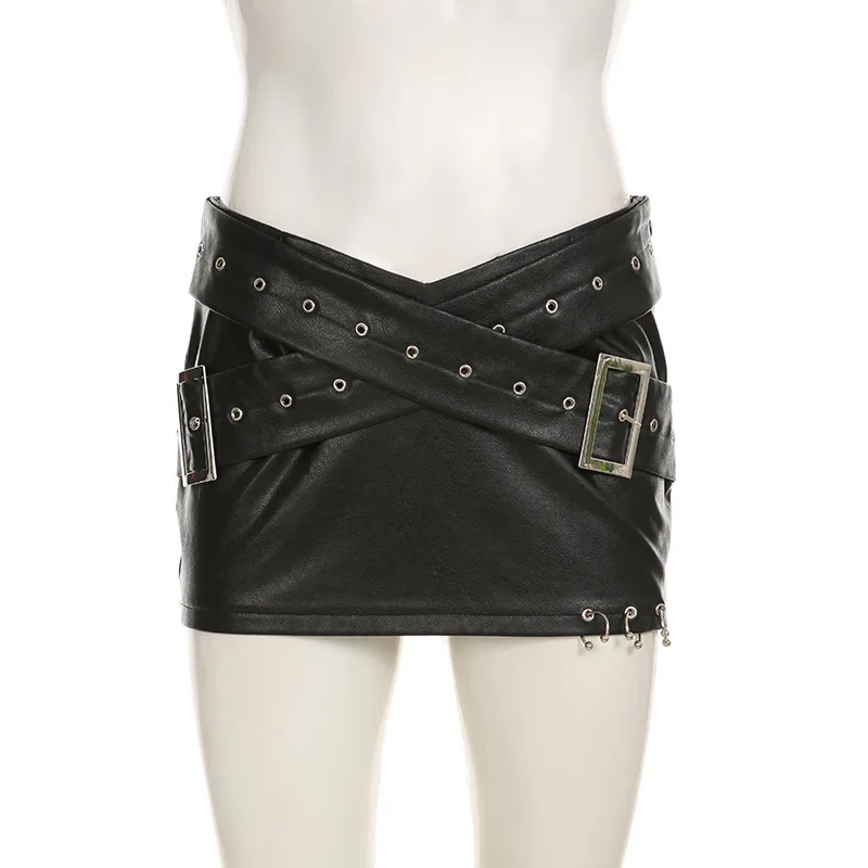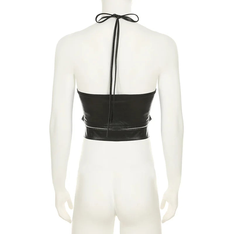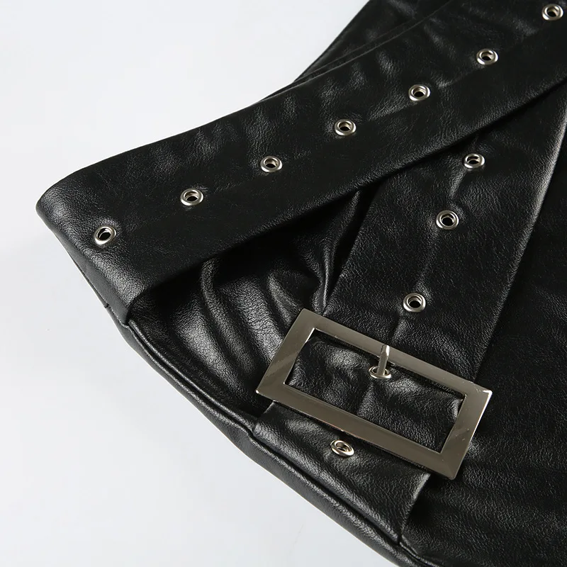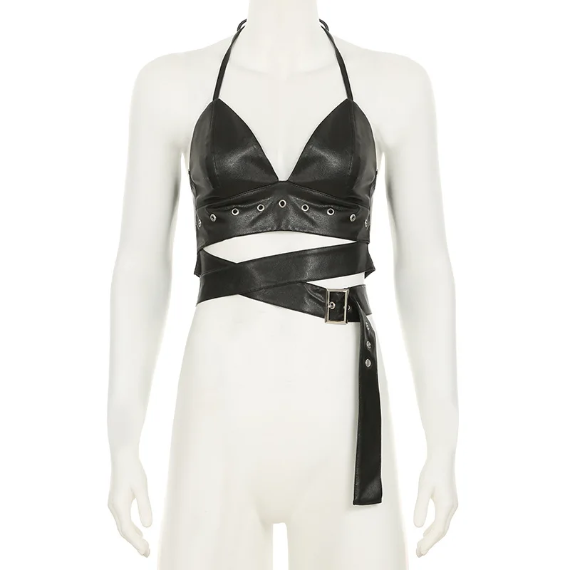 GETADME 여성 섹시 그로밋 버클 벨트 PU 가죽 2피스 세트 레이스업 홀터넥 백리스 탱크 크롭 탑 + 바디콘 미니 스커트 클럽웨어 슈트