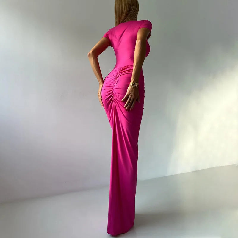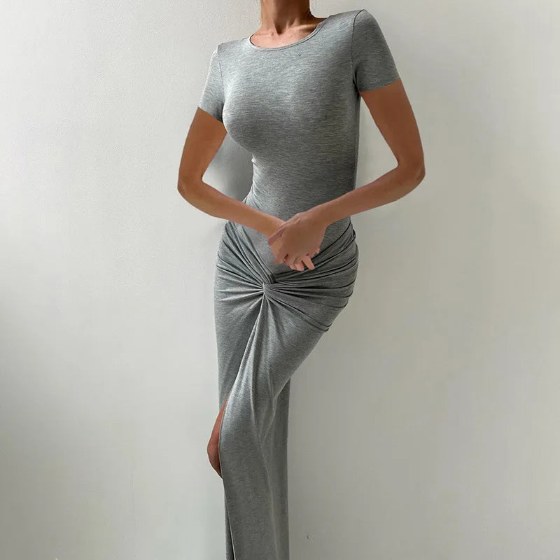 GETADME 여성 봄/여름 정장 솔리드 O넥 반팔 바디수트+셔링 스플릿 롱 스커트 캐주얼 하이스트리트 클럽 2피스 세트