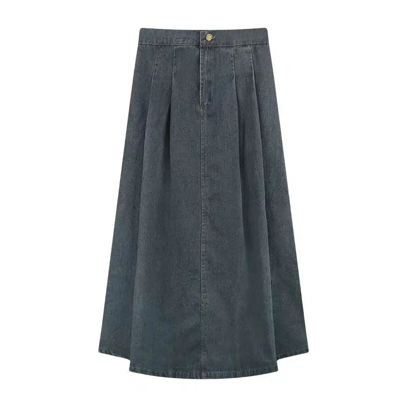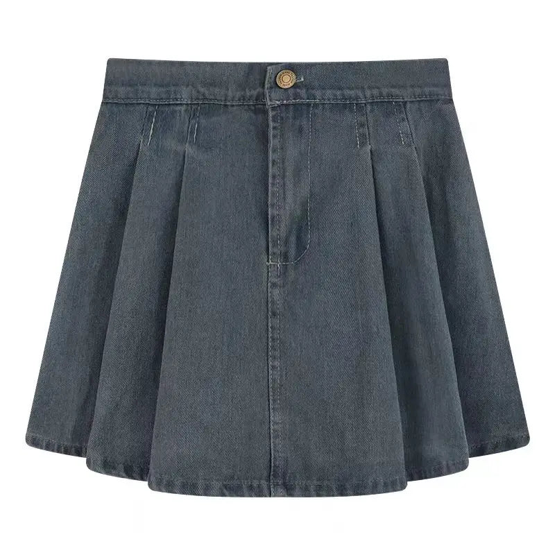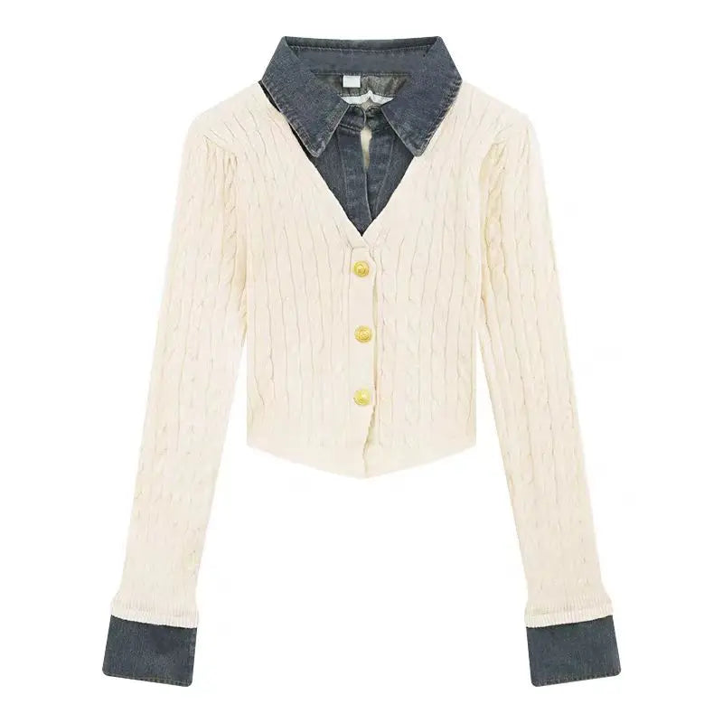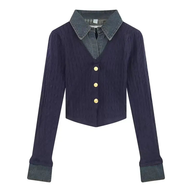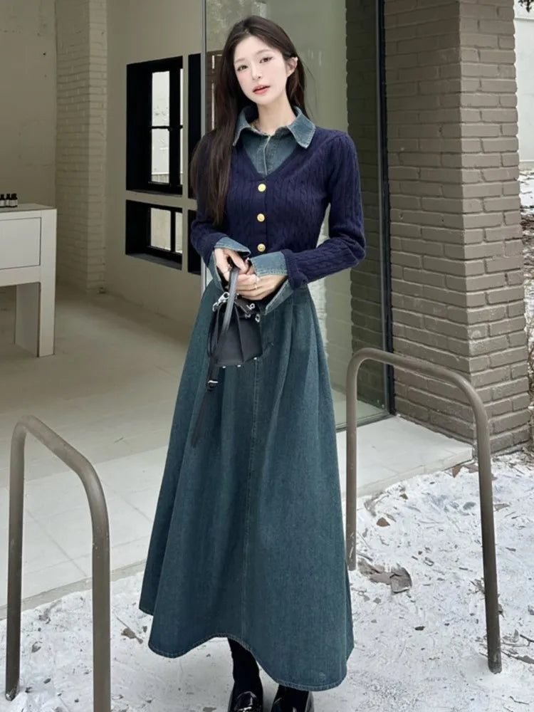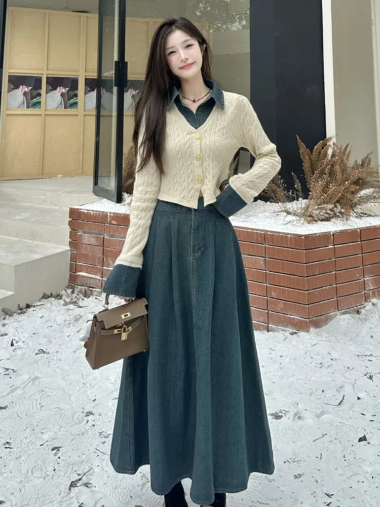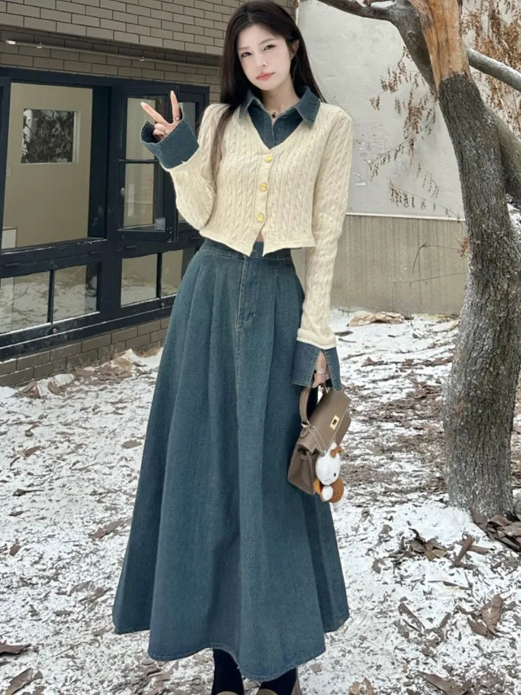 한국 스타일 스커트 세트 2피스 여성용 패치워크 니트 가짜 2피스 상의 데님 스커트 슬림 패션 정장 봄 가을