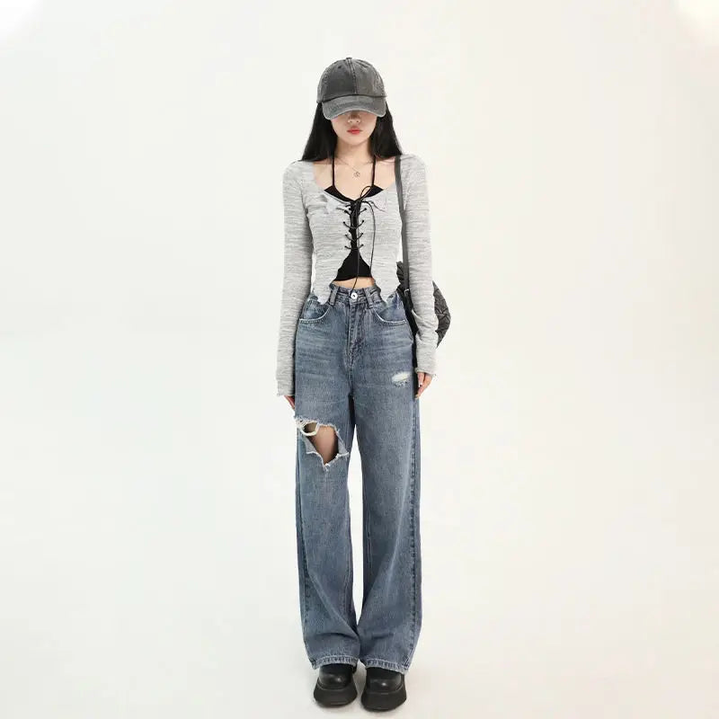 한국식 투피스 슈트 서스펜더 카디건 여성 가을 섹시 V넥 슬림 Y2K 크롭 긴팔 크로스 붕대 니트 상의