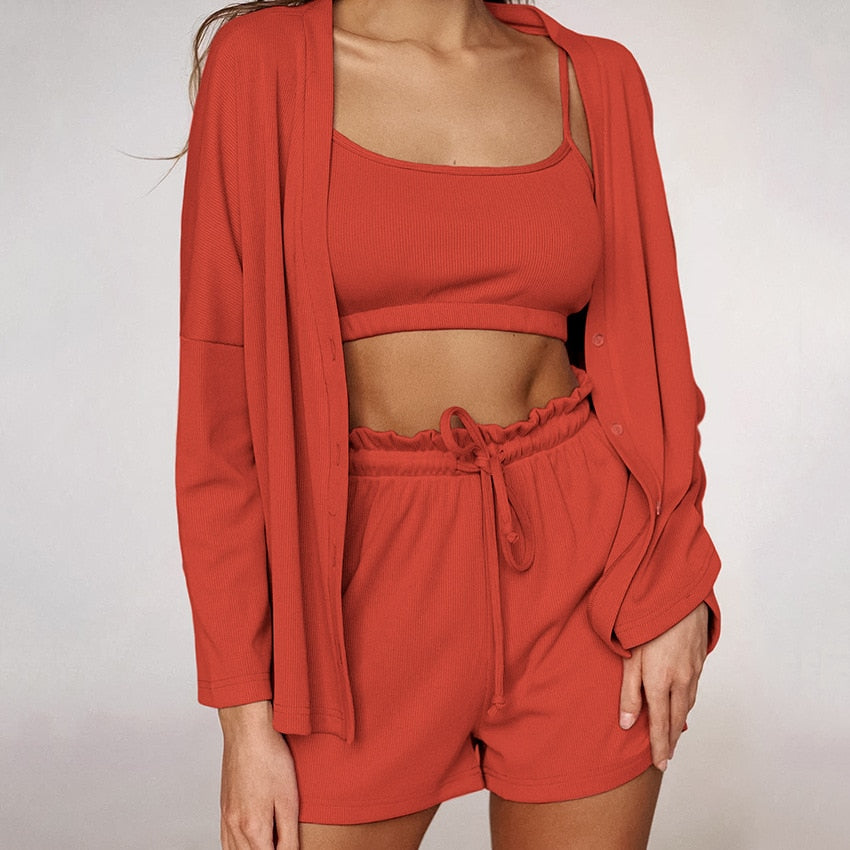 여성 잠옷 3피스 세트 니트 슬리브 탑 스파게티 스트랩 크롭 여성 캐주얼 반바지 가을 솔리드 섹시 잠옷 파자마 팬츠