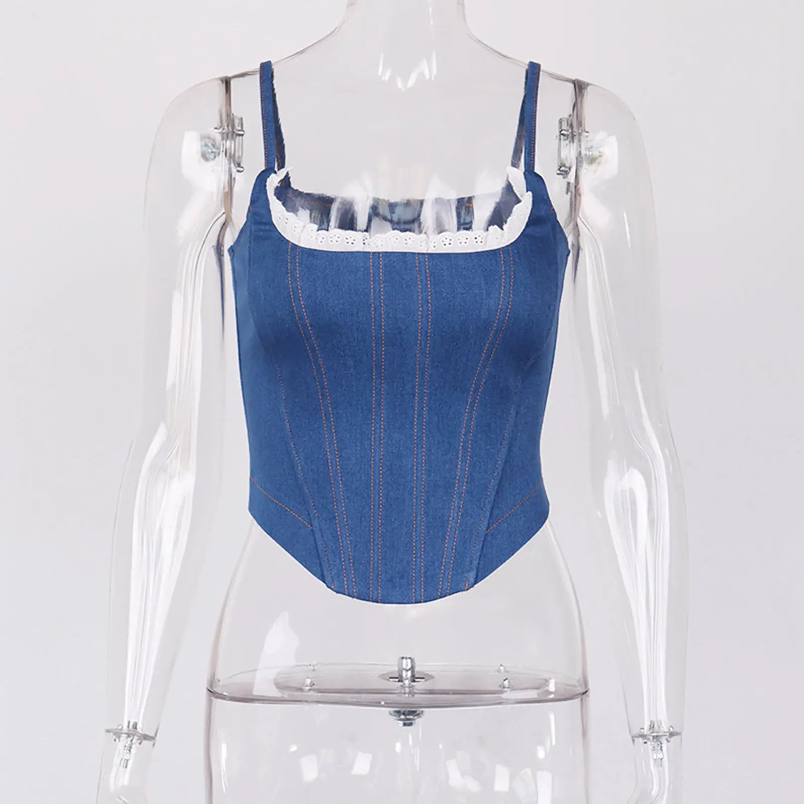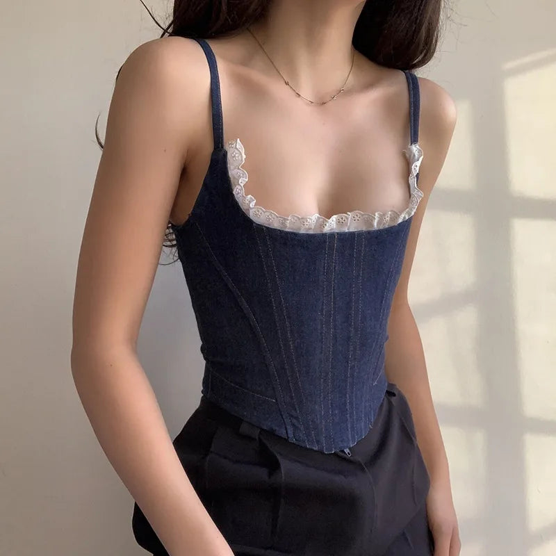 Getadme 섹시 레이스 트림 데님 캐미 탑 여성 백 지퍼 백리스 크롭 버스티에 코르셋 우아한 여성 여성 스트리트웨어 여름 청바지 조끼
