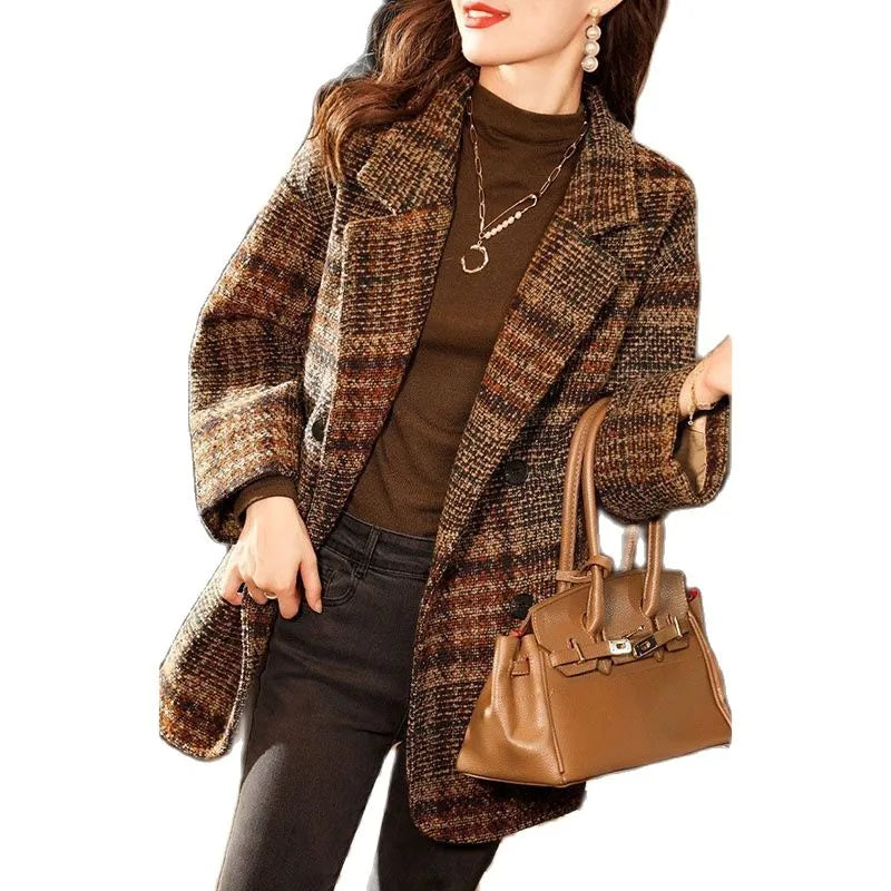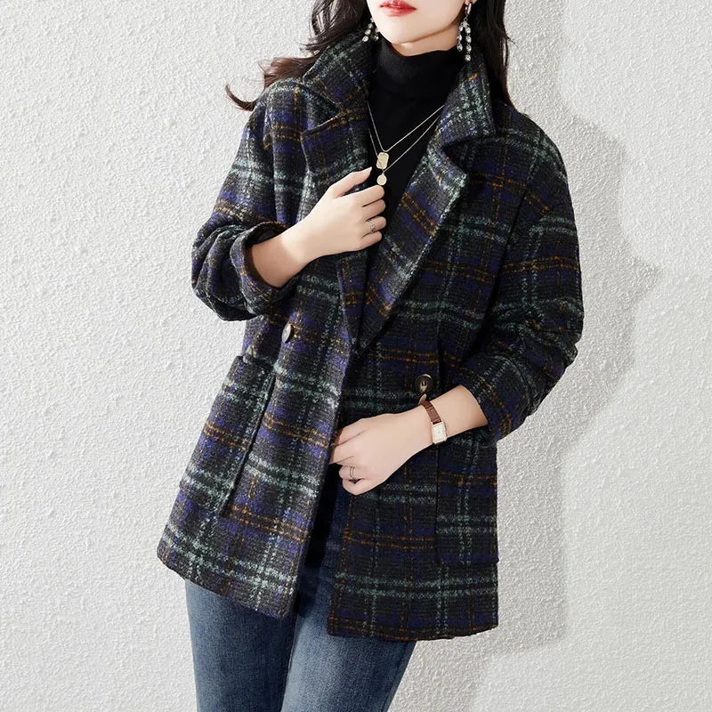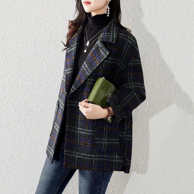 봄과 가을 새로운 패션 한국 느슨한 슬림 기질 코트 여성 조커 정장 칼라 체크 무늬 안감 얇은 모직 코트 Tid