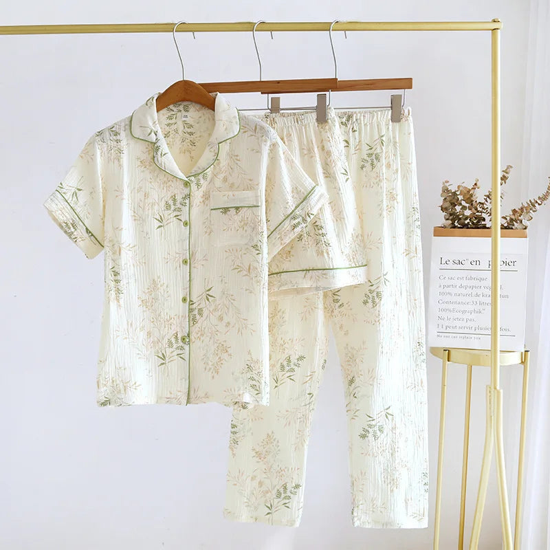 봄/여름 얇은 코튼 더블 거즈 파자마 여성 반팔 상의 + 반바지 + 바지 크레이프 3피스 홈 서비스 슈트