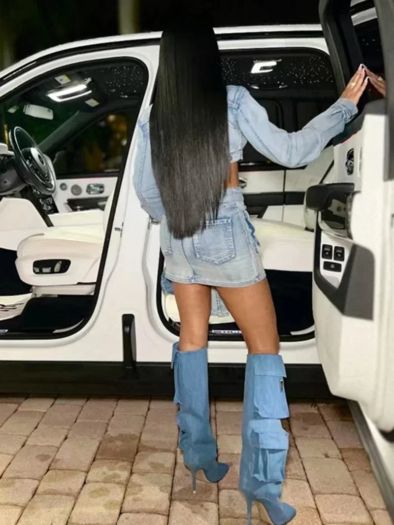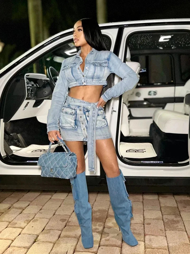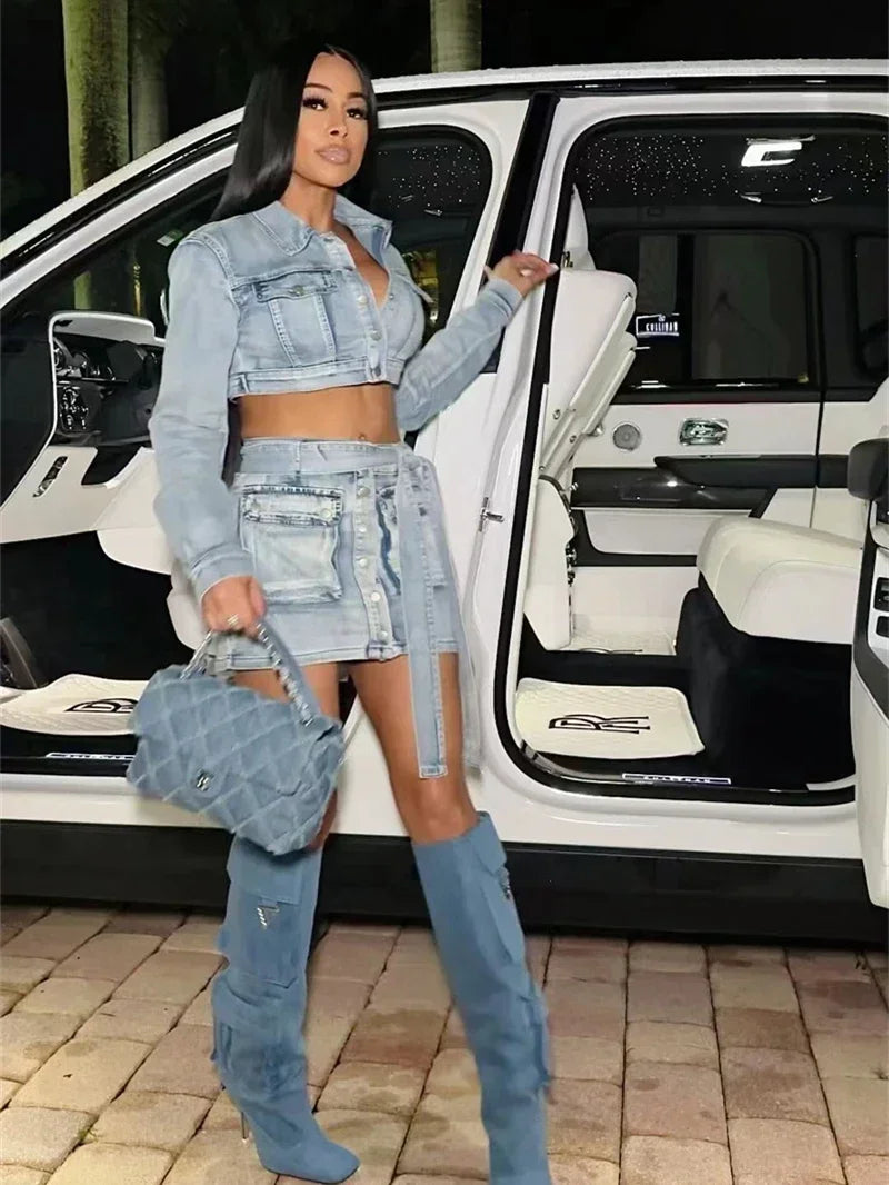 스트리트웨어 2피스 세트 여성복 가을 옷 2024 여성 청바지 재킷 크롭탑 스커트 세트 패션 데님 드레스 세트 여성 세트
