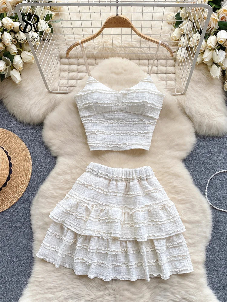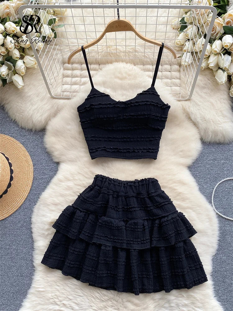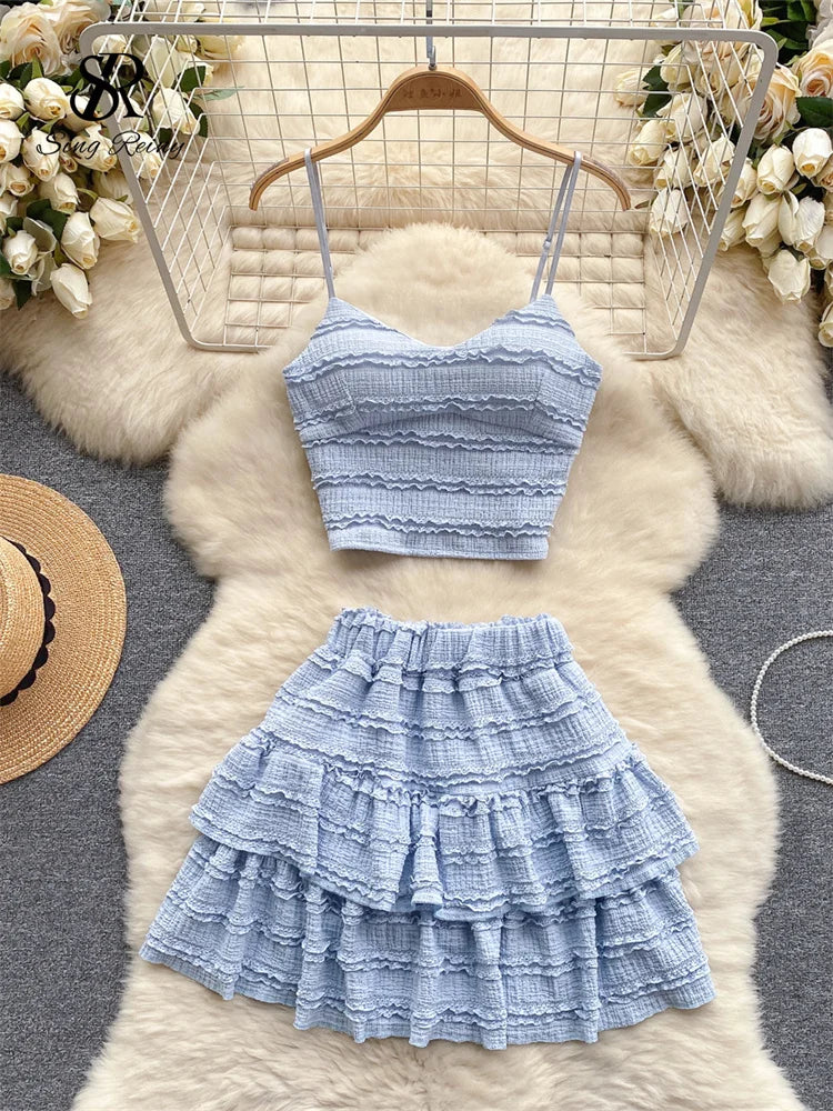 달콤한 러칭 투피스 세트 V넥 스트랩 크롭 탑+짧은 플리츠 스커트 여성 한국 스타일 시크 여름 비치웨어 정장